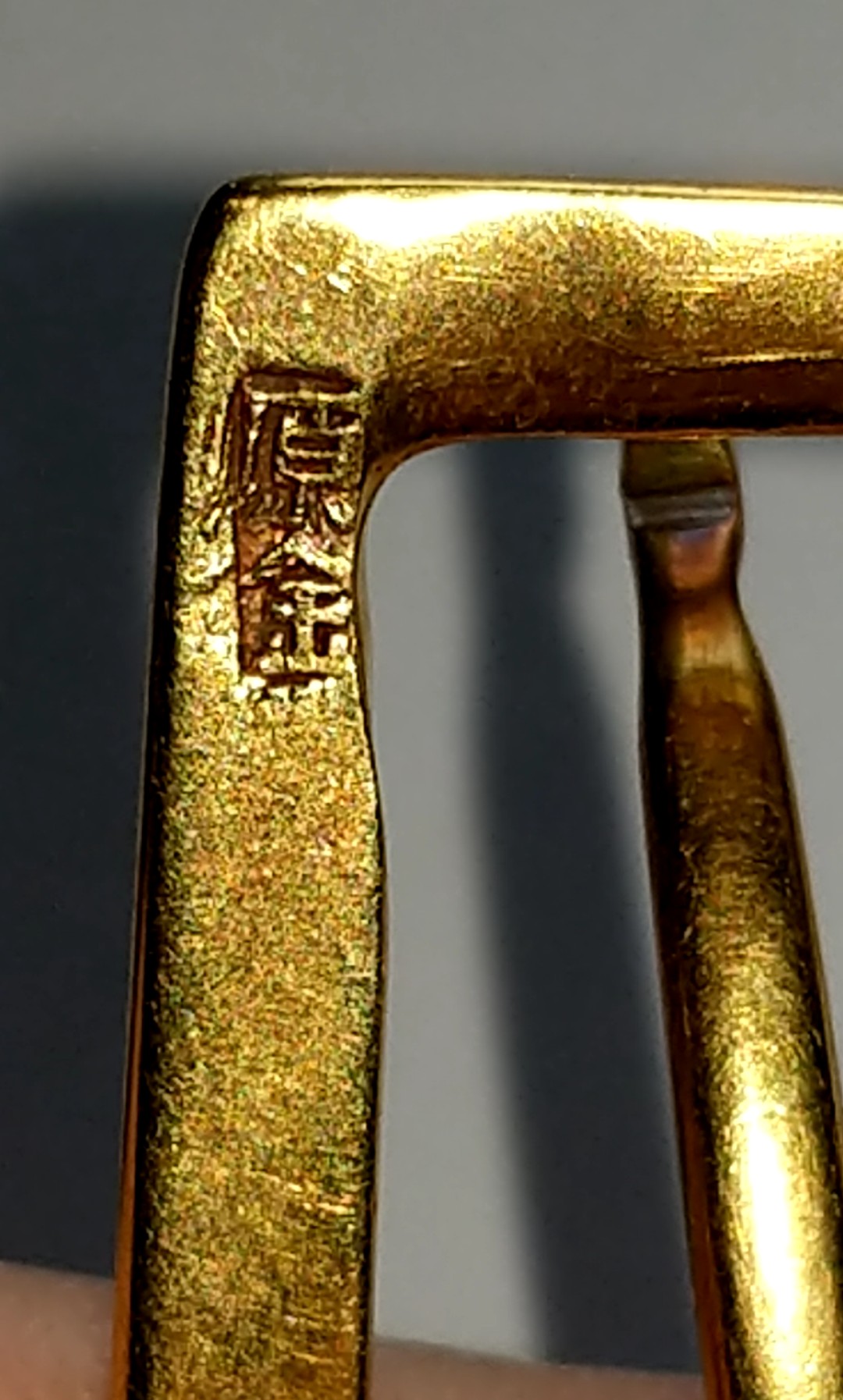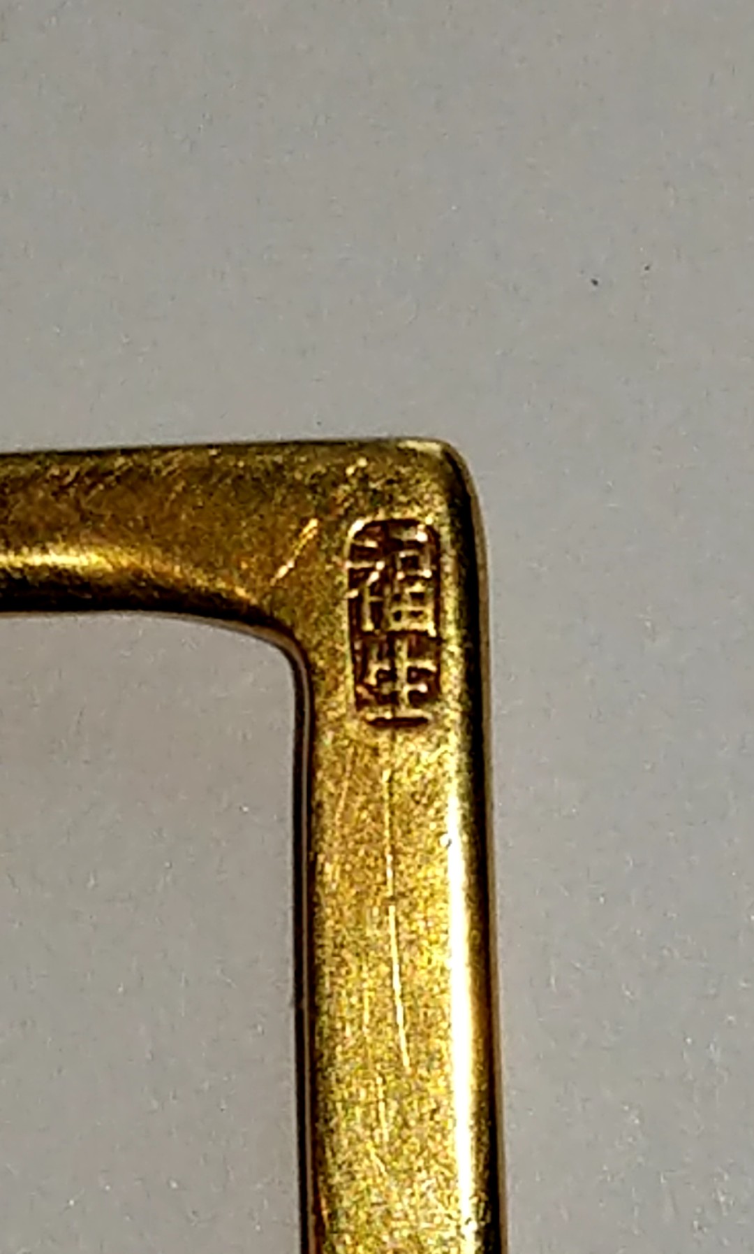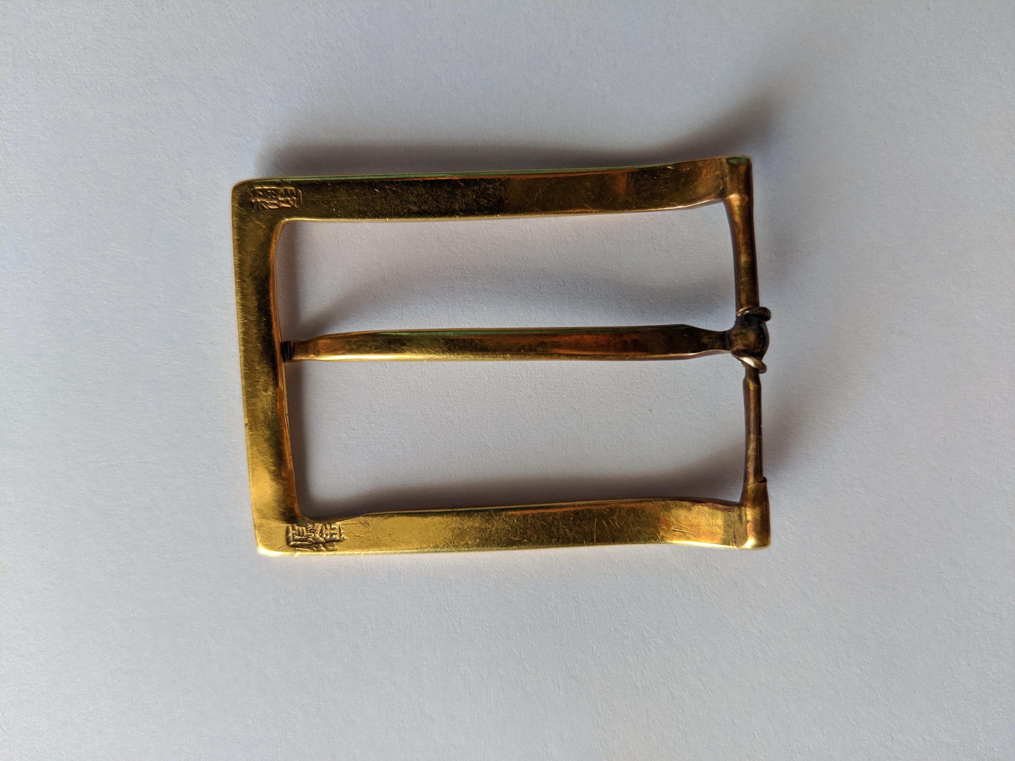 ·So I inherited this belt buckle, which I have utterly no information on, other than it is obviously hand made, appears to be mostly solid gold of unknown carat, and is stamped on the back with two Kanji cartouches that I've not been able to identify. It weighs exactly 20.0G total. I am guessing that it is Japanese, but I do not know for certain, and it could be Chinese too.