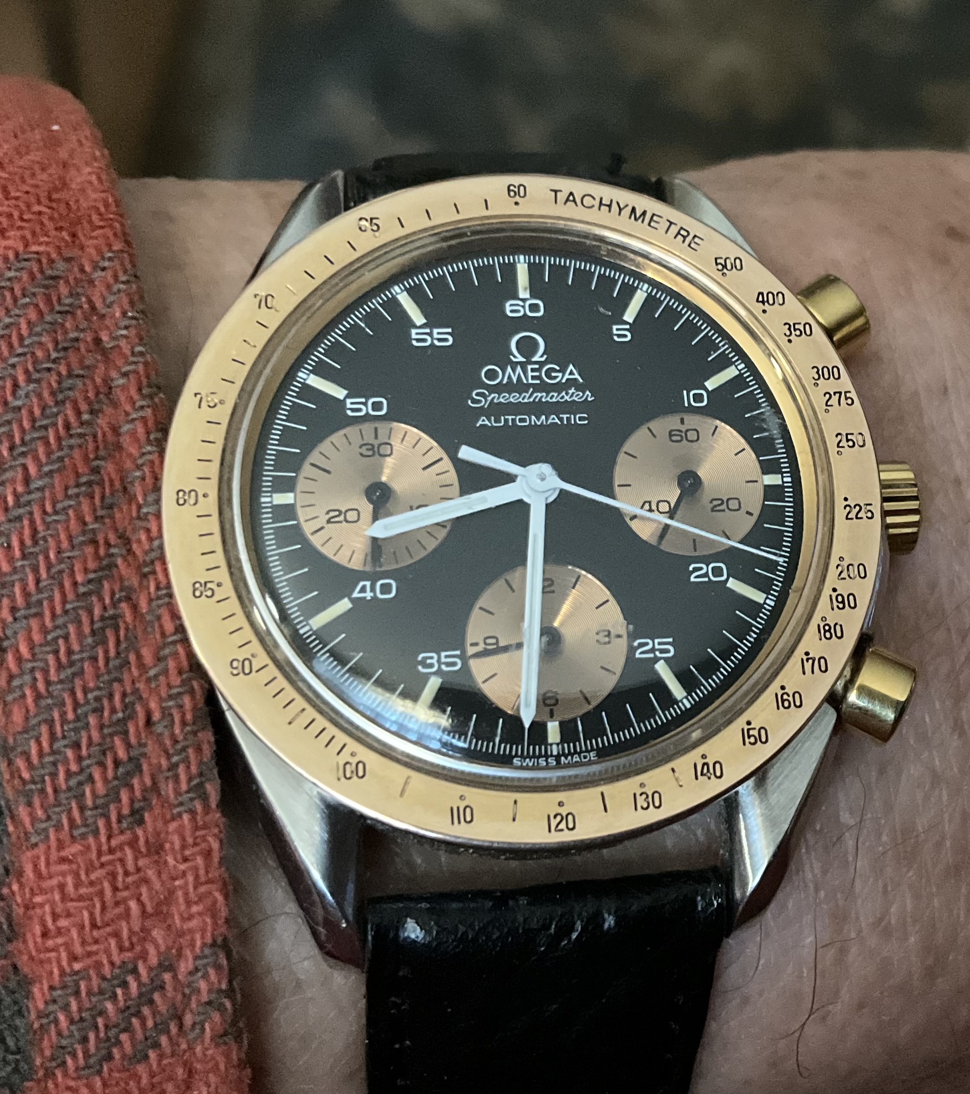 The bezel would be solid 18k gold, but the pushers and crown are plated gold. Someone has installed pushers and crown for the stainless versions of the watch on the one you show in the first post. Omega didn't make a watch like this with a gold bezel and steel pushers/crown that I am aware of so this has been modified.
