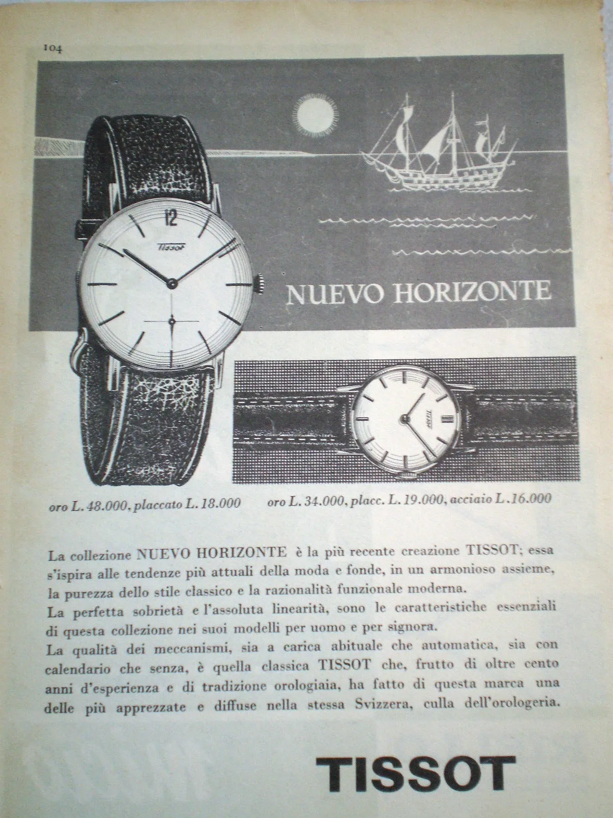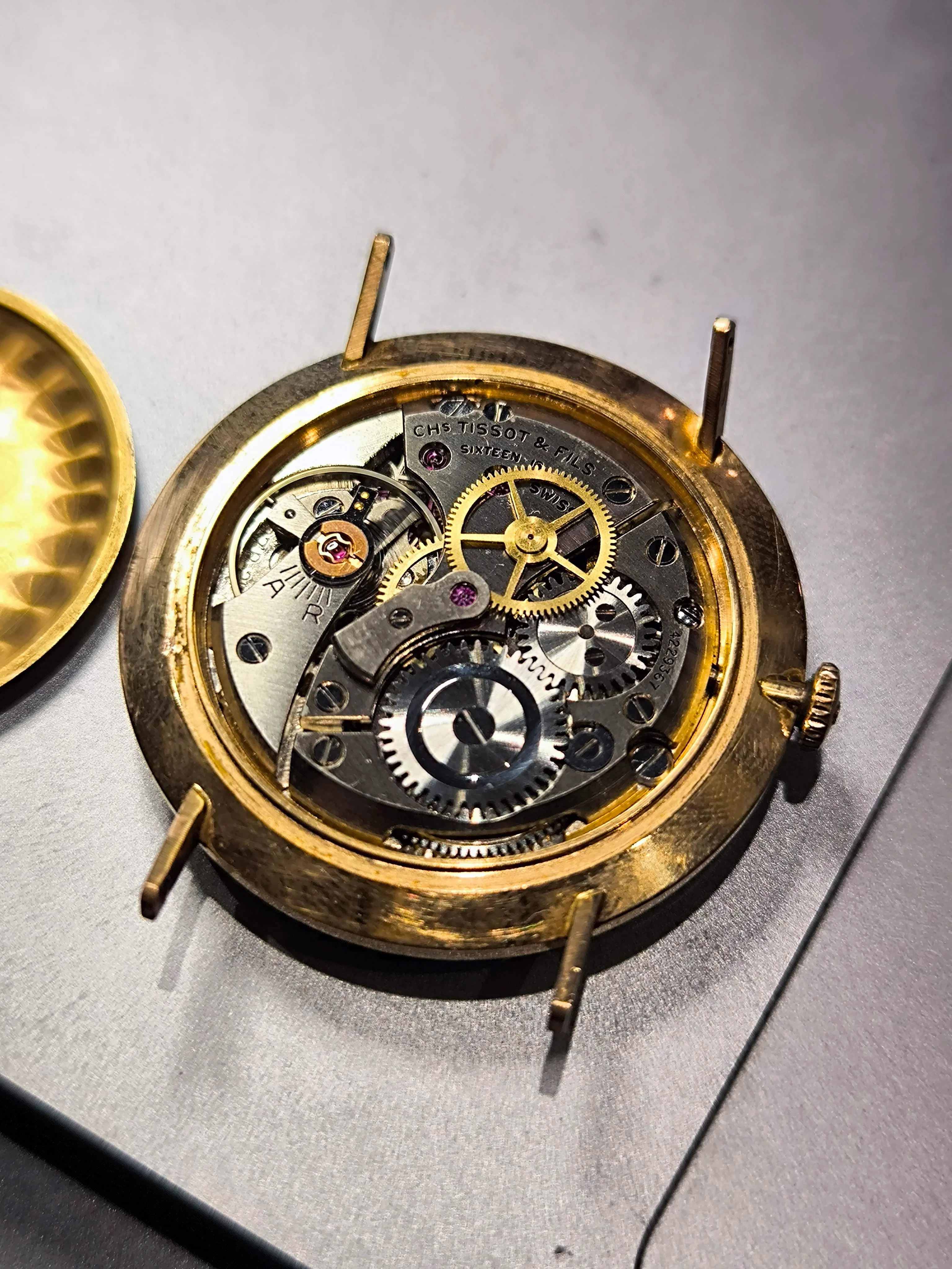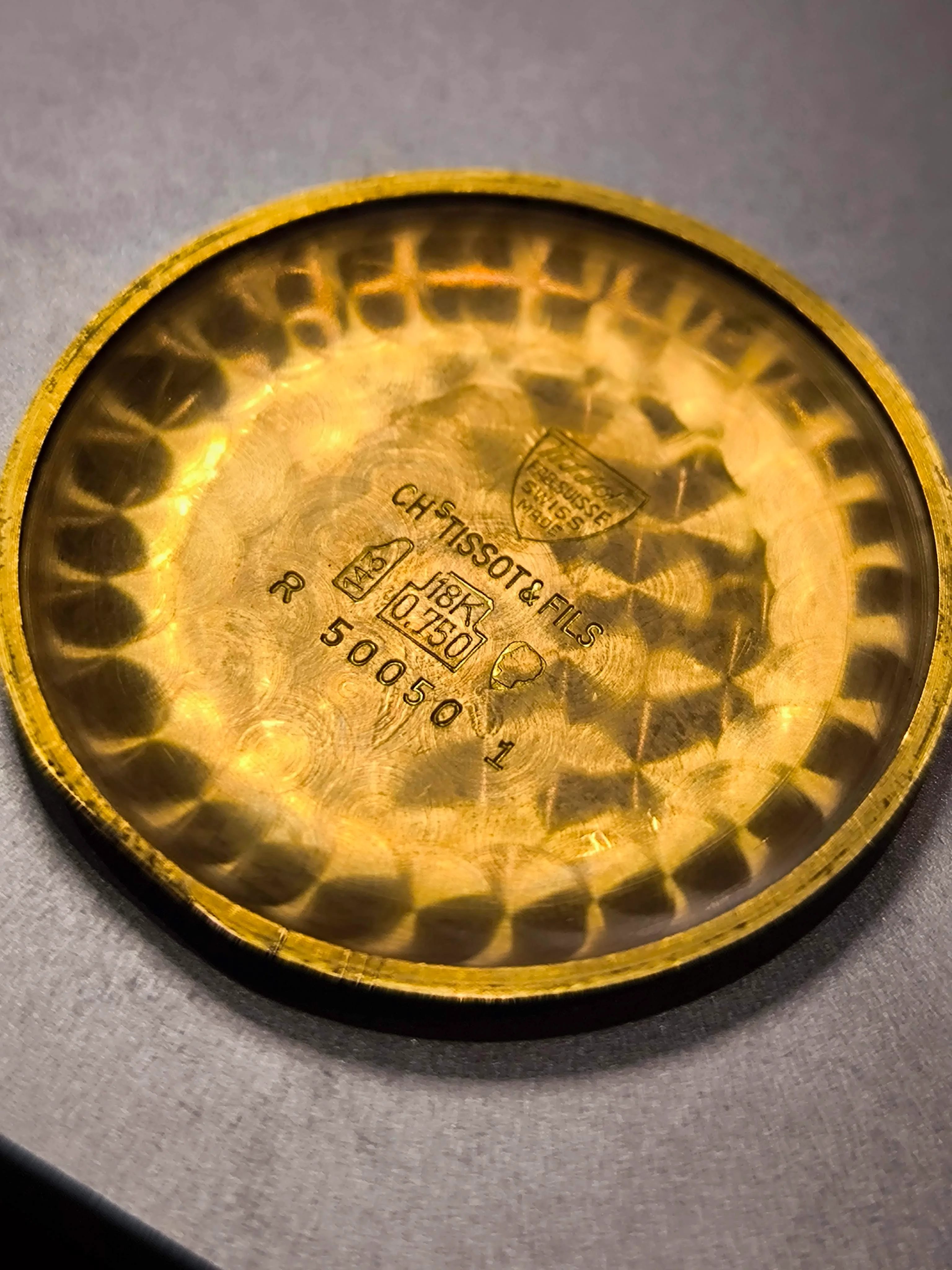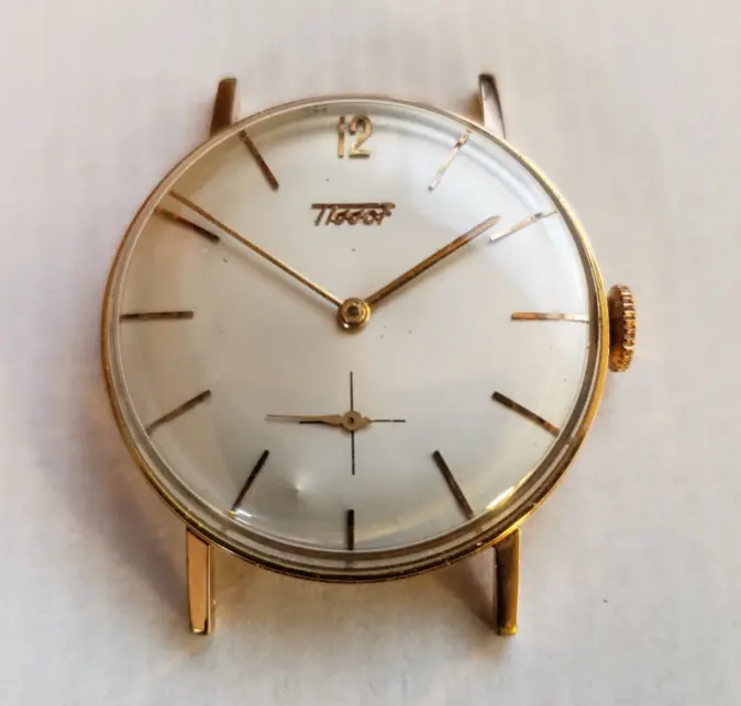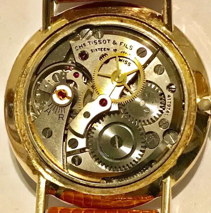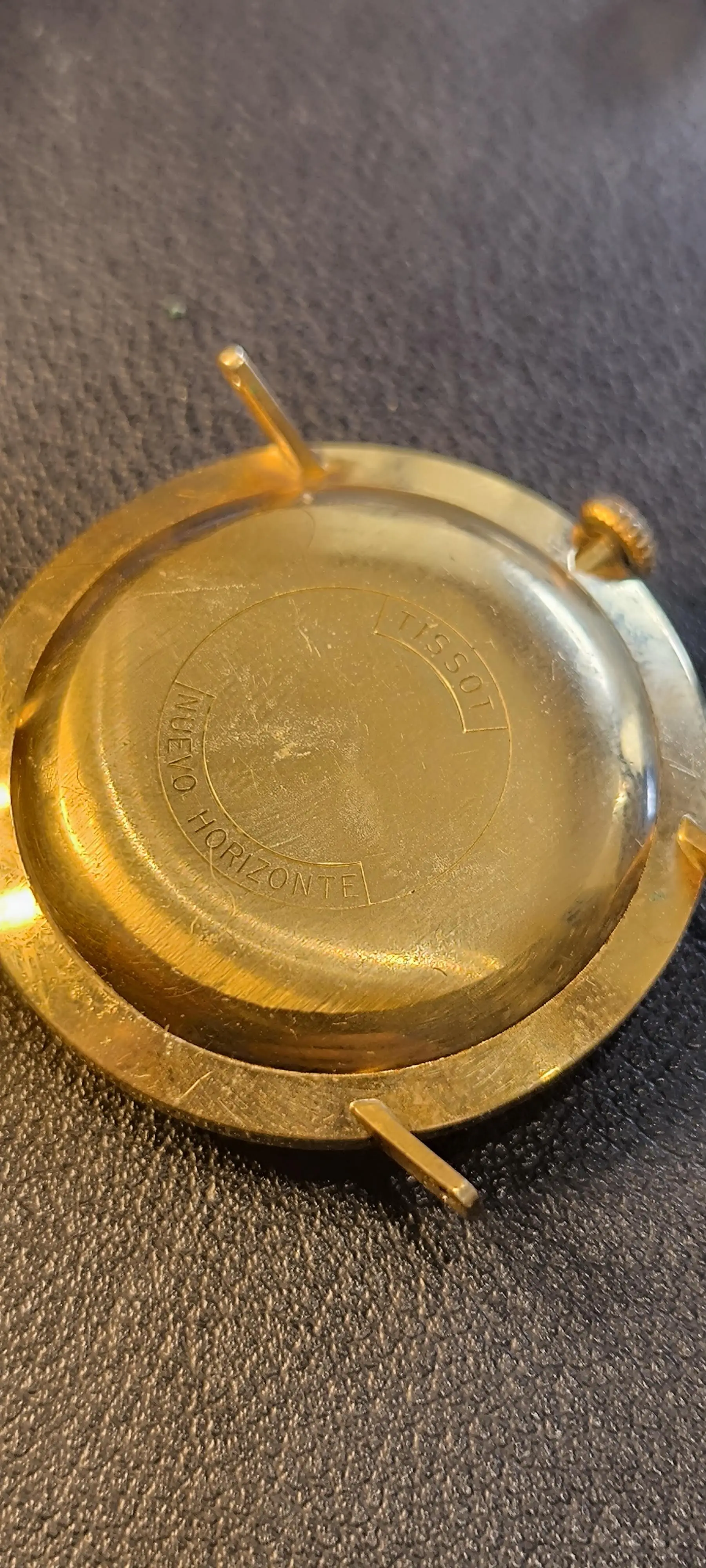 It’s a thin gold-tone case, with only “Tissot” and Nuevo Horizonte visible on the caseback. I can’t see clear screw-back notches, so I’m unsure whether it’s a snap-back or a front-loader.