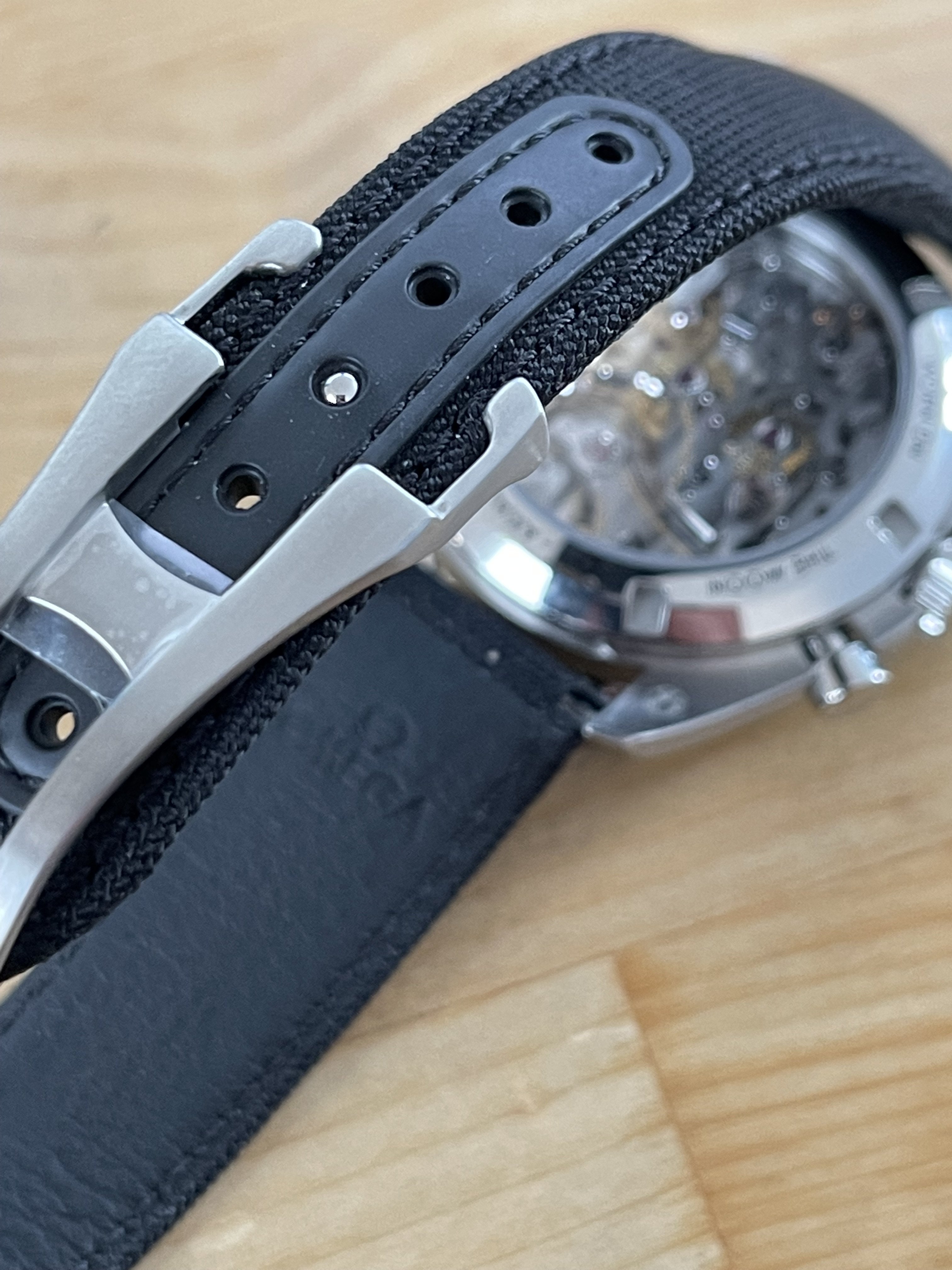 Hi, I saw it in person. Ofc I bought a bracelet but the nylon strap was pretty nice. Yes it comes with a genuine depolyant SS buckle. I think Omega website sells it for $250