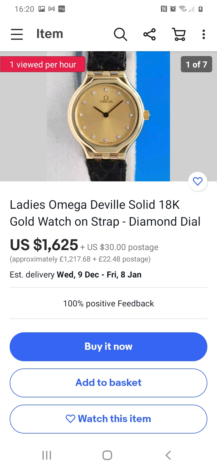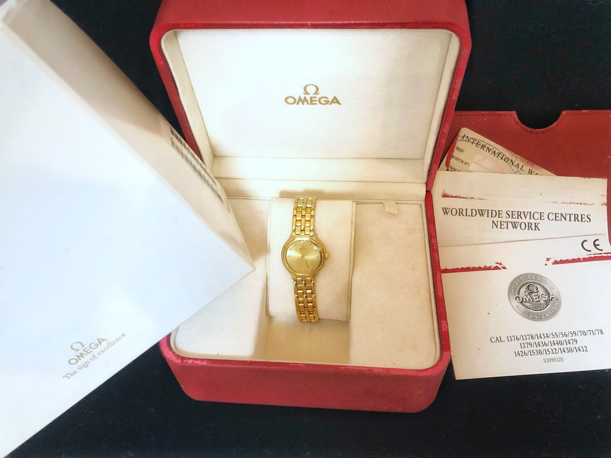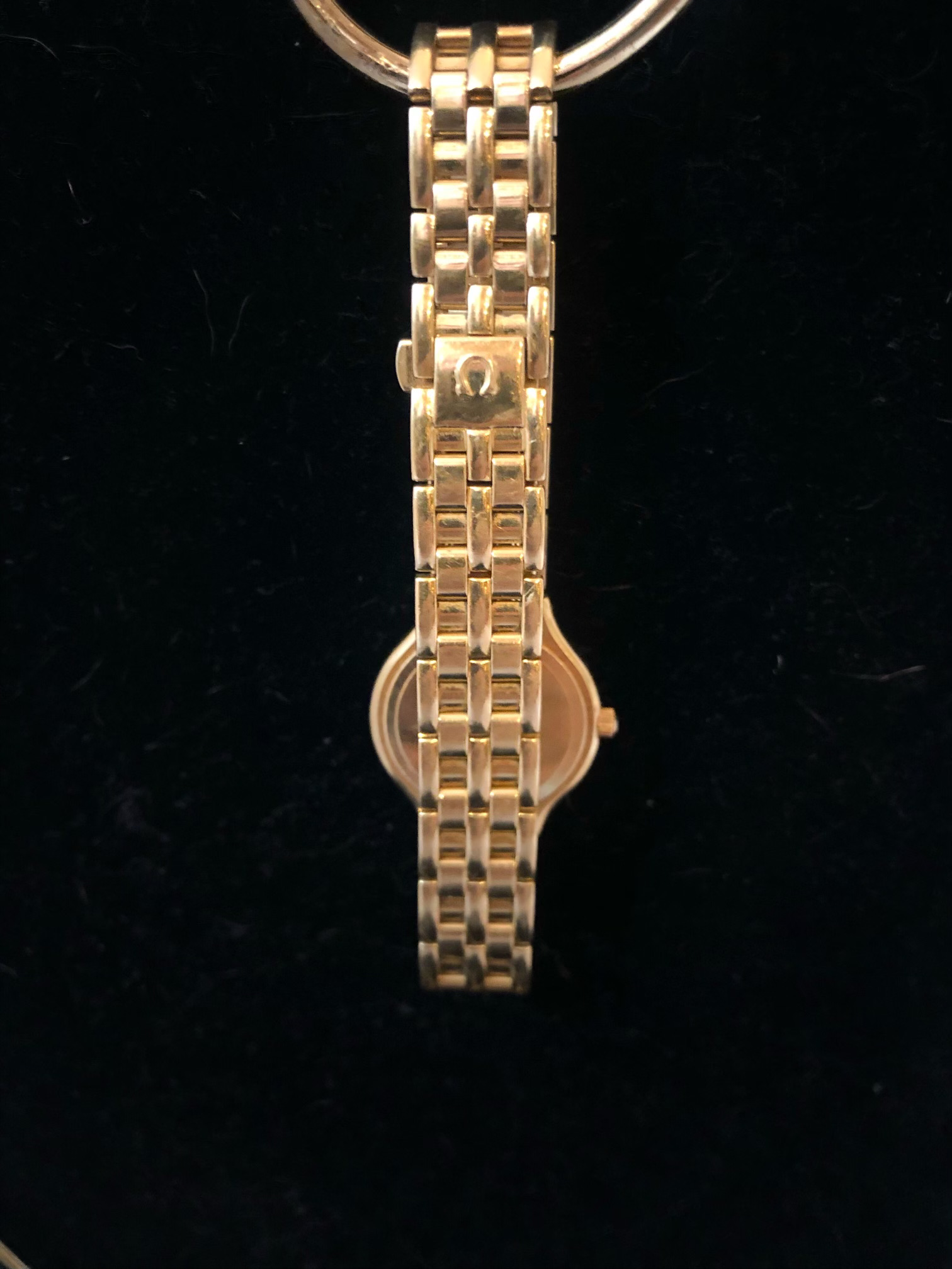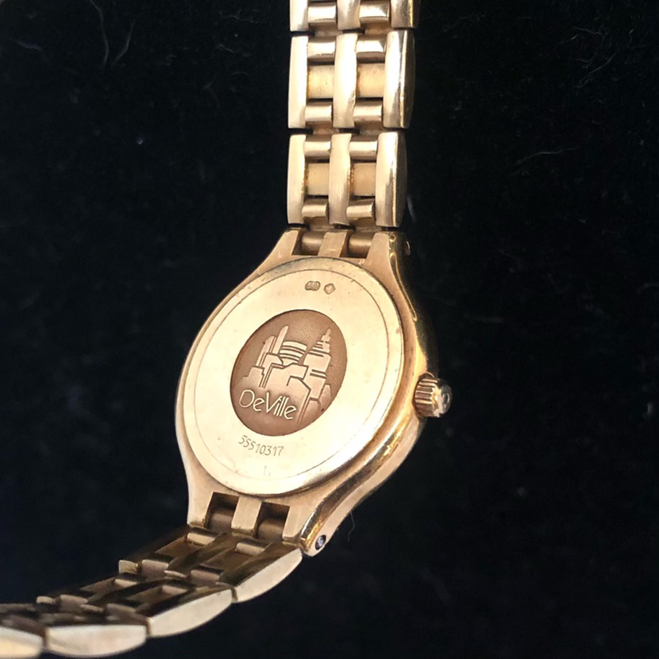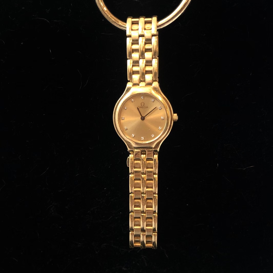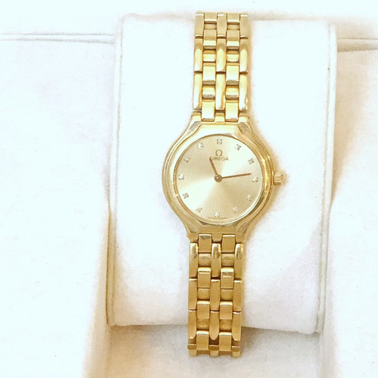 ·I am about to take this Ladies 18k Gold Deville to a jeweler to pop the back off to get more identification information. Watch is working. What we know from the paperwork and box: My wife ordered and purchased in 1998 from a jeweler in Ohio. No longer in business. According to other information we have found the Serial is 55510317, which indicates its a 1995 model (There is another number above the serial on the box with a barcode 041601500). However, when researching on the web, including the Omega Vintage section of their site, we cannot find another watch that has this exact combination. We either find one that has diamonds also around the bezel or it has diamond indicators like ours, but is gold and stainless, not all gold. We are wanting to get some more information and determine approximate value before putting back into our deposit box for our kids. It is a beautiful watch, but does show some scratches on the bracelet and case. I am just curious if anyone has seen this combination before?
