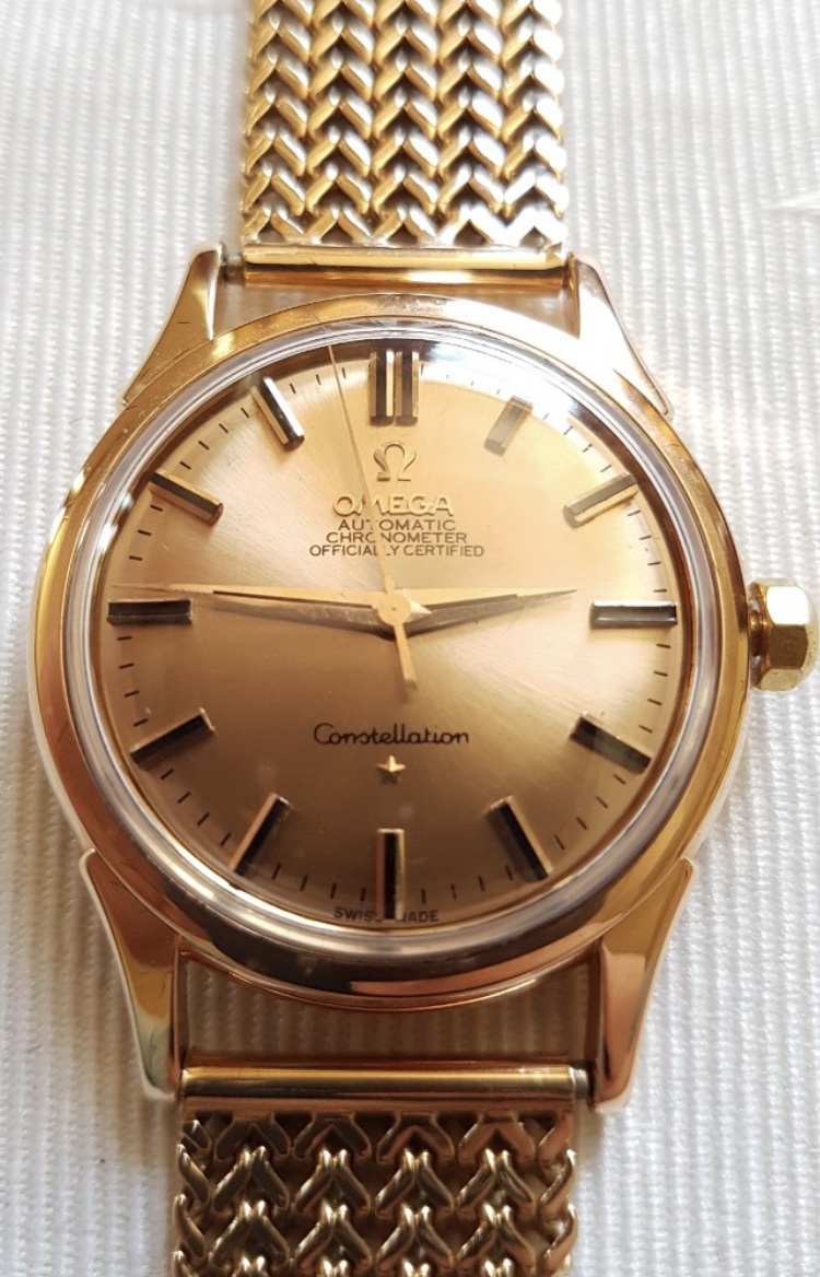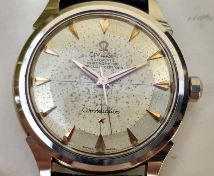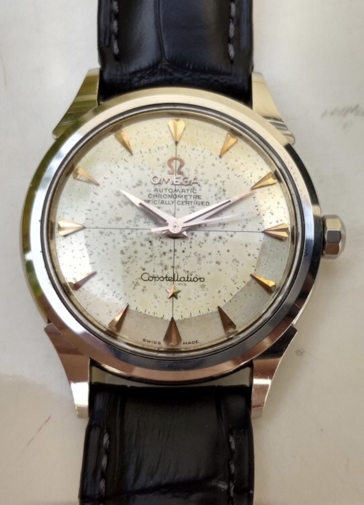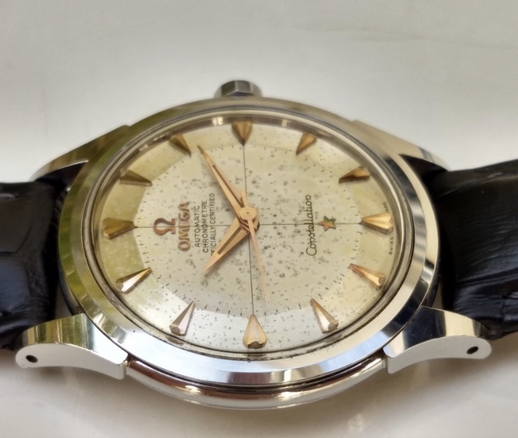 There is a second script font for later Constellation's with that style "n". I think that dial came from a later Connie (cal. 7xx)and was swapped into that watch at some point. The 1st watch has a sharp case and nice bevel still in the bezel, but the dial has the measels. The 2nd watch's case has been polished and I believe the wrong dial for that case.