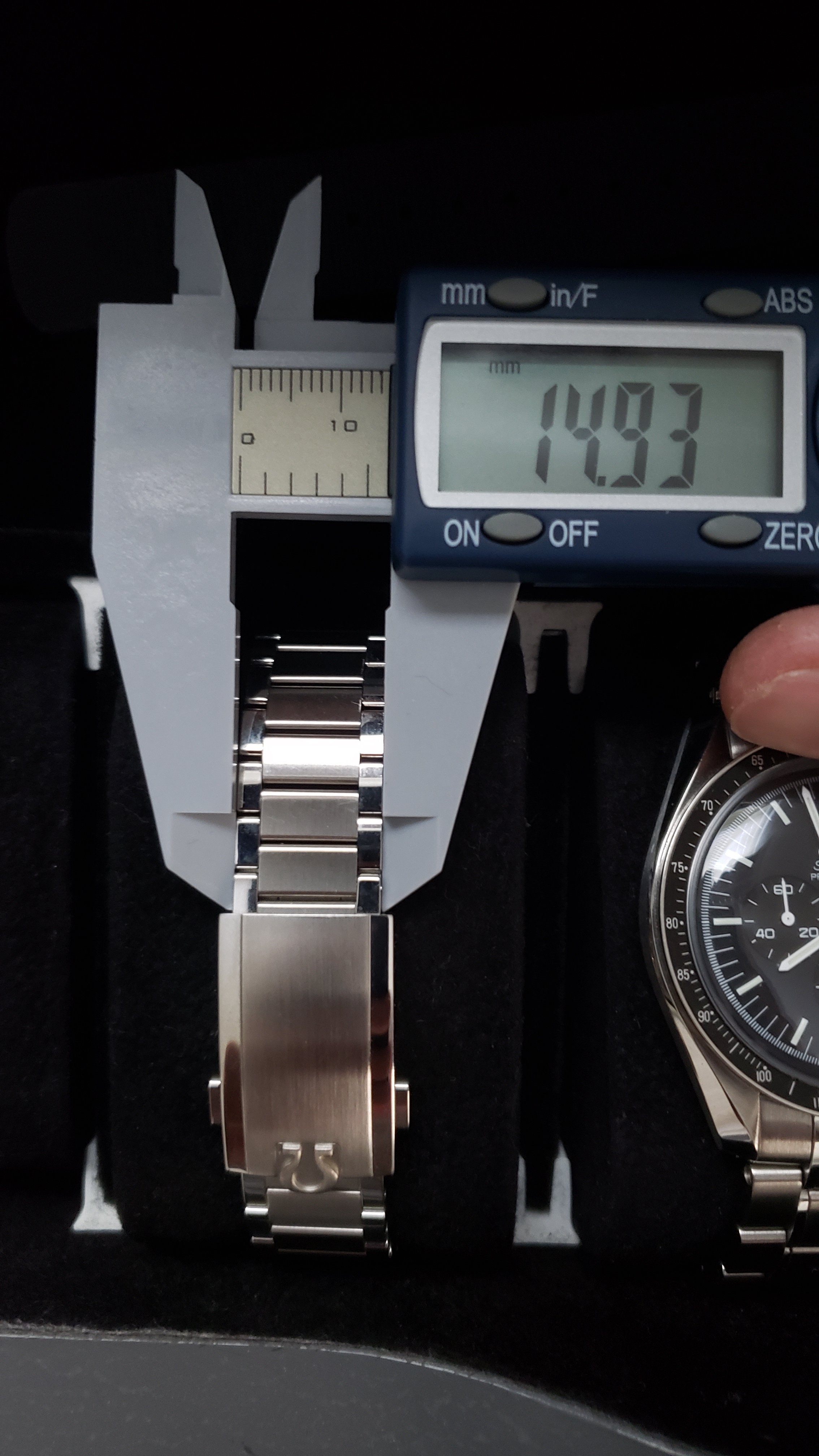 What is the width of the 50th anniversary Speedmaster 130STZ011629 bracelet at the clasp? Does it taper down from 20mm to 16mm?