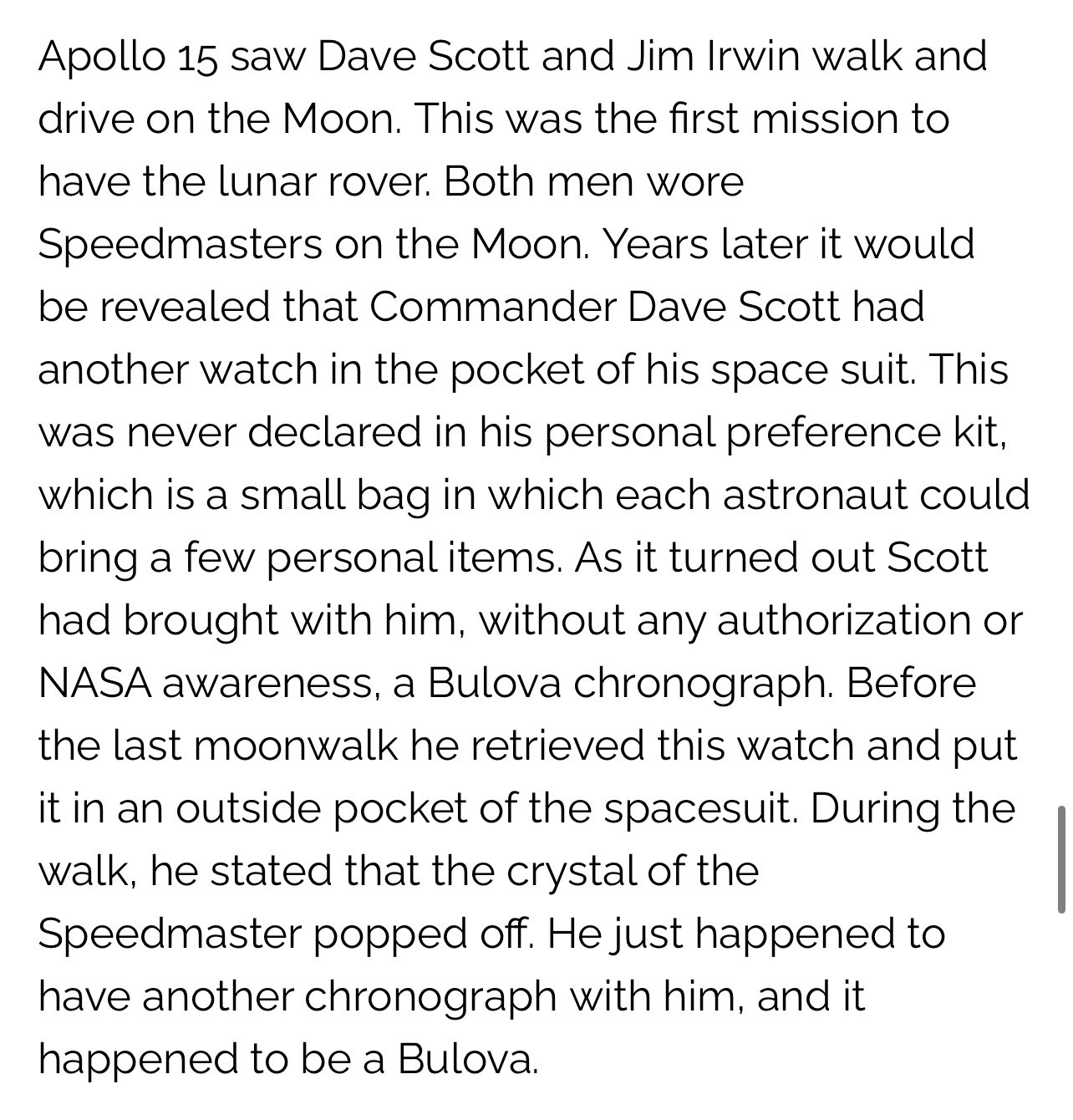 He subsequently wore it on the lunar surface during the third EVA, claiming that the crystal on his issued Speedy had popped off during the second EVA. This Bulova watch was auctioned off for $1.6mil a few years ago. I