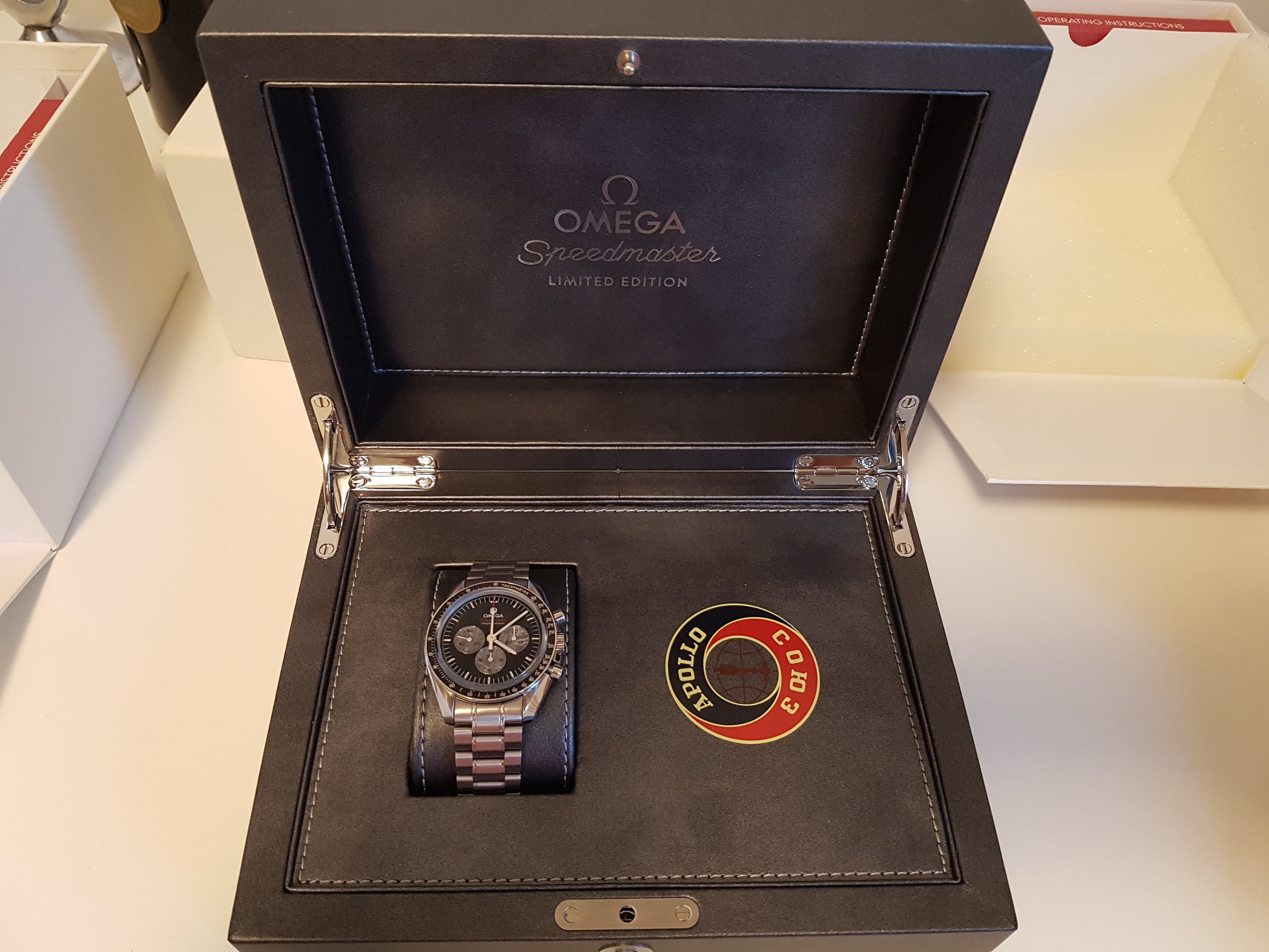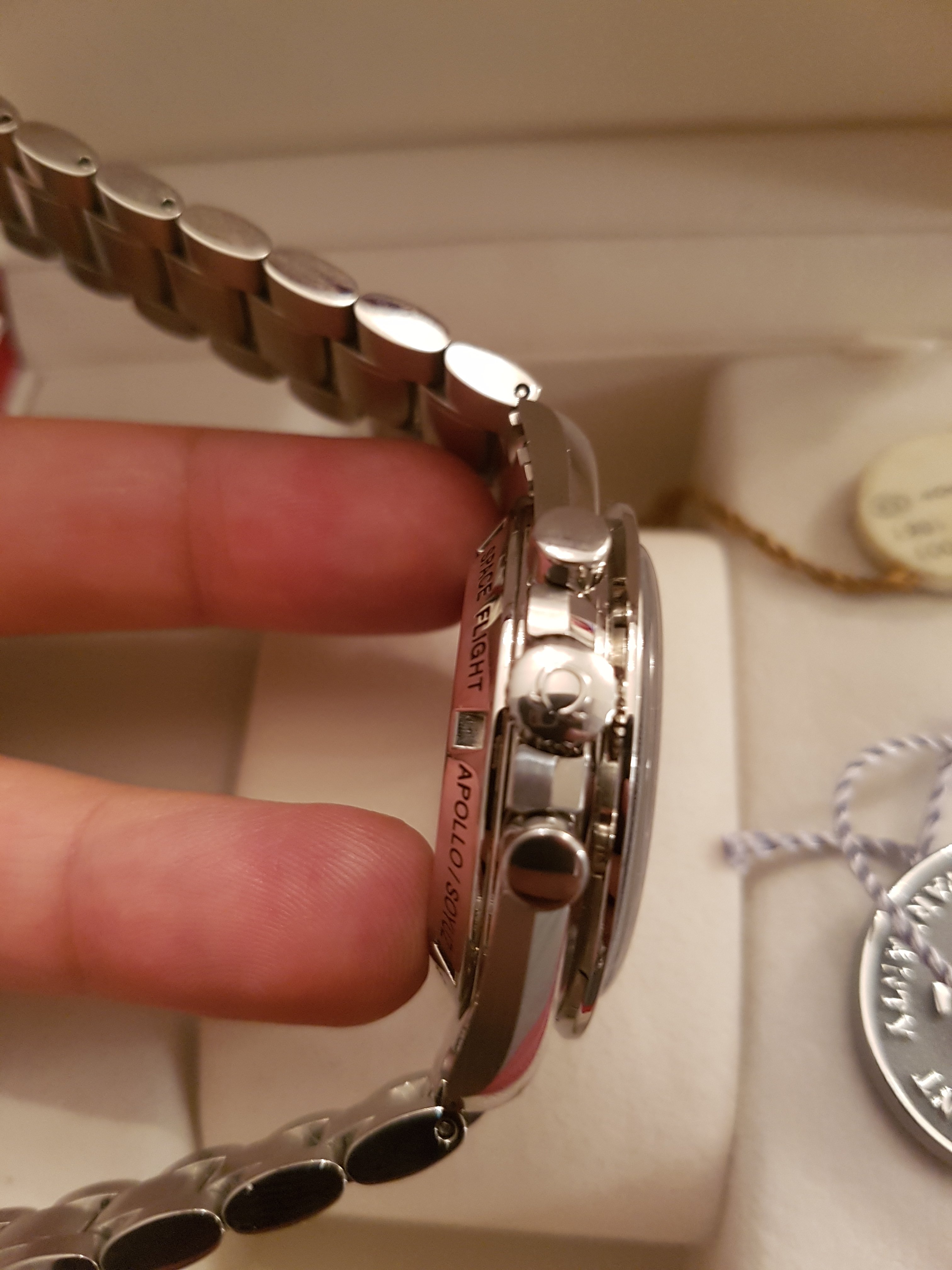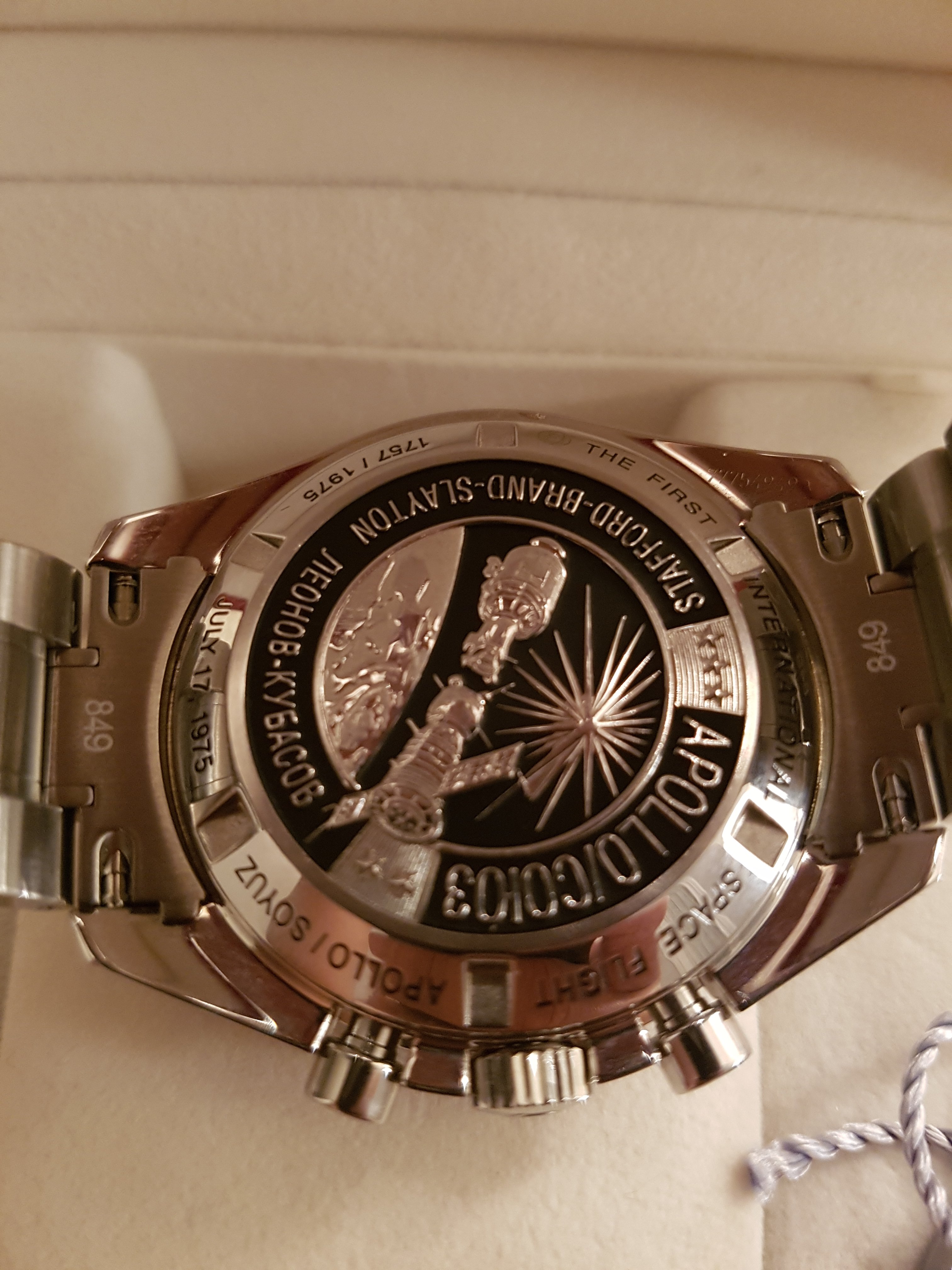 Congrats on the new watch. I picked up a new Apollo Soyuz with the original box and papers this past May from the San Diego OB. I then took it to Spacefest and got astronaut Vance Brand who flew on Apollo Soyuz to sign the box and hold the watch. I love the meteorite dial and the back of the watch which has the Apollo Soyuz design created by space artist Robert McCall. Wear the watch with Omega Pride. Awesome watch.