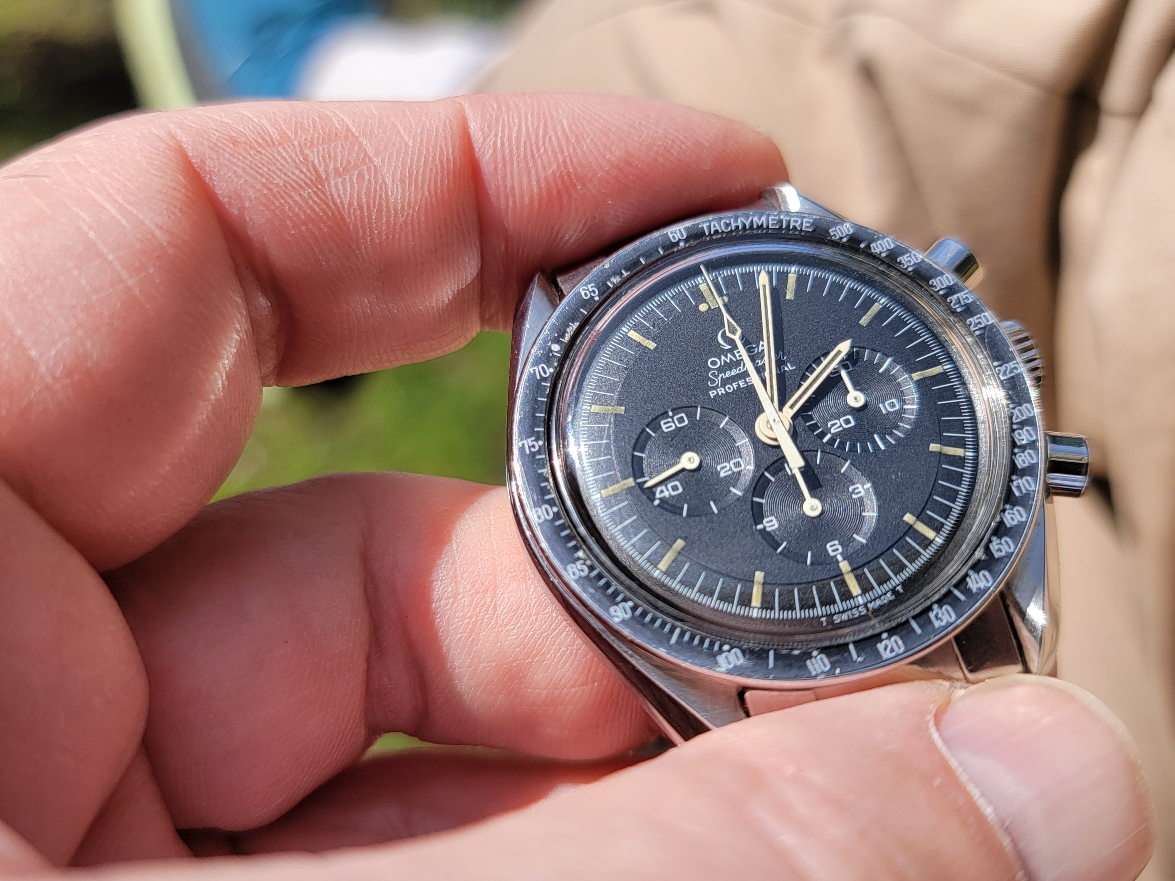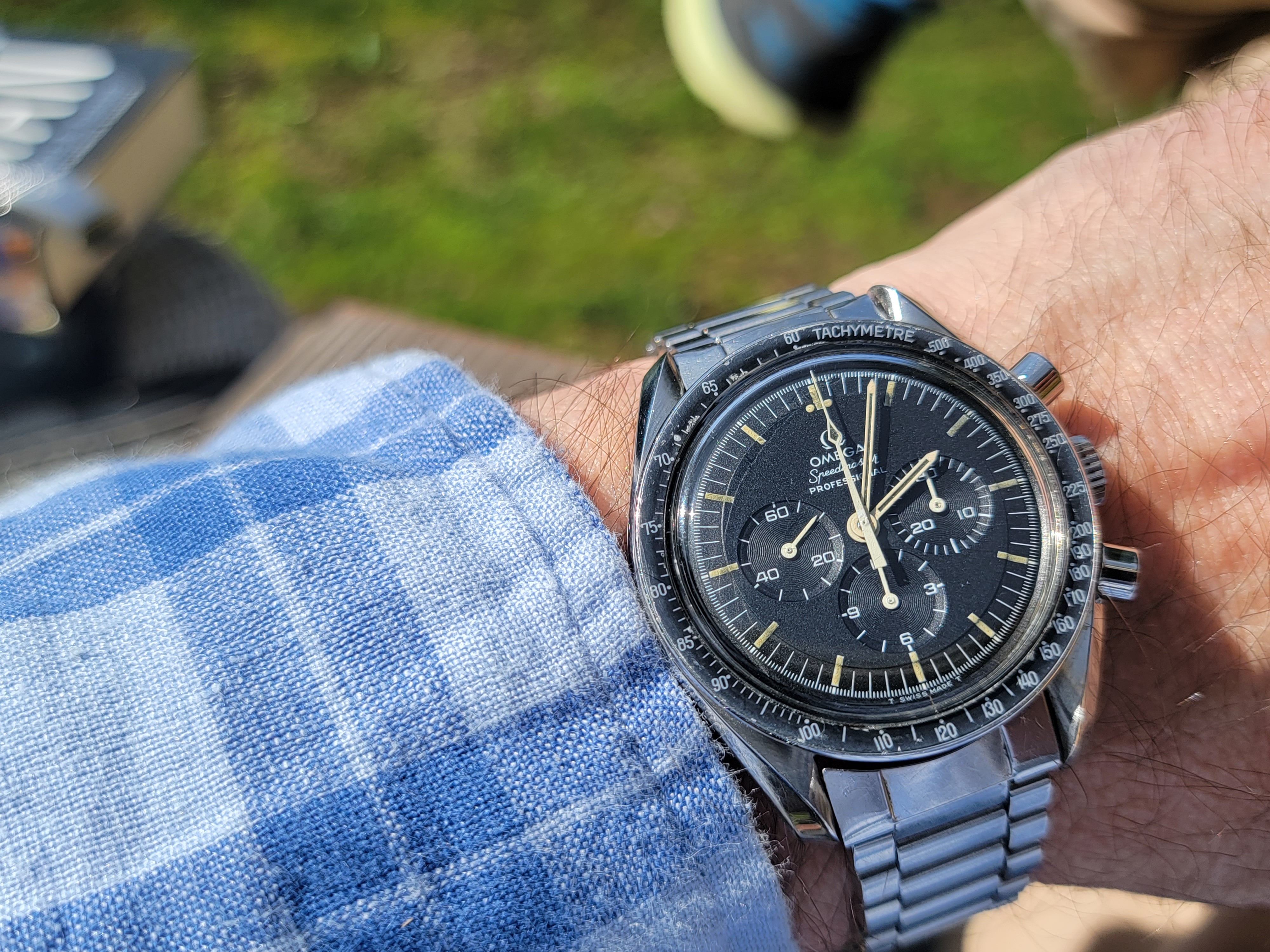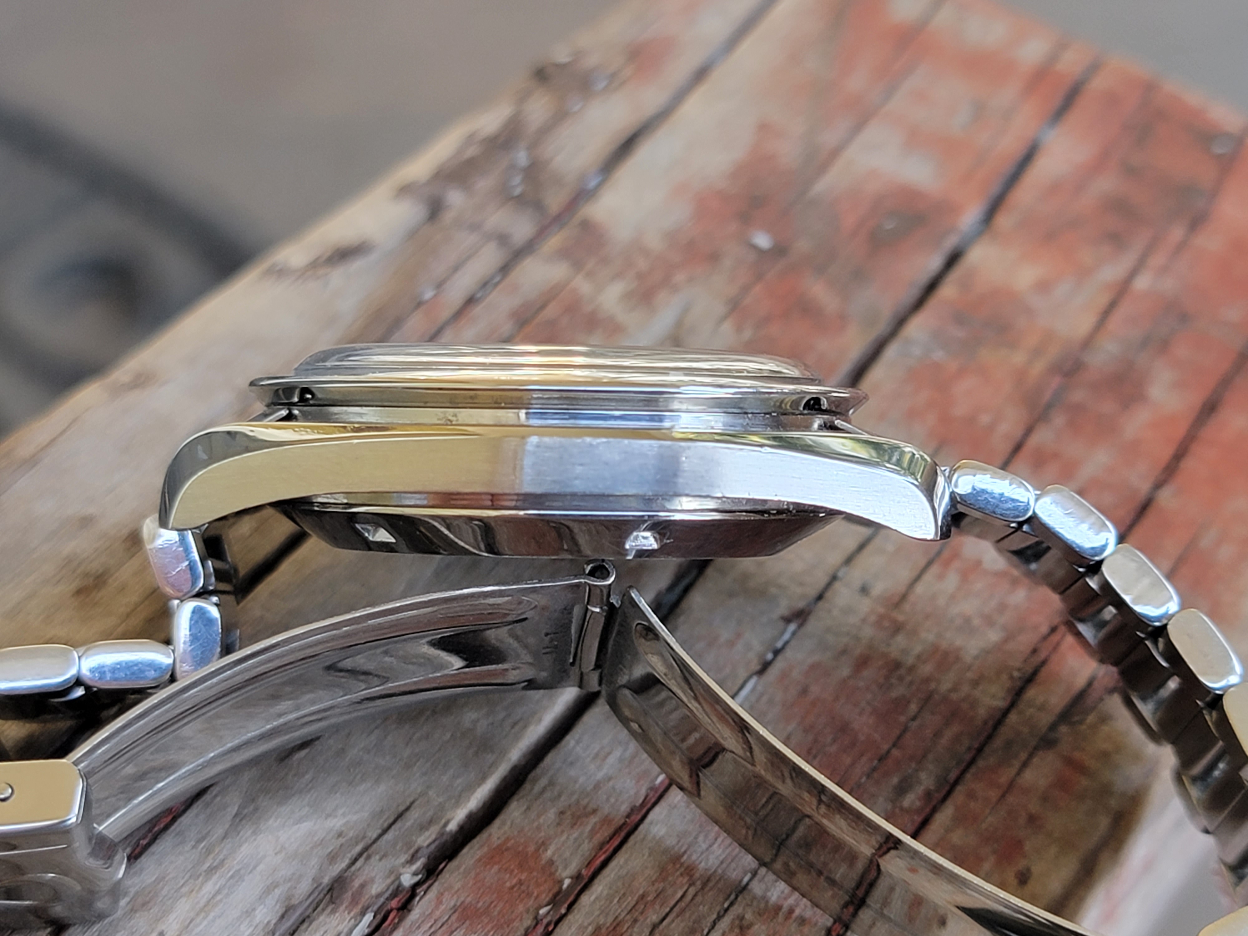It's difficult for me to get lifelike photos. For contrast, I placed it next to my 145.022-68 that has a beautiful, dark dial with manilla lume. In the auction listing, the dial was washed out, the lume was dirty with a hint of green and the hands' lume was black. But in person, the dial, hands and lume have a tobacco color that pops in the sunlight. The dial is difficult to describe. It's not gray or brown, but it's not black either. The lume on the hands looks dark out of the light but has a deep chocolate color in the light. And the bezel has a nice fading around the outer edge without any scratches that would make it seem forced. The case is okay, no gouges or nicks, but it's polished. I would have loved to have seen it before a watchmaker tried to pretty it up, but that's how it is.