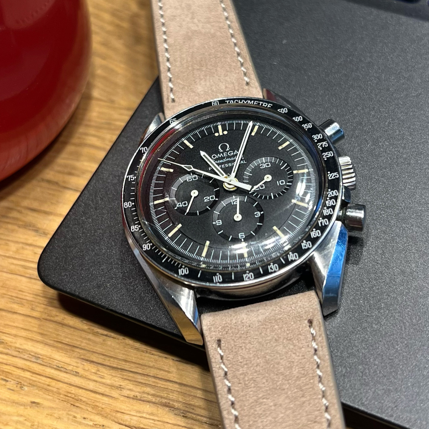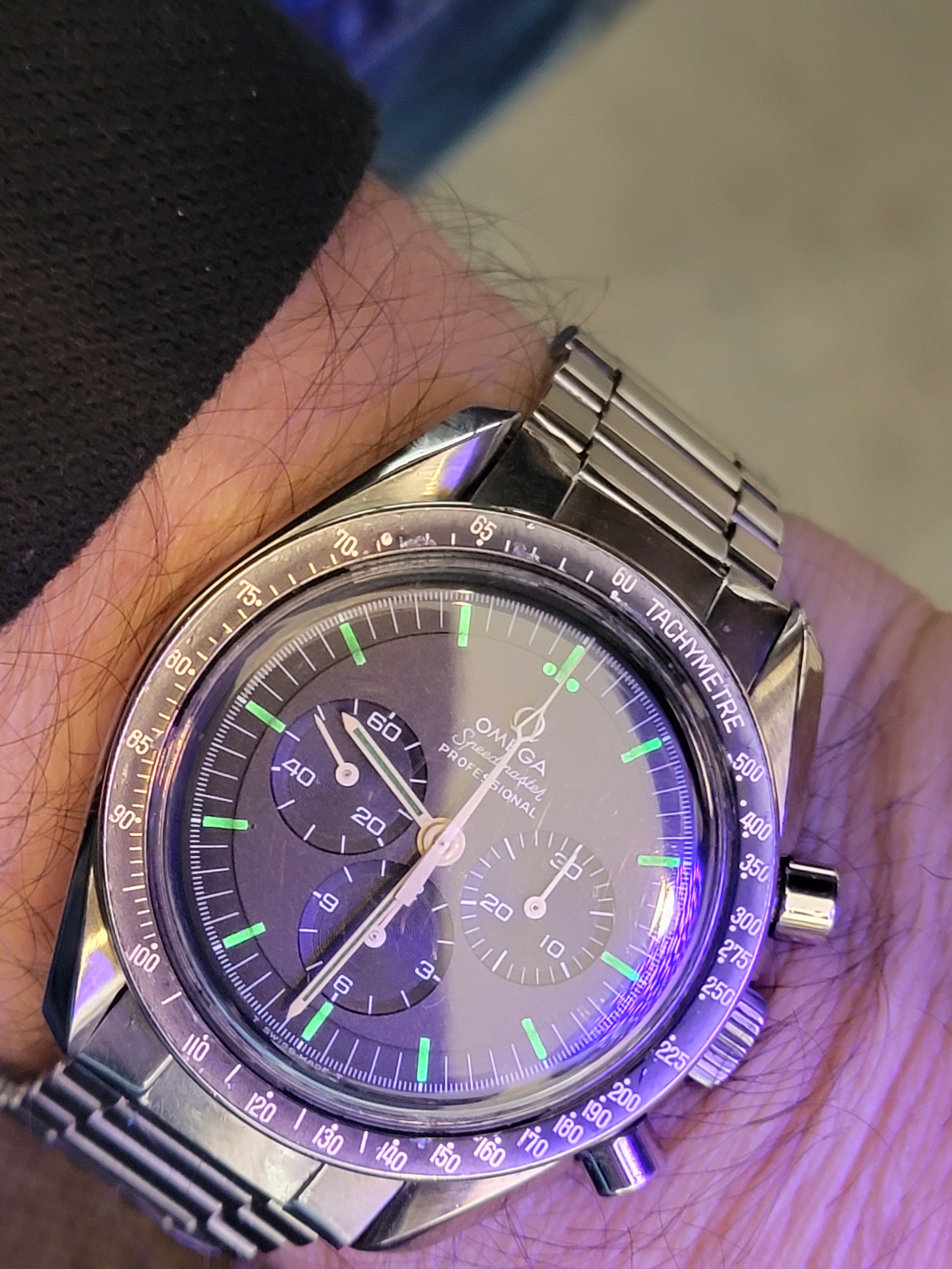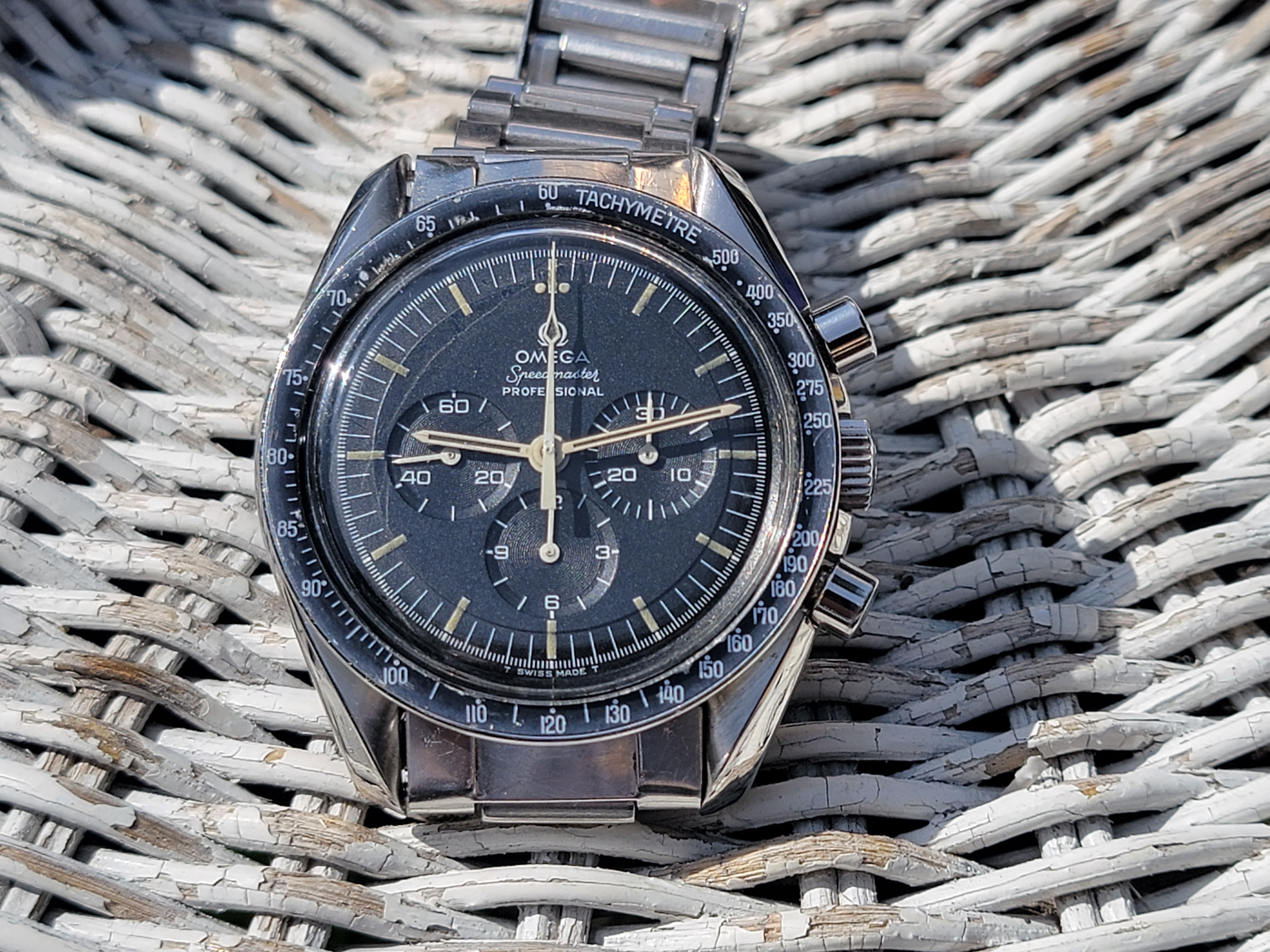 It's difficult for me to get lifelike photos. For contrast, I placed it next to my 145.022-68 that has a beautiful, dark dial with manilla lume. In the auction listing, the dial was washed out, the lume was dirty with a hint of green and the hands' lume was black. But in person, the dial, hands and lume have a tobacco color that pops in the sunlight. The dial is difficult to describe. It's not gray or brown, but it's not black either. The lume on the hands looks dark out of the light but has a deep chocolate color in the light. And the bezel has a nice fading around the outer edge without any scratches that would make it seem forced. The case is okay, no gouges or nicks, but it's polished. I would have loved to have seen it before a watchmaker tried to pretty it up, but that's how it is.