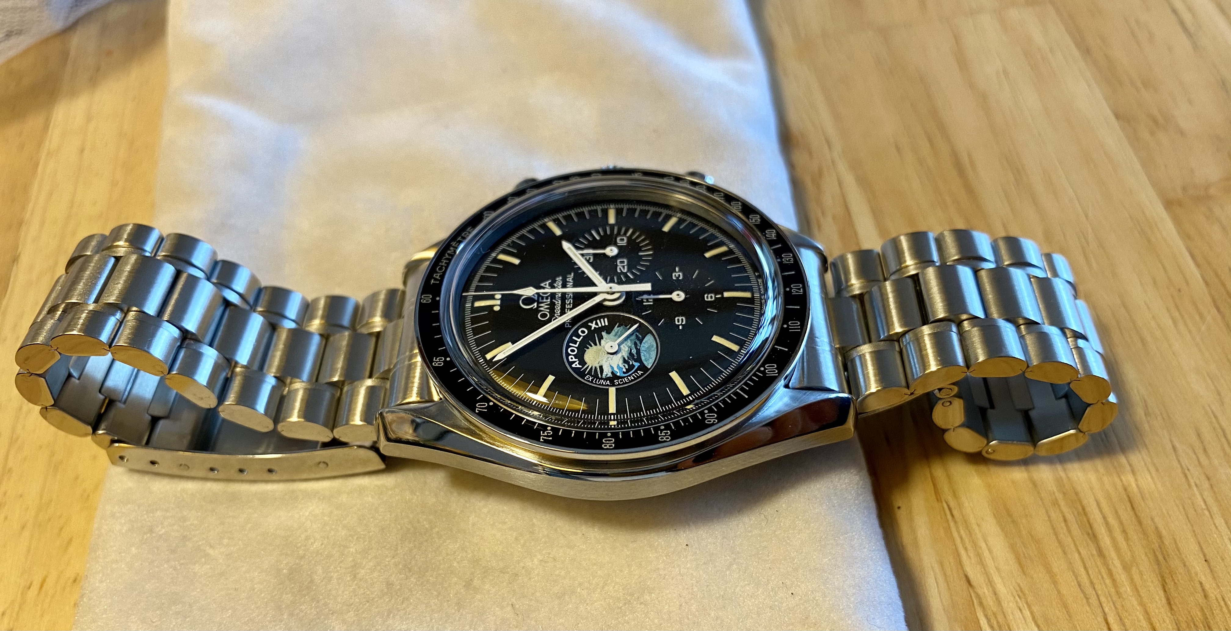 ·I found a local seller with a 3595.52.00 Apollo XII 25th Anniversary patch. It is completely authentic. Has all the papers/box/ etc. Except there is one thing I noticed. The dial is not tritium and instead of “T Swiss Made T” it just says “Swiss Made”.