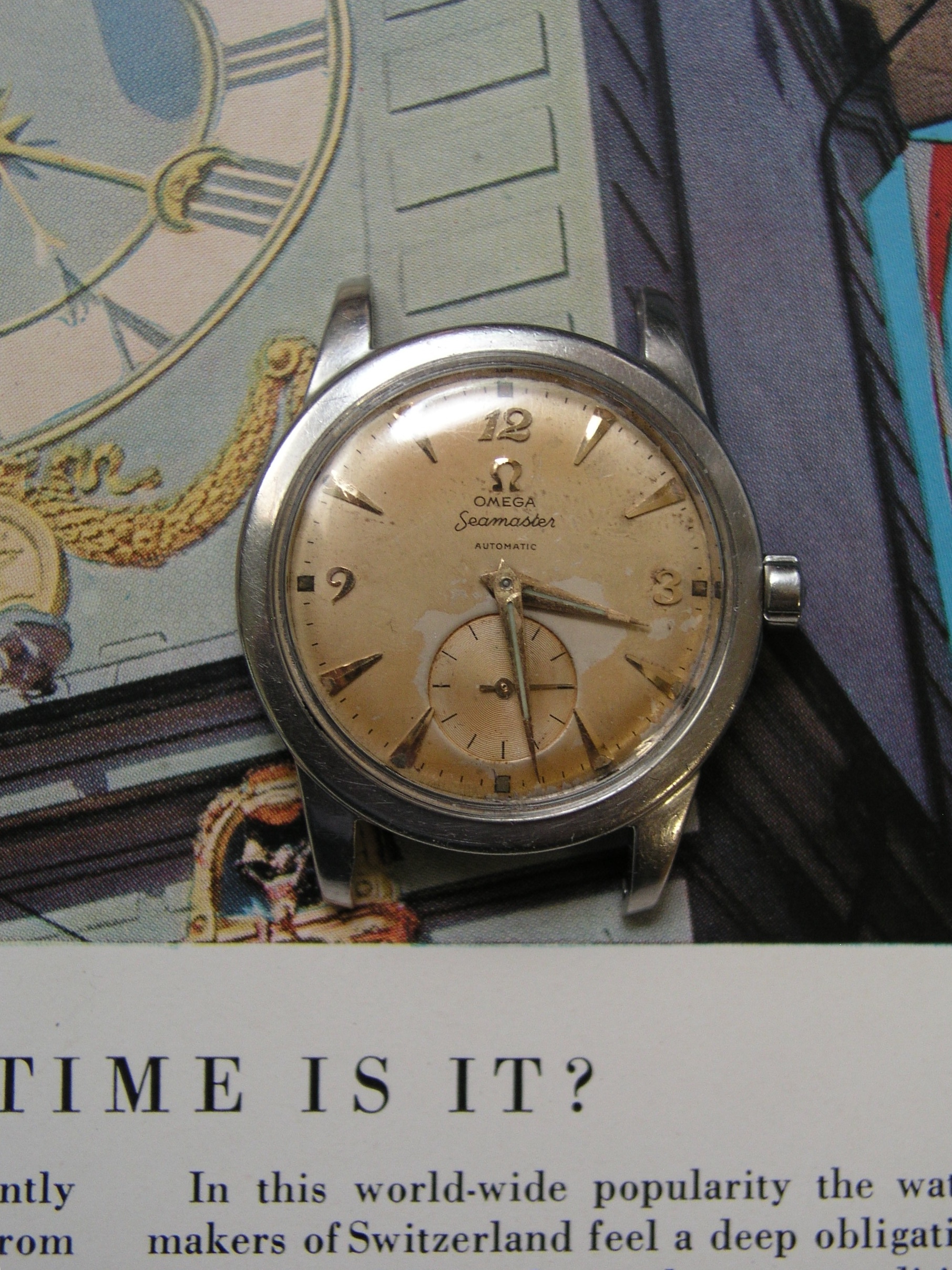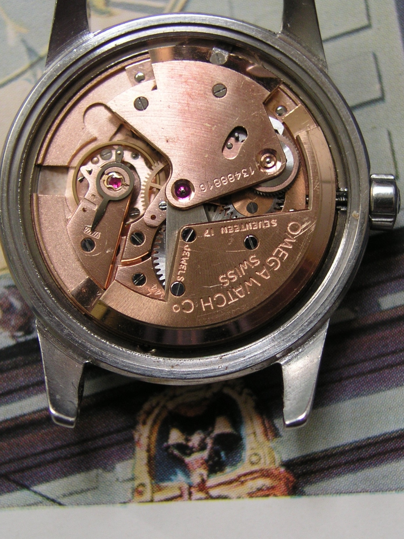 ·A friend recently returned from a trip to Denmark where, among everything else he did, he paid a visit to an elderly retired watchmaker, and came back with a few treasures. One of which is this ‘50s vintage Omega Seamaster with caliber 344 bumper automatic movement. Face up, one might walk away from this watch, based on the rather homely, yellowed dial. But once inside........! The movement picture shows a missing whiplash spring on the balance cock, but with having serviced the movement, the watch looks a bit better. You can’t judge a book by its cover.