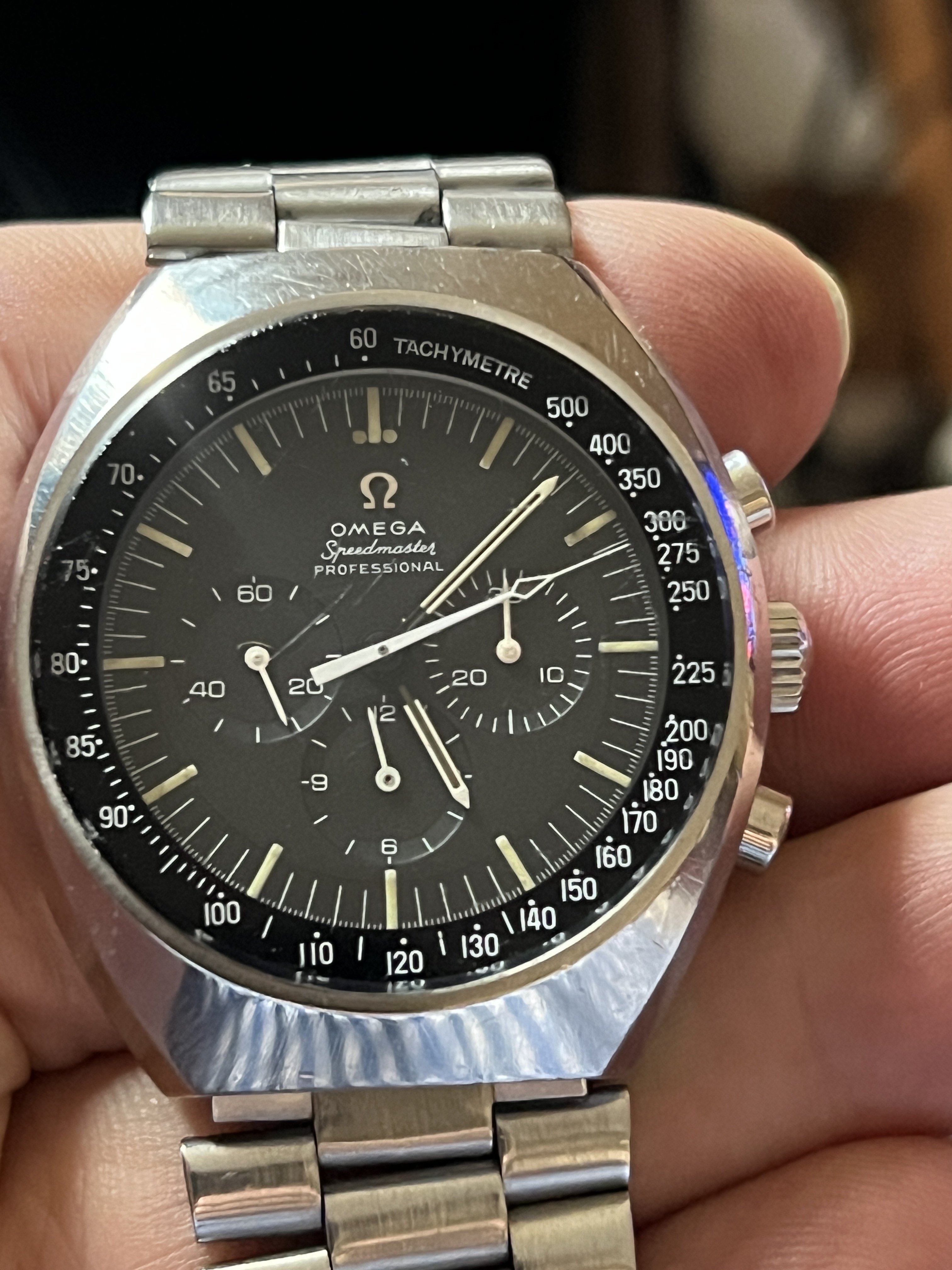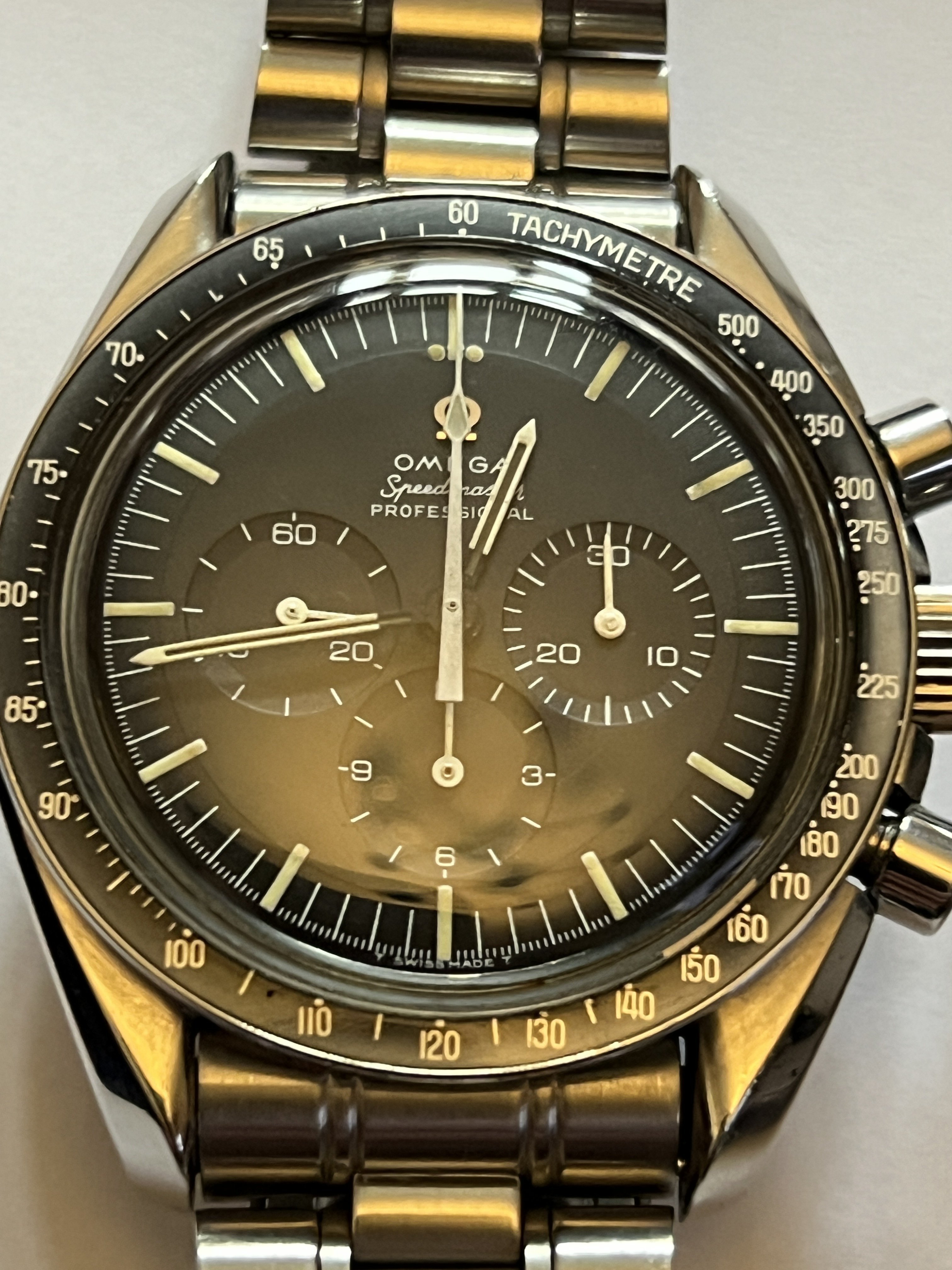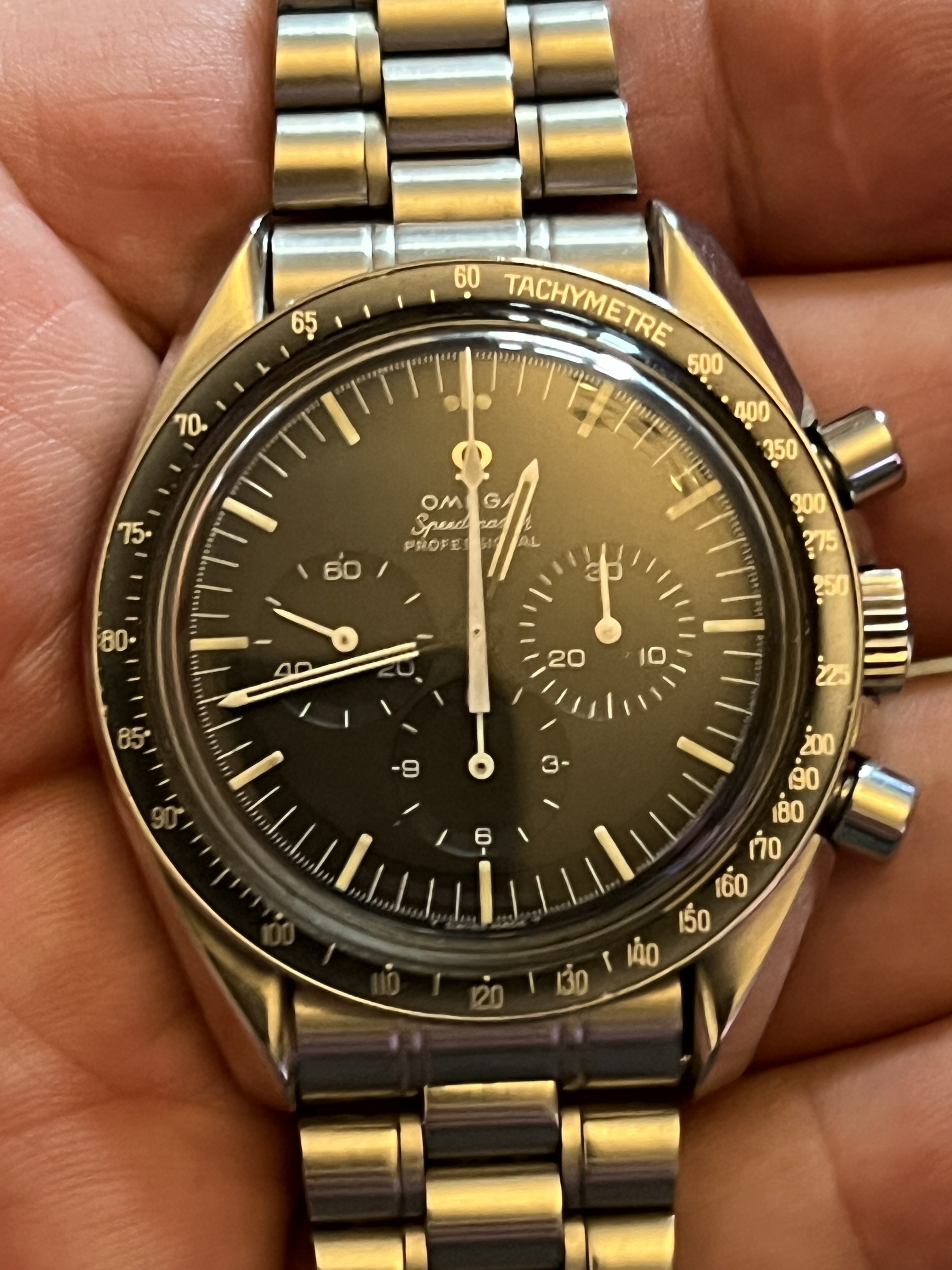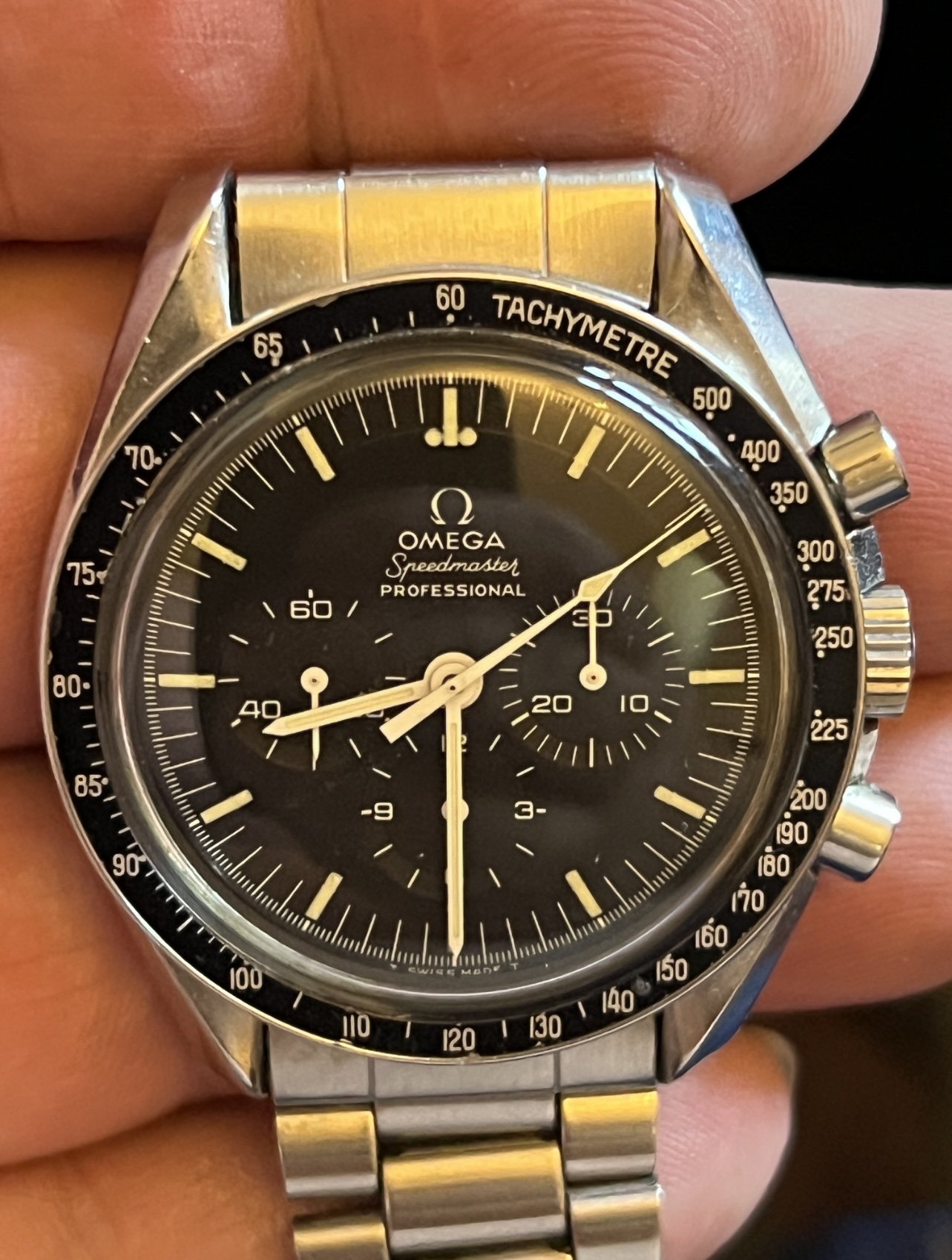 I have also seen applied logo Pre-Professional dials (with narrow T’s) that had 861 feet, so we know such dials were indeed manufactured by Singer at some point, yet are not correct for any of the known Speedmaster references.