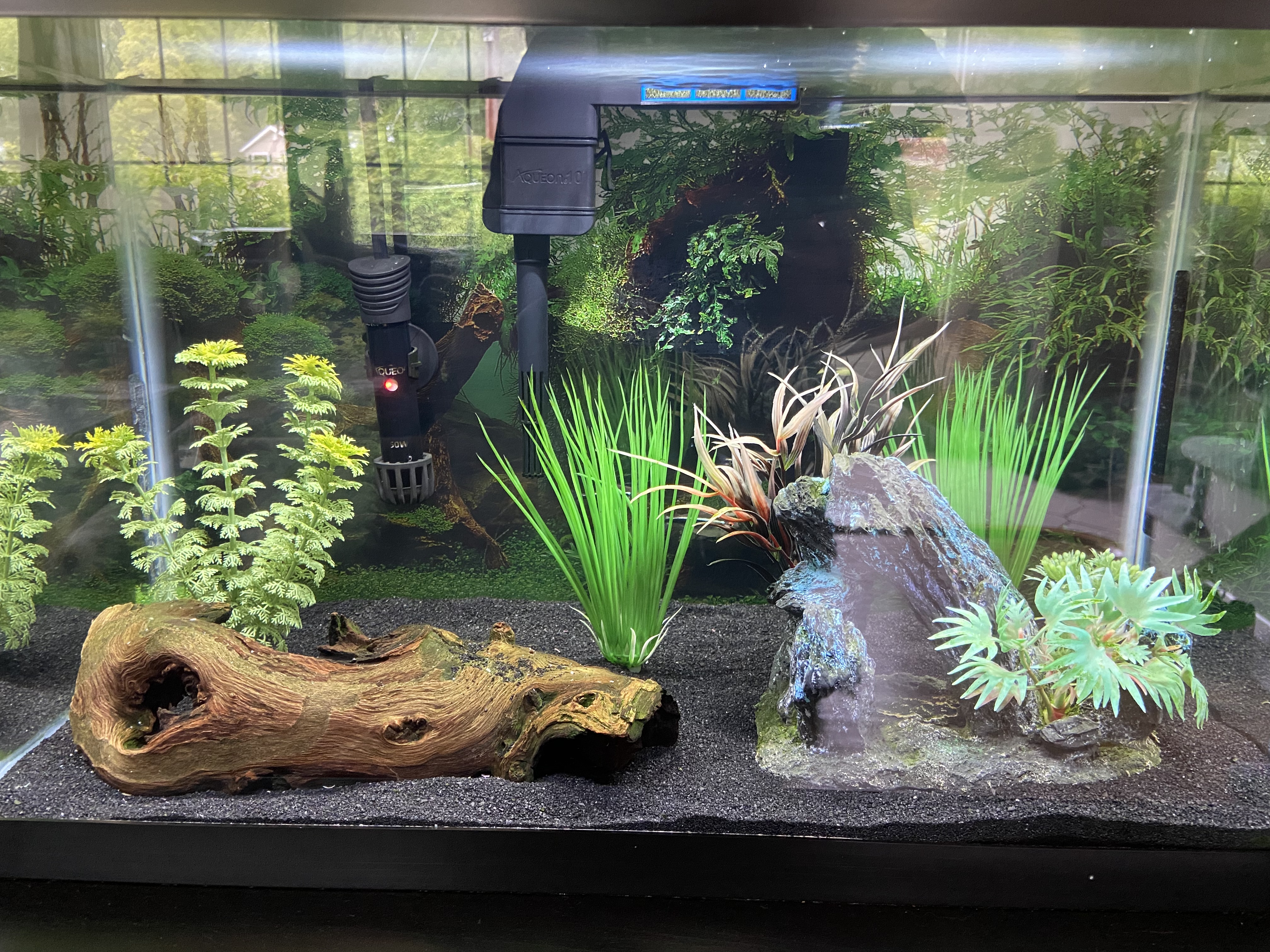 This is my small 10 gallon tank. Sorry for the crappy picture with lots of glare. It's a cool hobby but I'm really quite terrible at it. I had 2 mollies and about 8 tetras at one point but had an ammonia spike and killed most of them. Only 3 tetras left at this point. Those guys are troopers. I just can't seem to get my water quality consistent so not sure when I'll get more fish. It all started because I was trying to save a kids Beta fish that was on the brink. I saved him. And then killed him about 8 months later.