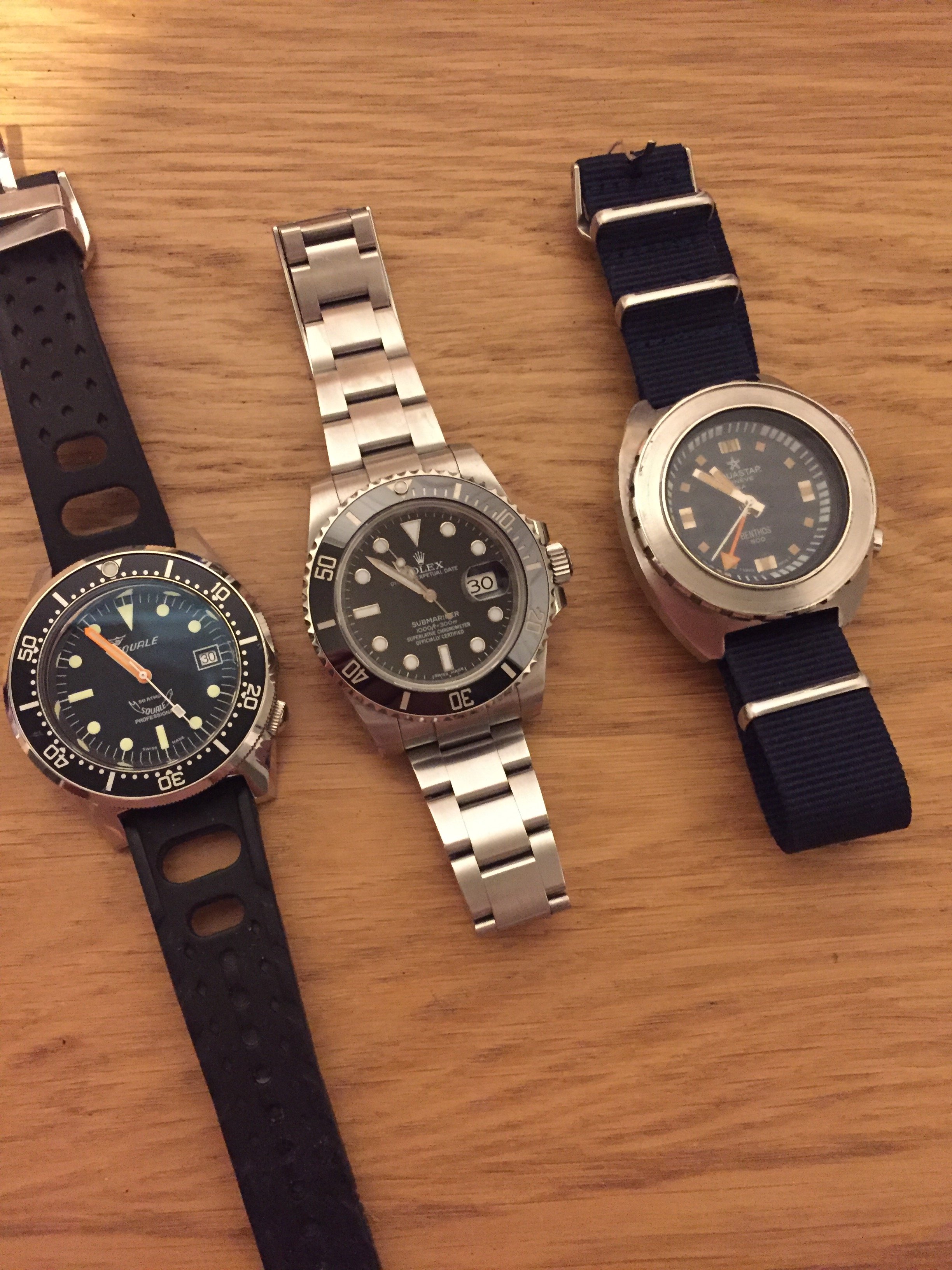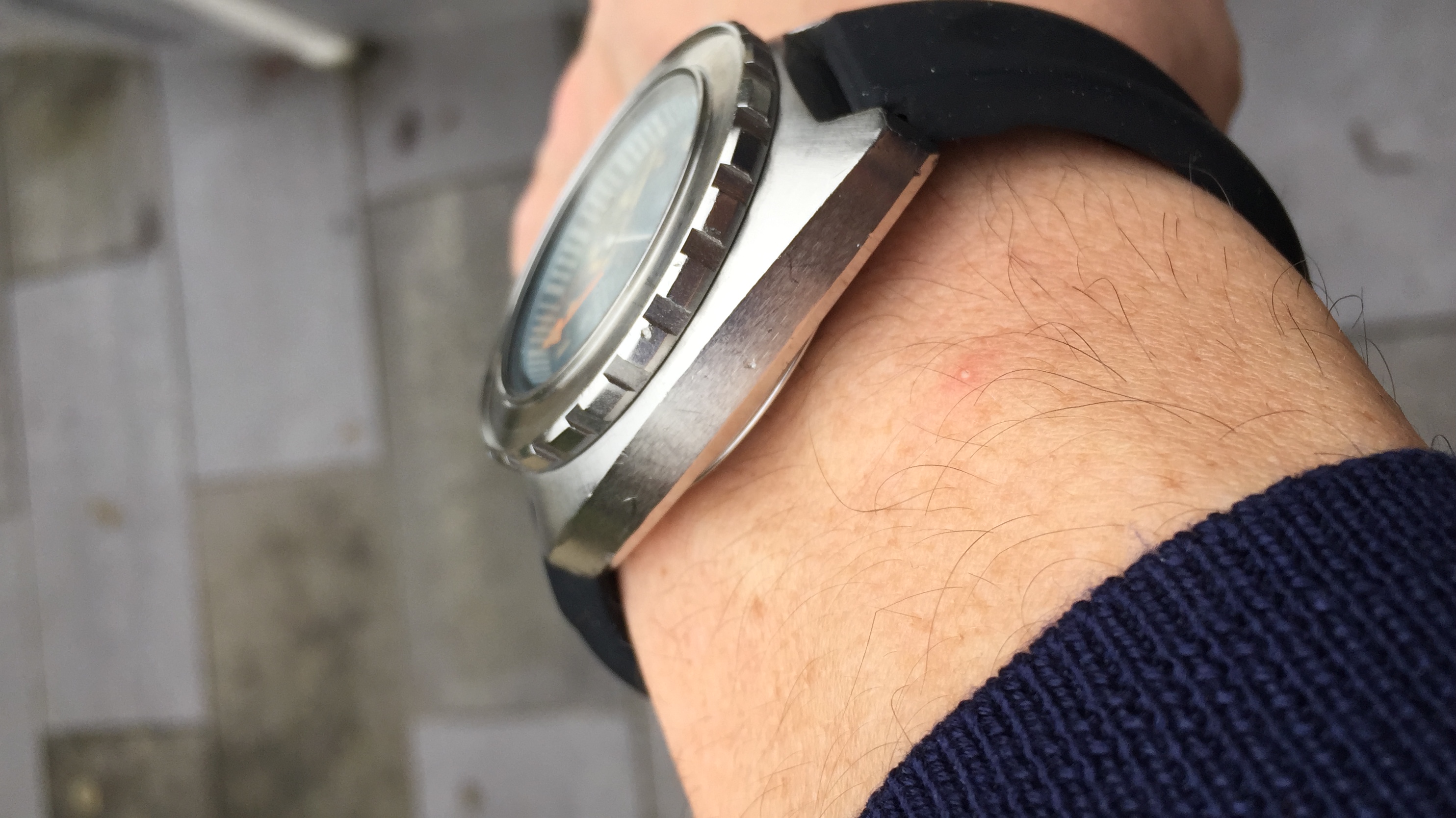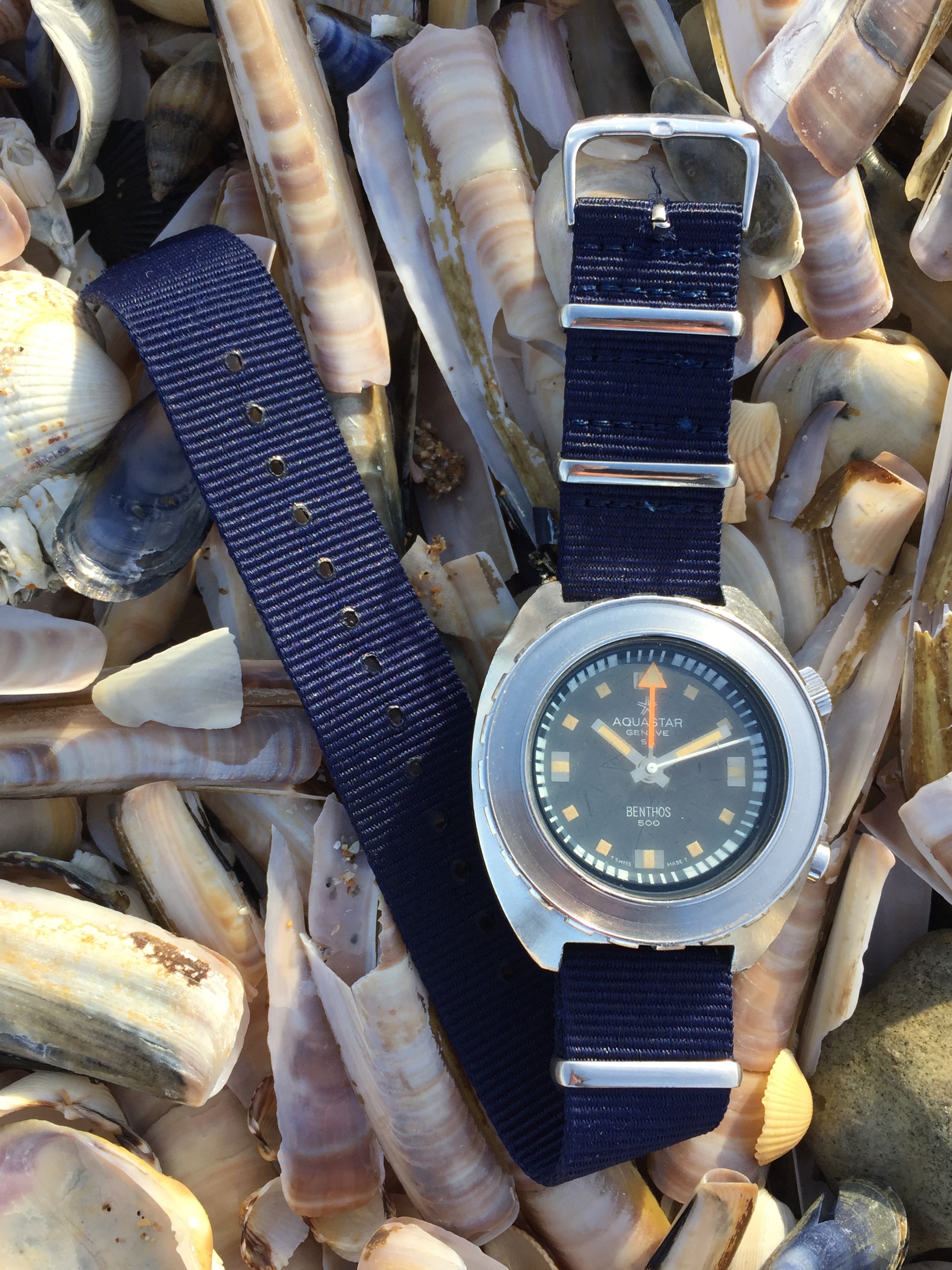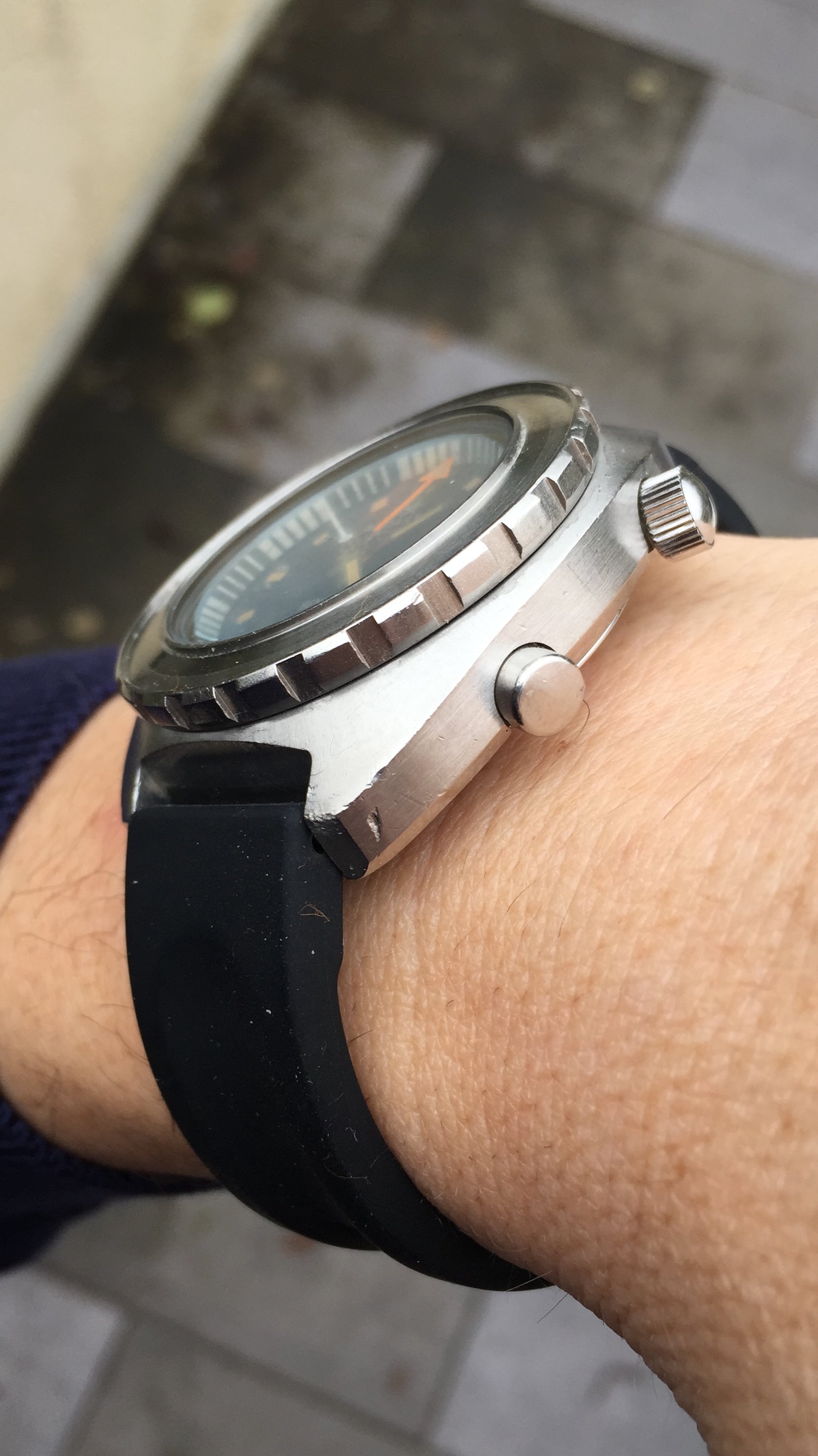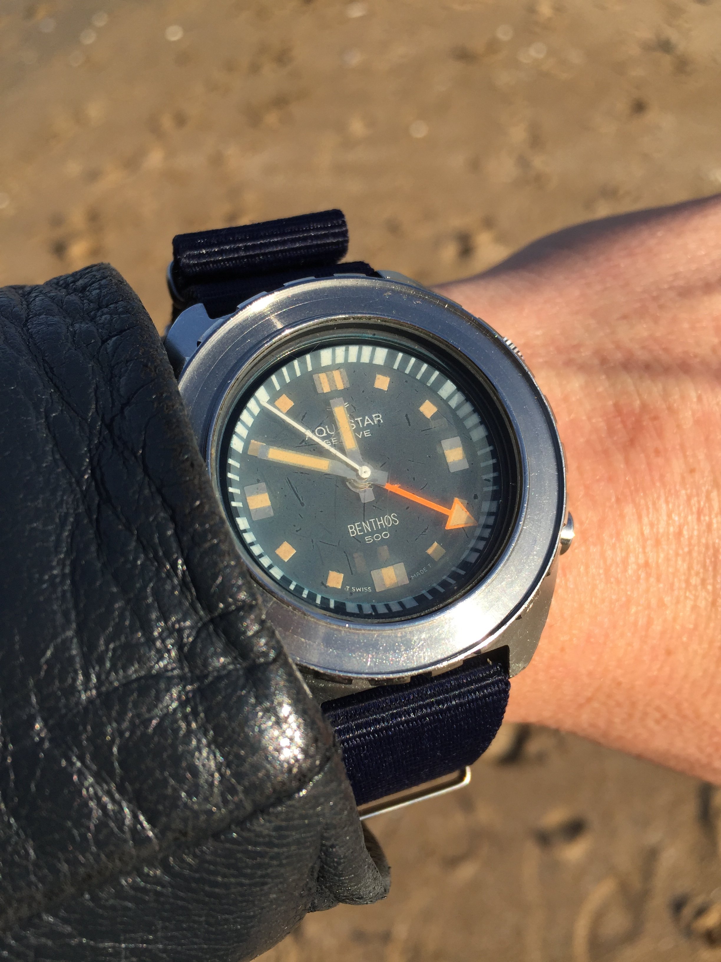 everyone here is my latest acquisition, an aquastar benthos 500, the first diver's watch of the world that can reach 500m. I bought it from the first owner who bought it in a Parisian department store in the 1970s. Interesting feature, the orange chrono hand. as soon as you press the pusher, this hand rotates for 1 hour, after one hour it stops, if you press it before the hour, it restarts at zero and continues its timing like a flyback. it has never been overhauled and still works perfectly. only fault he lost insert bezel.