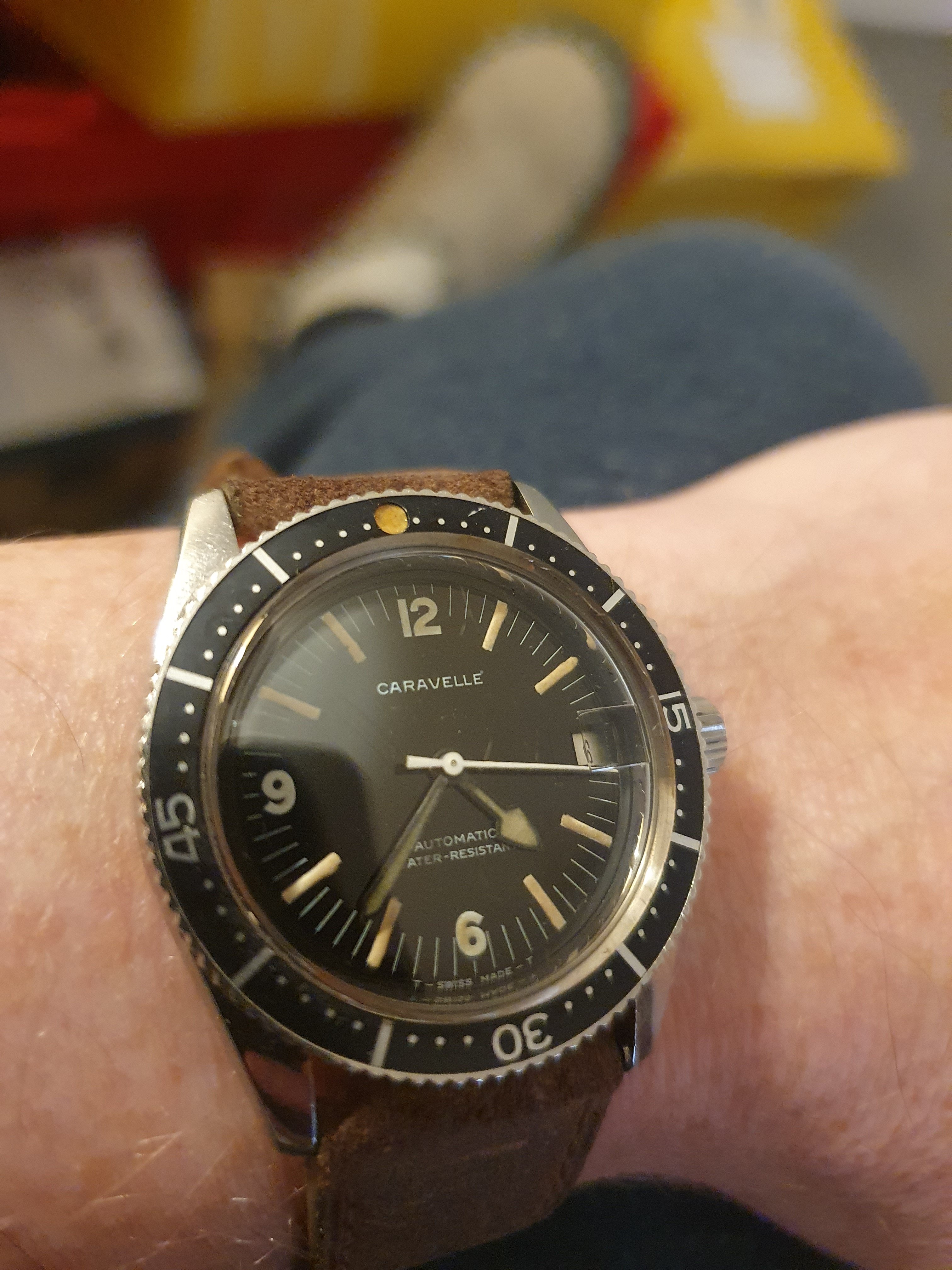 On the right, also a '69, this one an NOS manual with the excellent Caravelle 11DP (Citizen 0241) movement. 37mm.