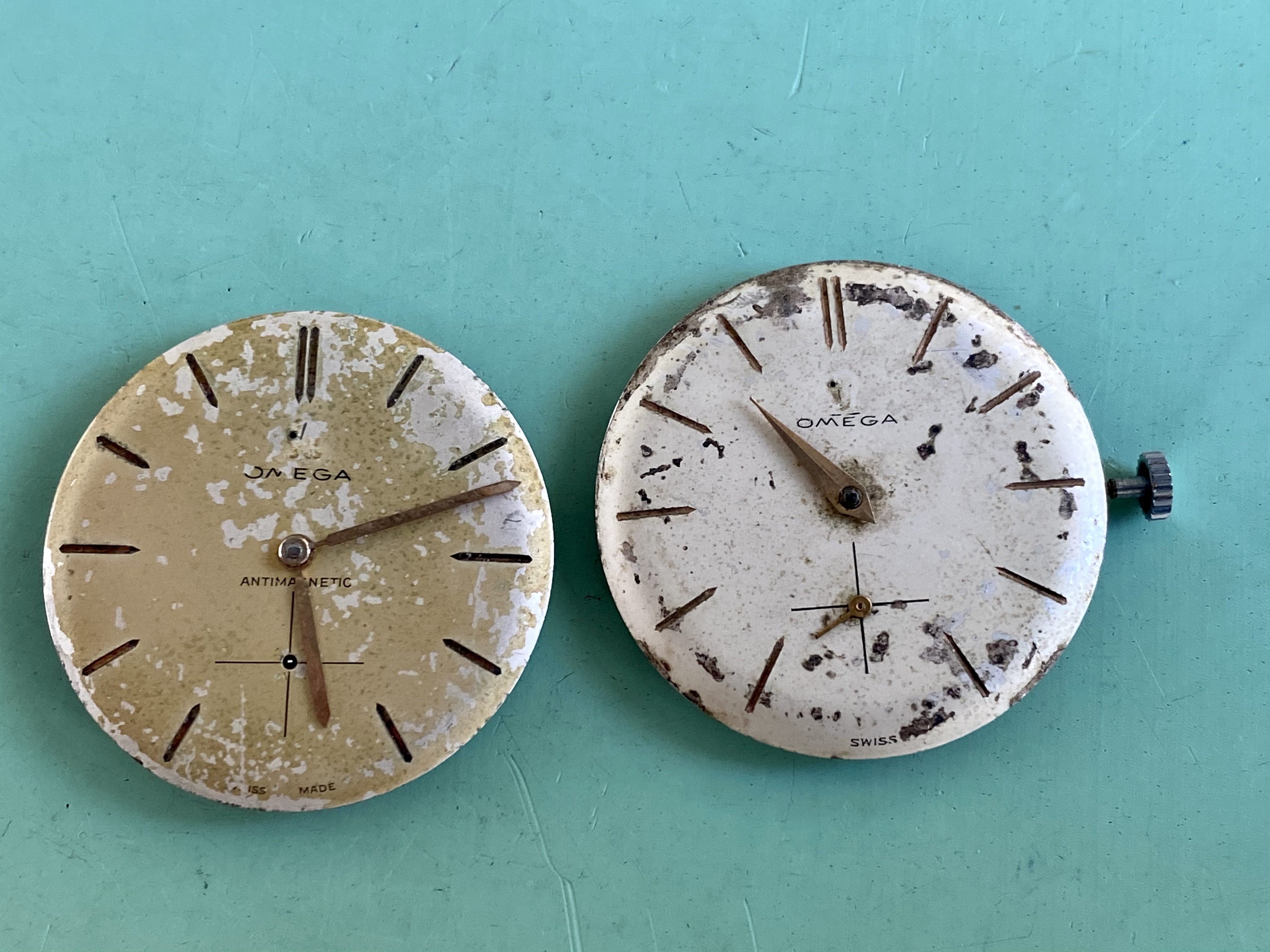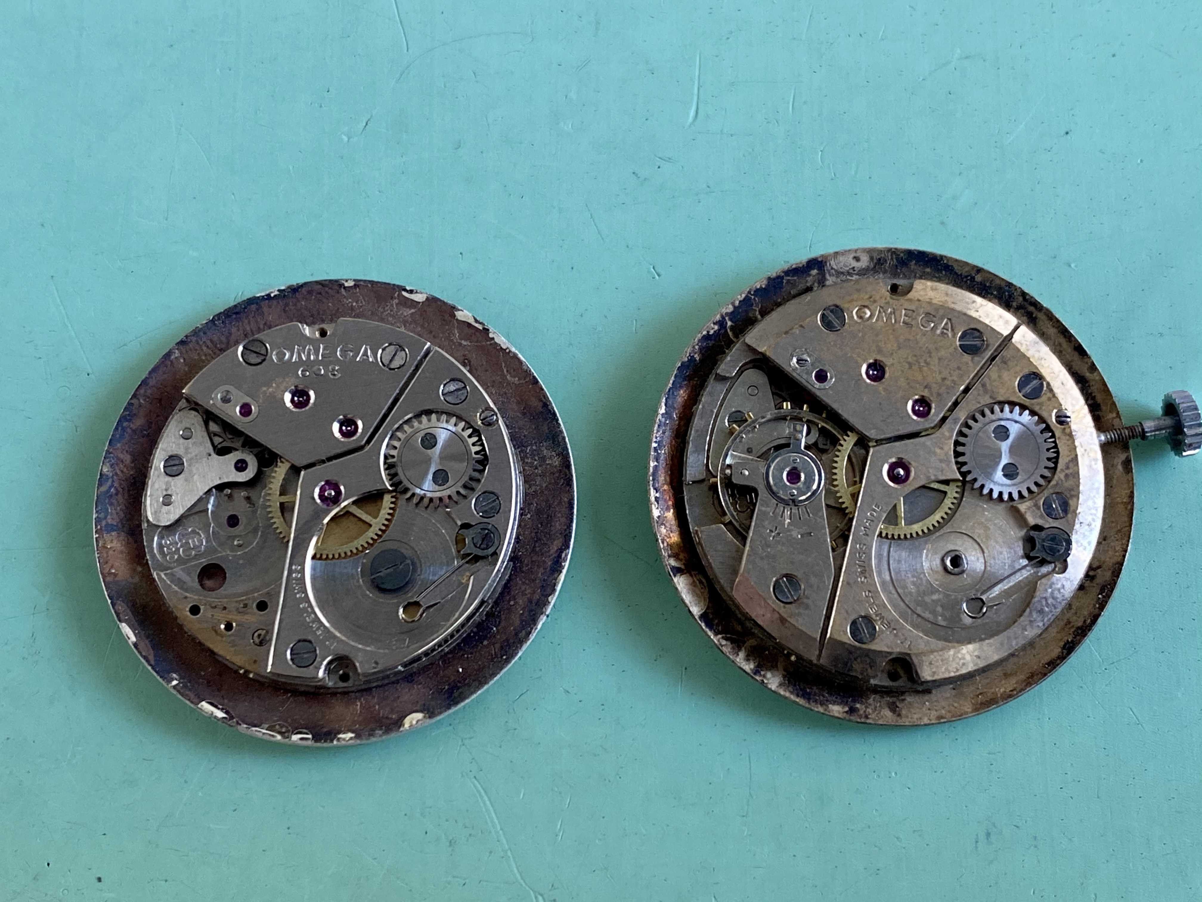 Posts 286 Likes 124 Temprus ·Jan 8, 2021 Both are fakes. Based on non Omega movements. The watches are very slim so I think both have a Peseux movement inside like on the picture below