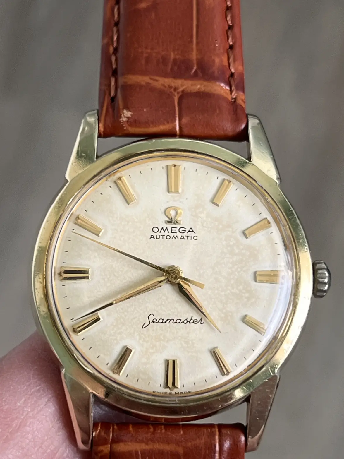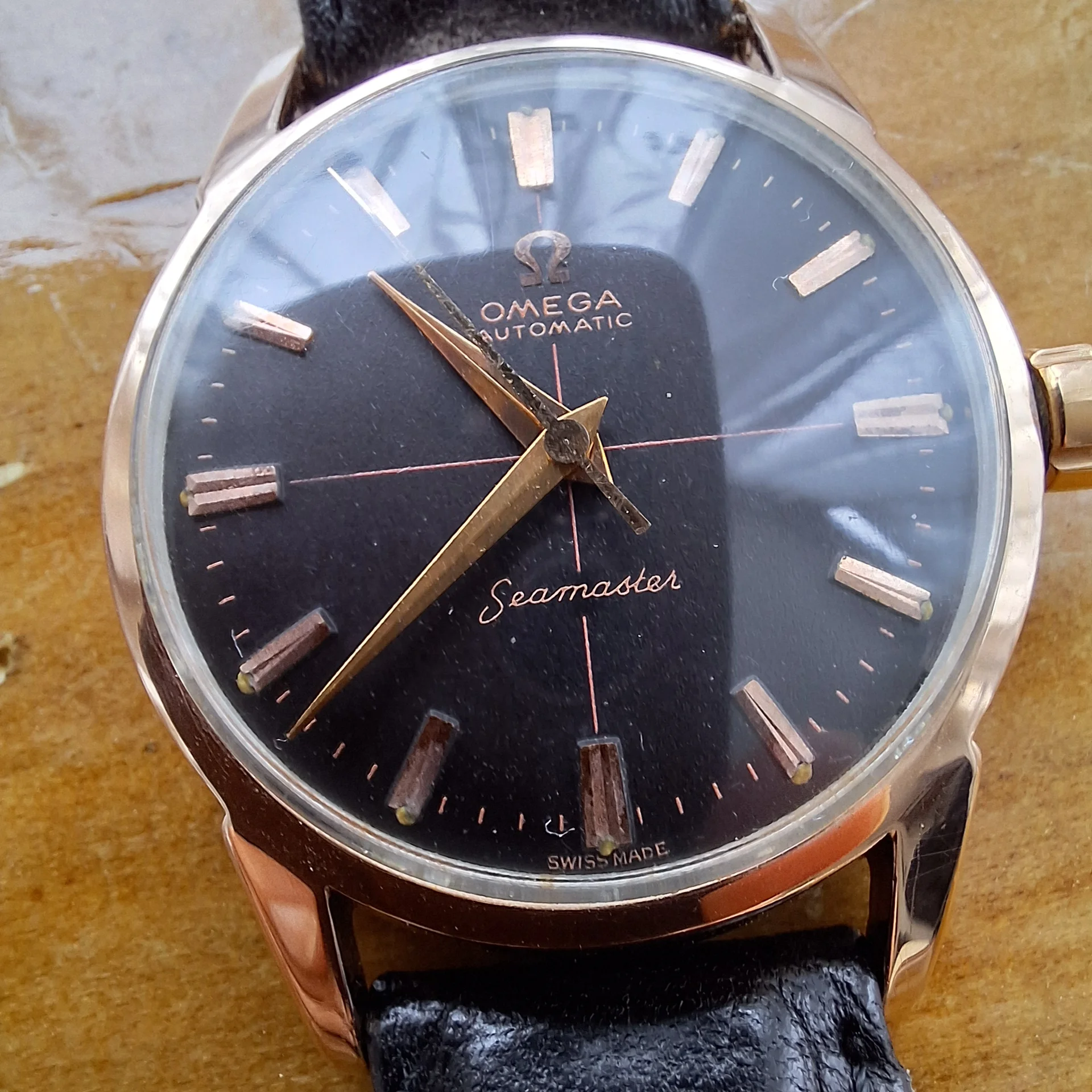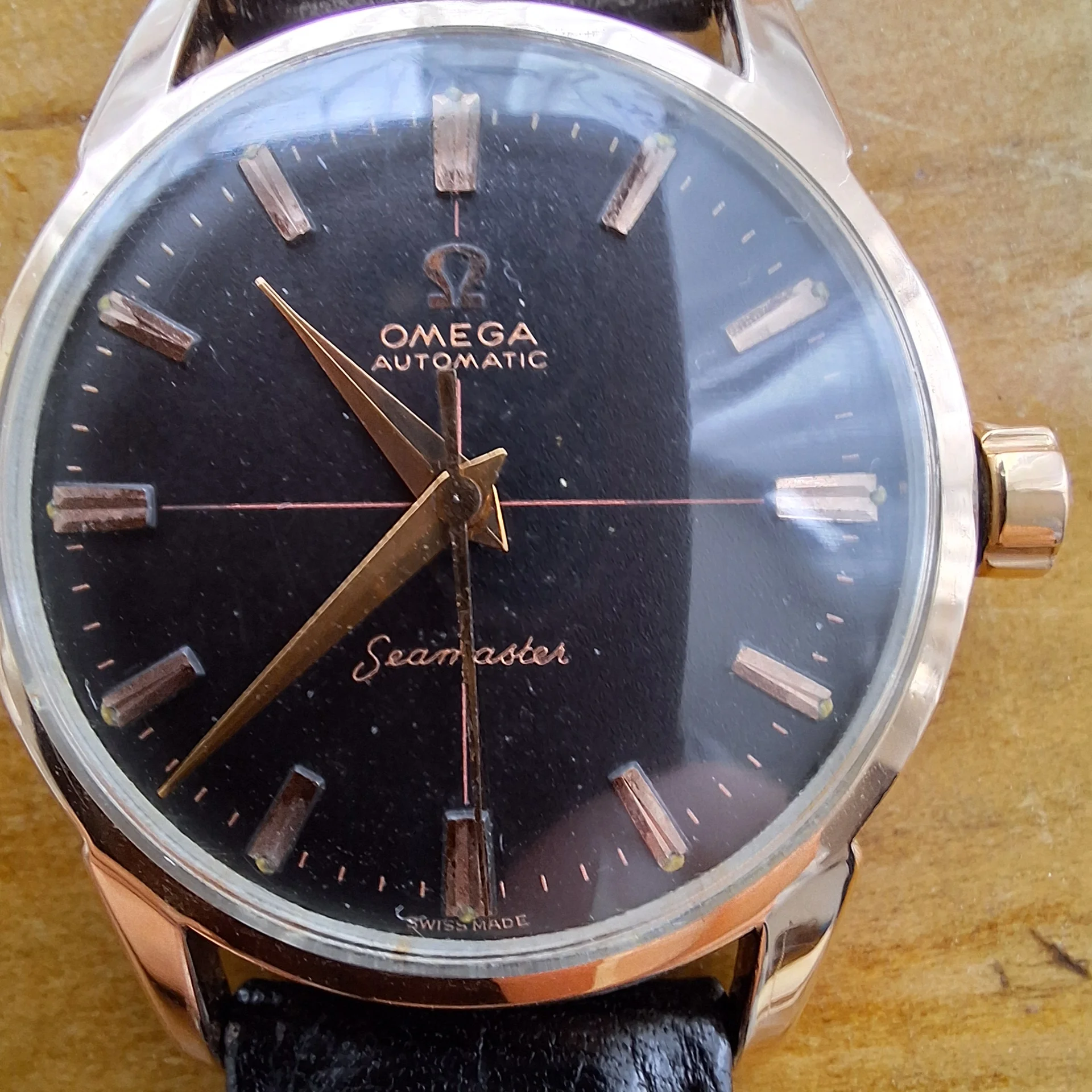 But, that said, everyone is always suspicious about a vintage black dial - especially, in my opinion, where there is a cross-hair and I suspect, but could easily be wrong, that the crown is from an earlier vintage.