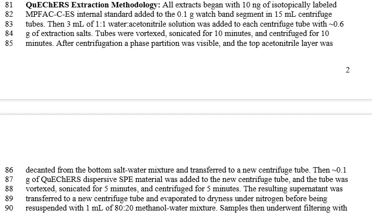 The experiment you are citing- the one the article you shared cited- used solvents to extract PFAs from the watchbands so that the amount could be measured. One of the ways in which the sample was tested was QuEChERS, in which the sample is "homogenized" and then exposed to a solvent.