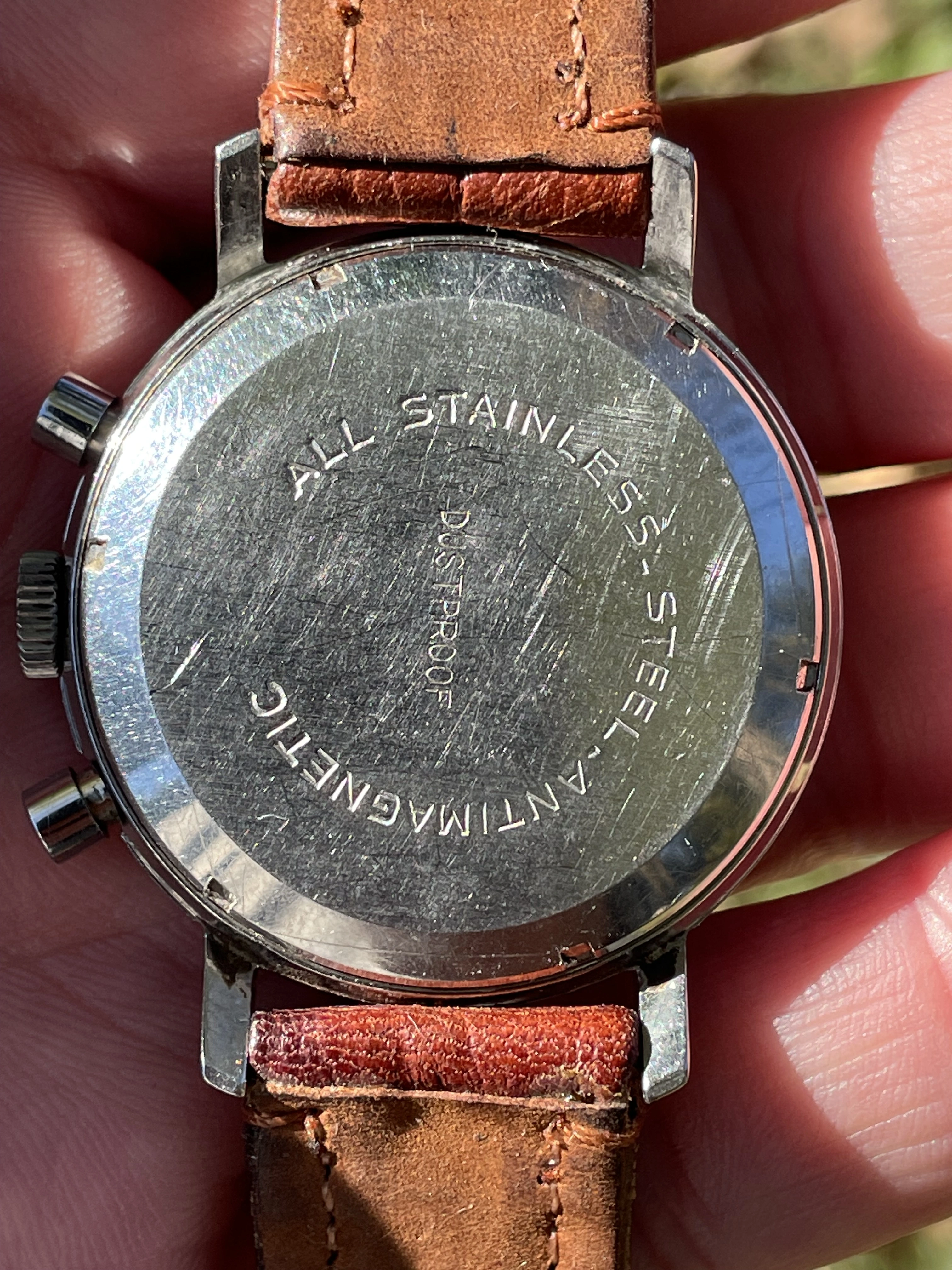 Watch has a Landeron 248 inside- it’s a plain Jane L248, seen one you’ve seen them all hence no movement shot- I can assure you there is a movement in there.