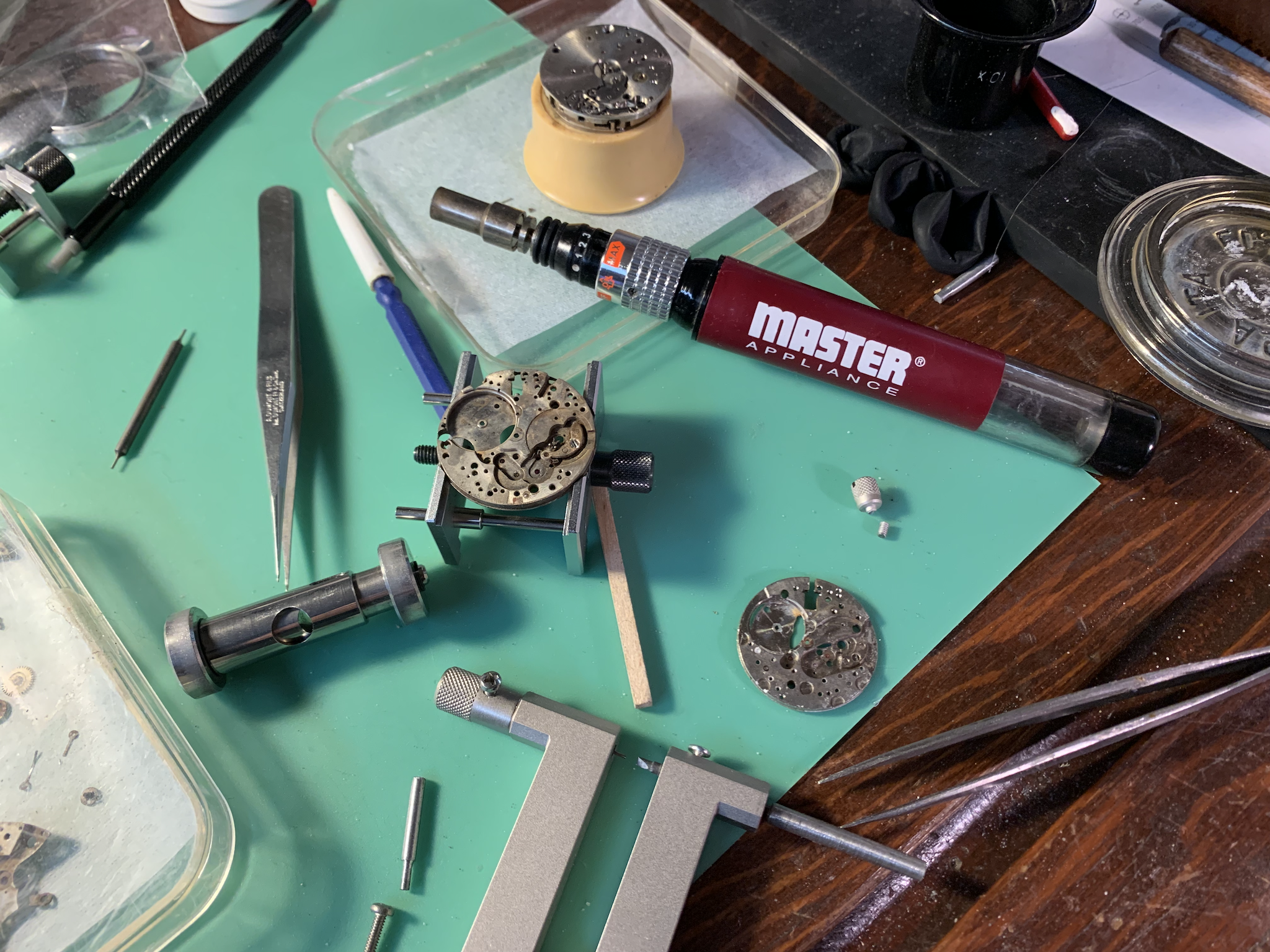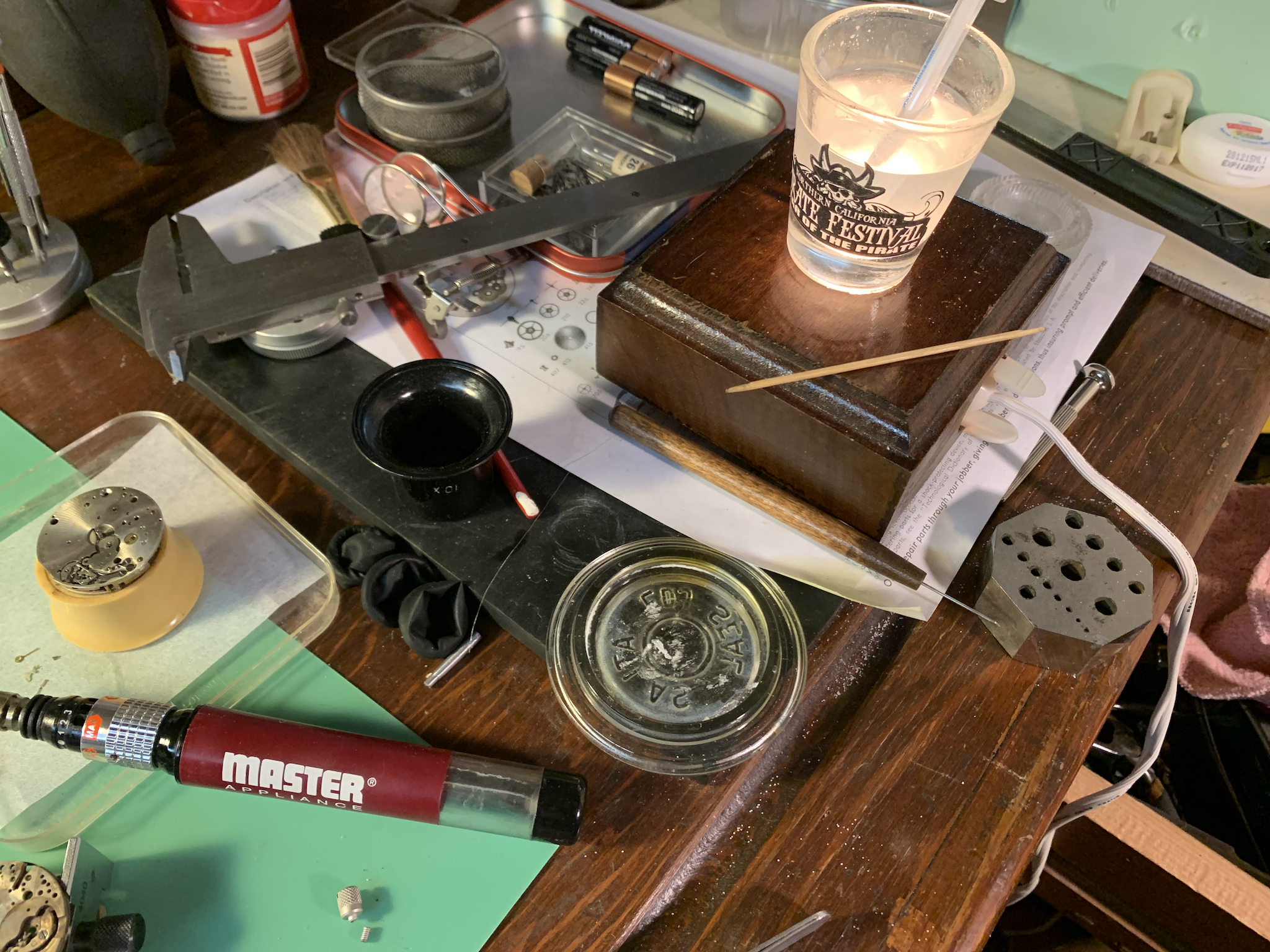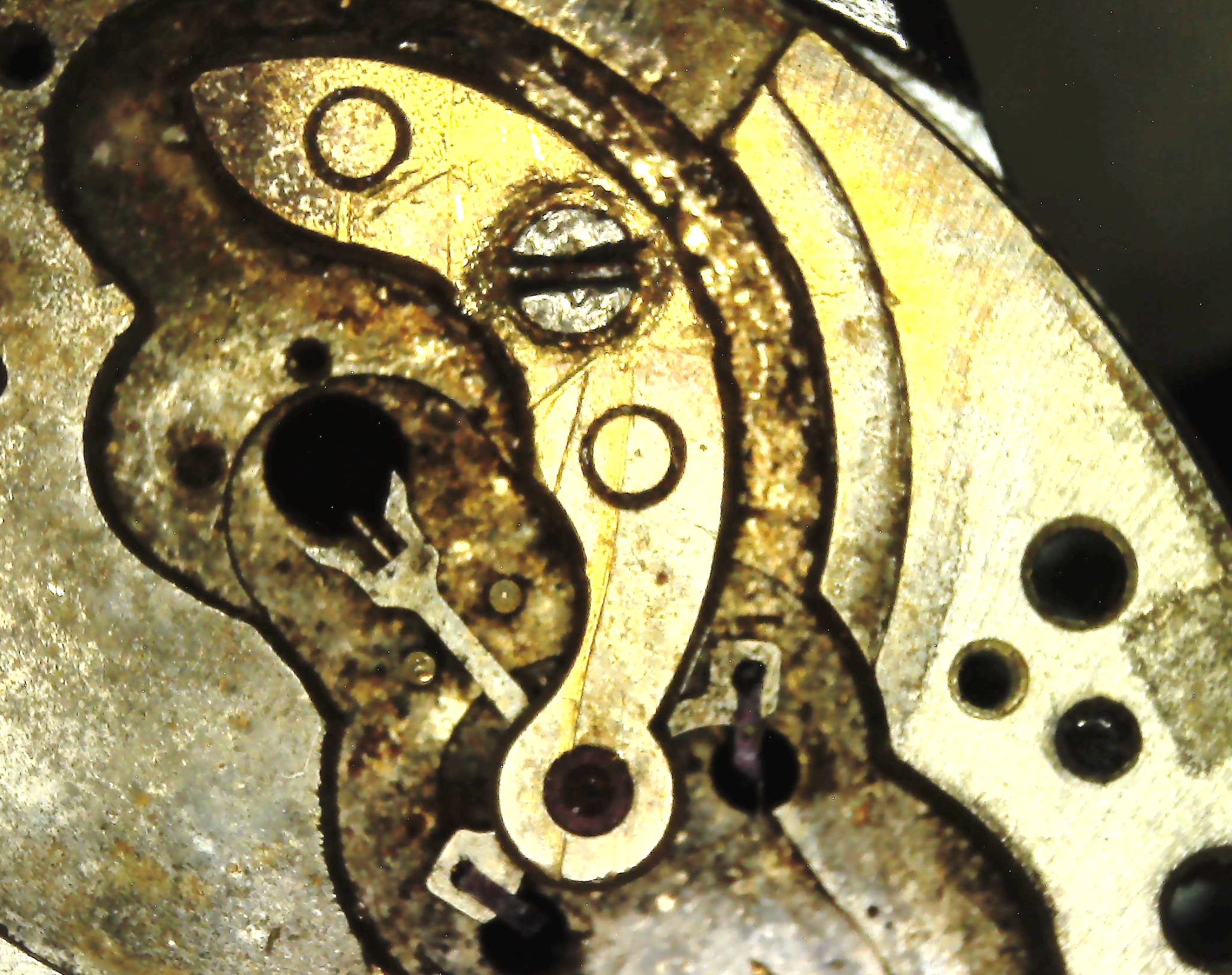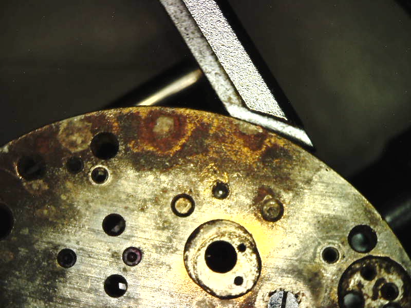 I suppose I could attempt drilling The bridge out. The bridge is toast now that I got the new one, still seems drastic. I could also bend it like the old scrap movement to release the fork. Then get more aggressive with the Alum water. The eccentrics are still in place, so I can not dip the whole plate unless I remove them, which I may have to do to clean them.