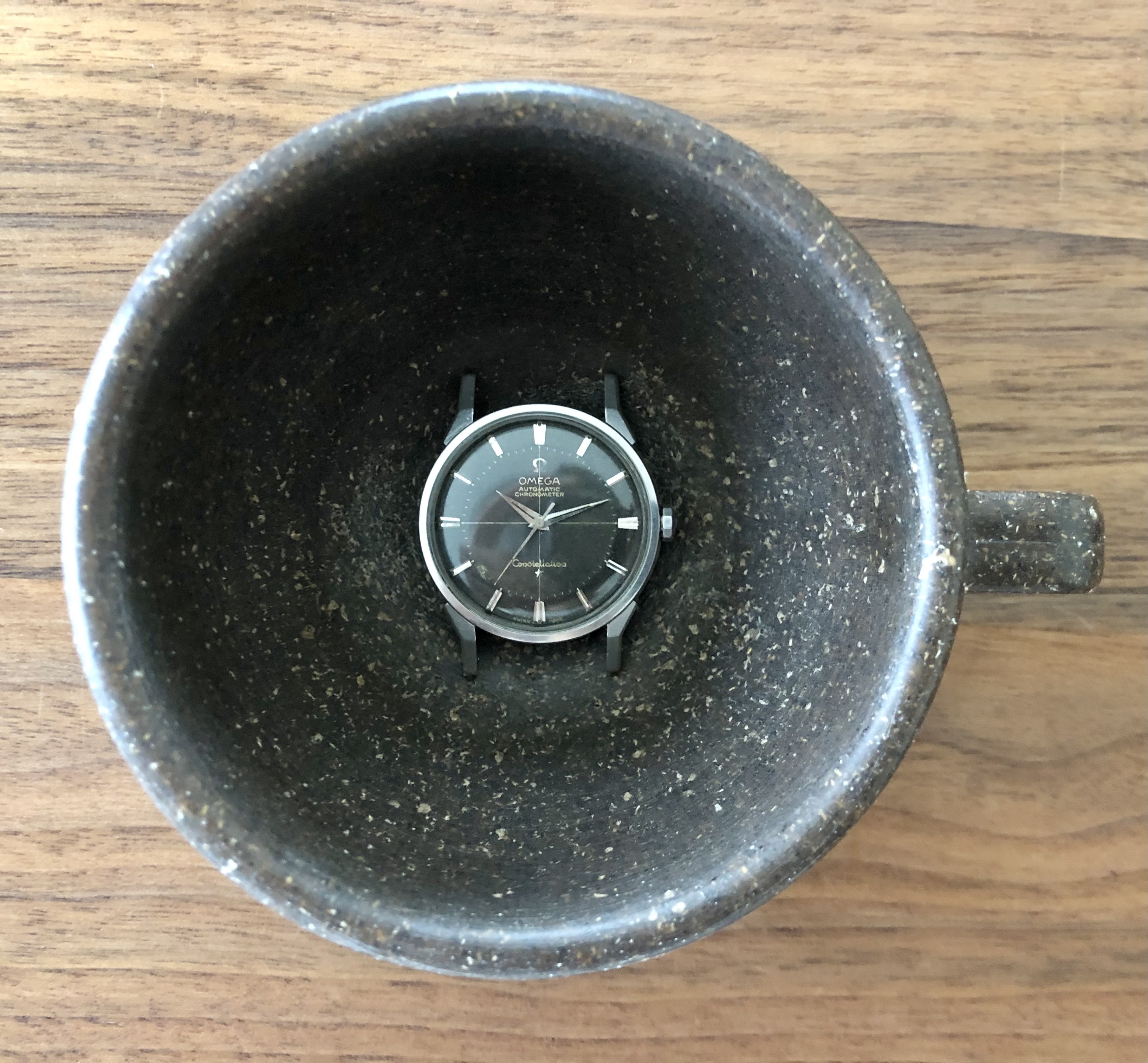 Now the dial is the interesting part. I had disregarded examples with only slight traces of patina as I wanted a clean dial (it would still be the case if I was looking for a silver dial). However, in this example it is in fact the patina that adds so much to the character of this watch in my opinion. The black dial turned in to a matt brown color with lighter speckles evenly spread, not dissimilar to this example recently sold by @cristos71 if I may draw this comparison. It reminds me of coffee cups made of coffee ground that I own.