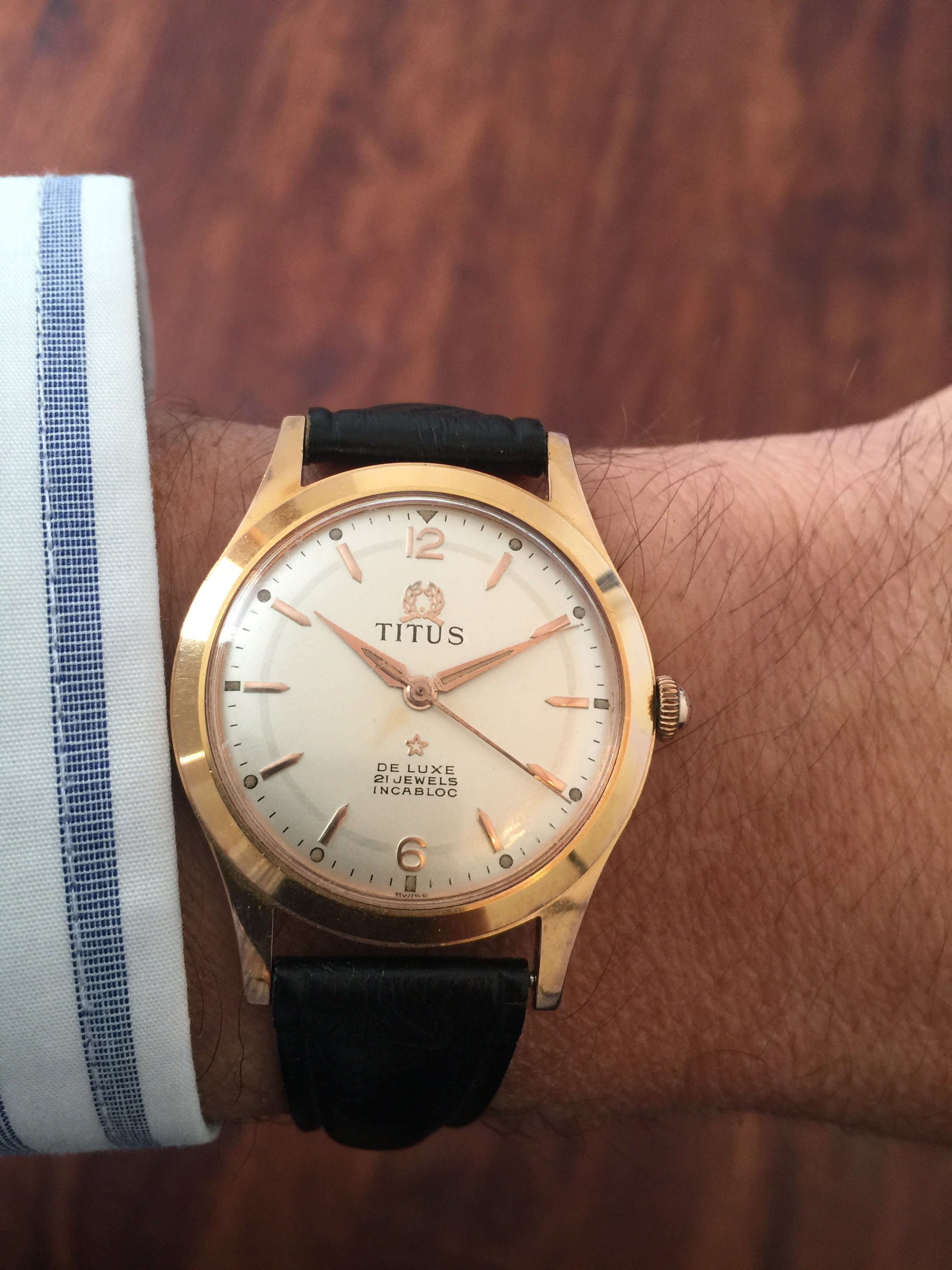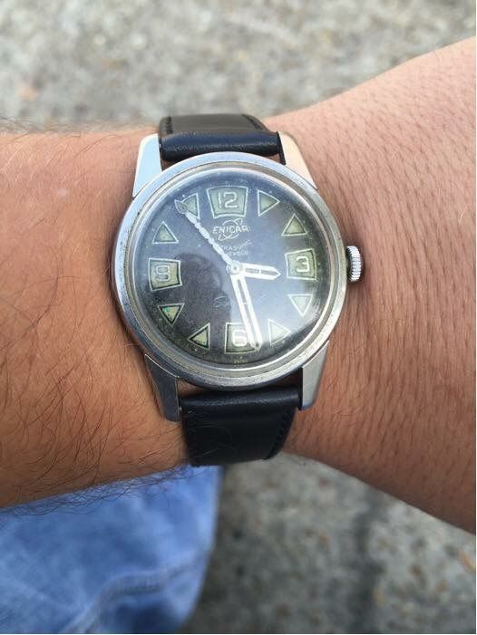 Found this little gem at an antiques fair near Bordeaux, France. Crystal needs replacing and there is a bit of grime on the exterior, but dial is in great shape, and the case is unpolished with only a bit of wear on the back. Even has the original signed crown. Can't get the caseback off without my tools (which are back in London), but fingers crossed that everything is up to par on the inside (it winds smoothly and keeps excellent time, at least).