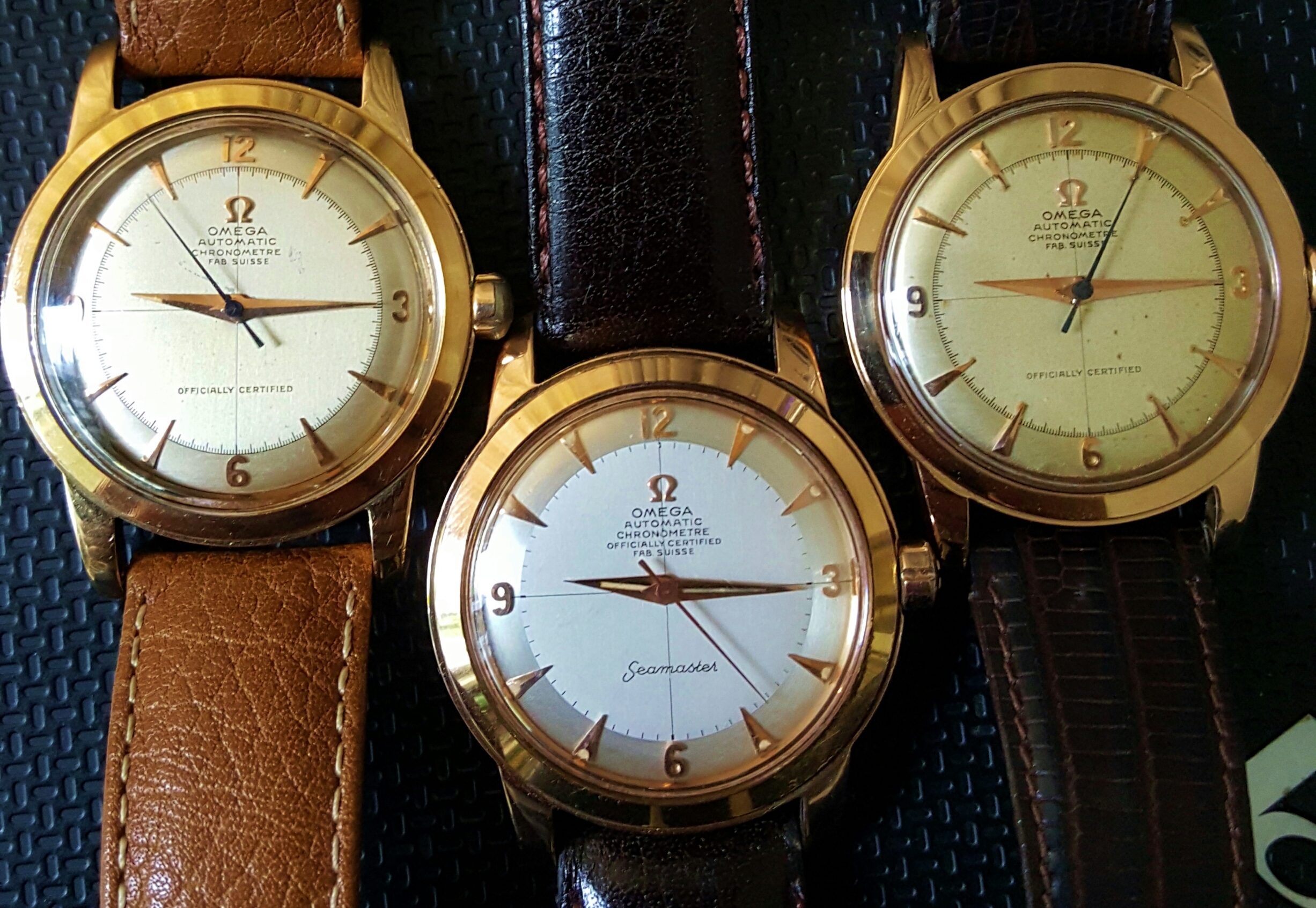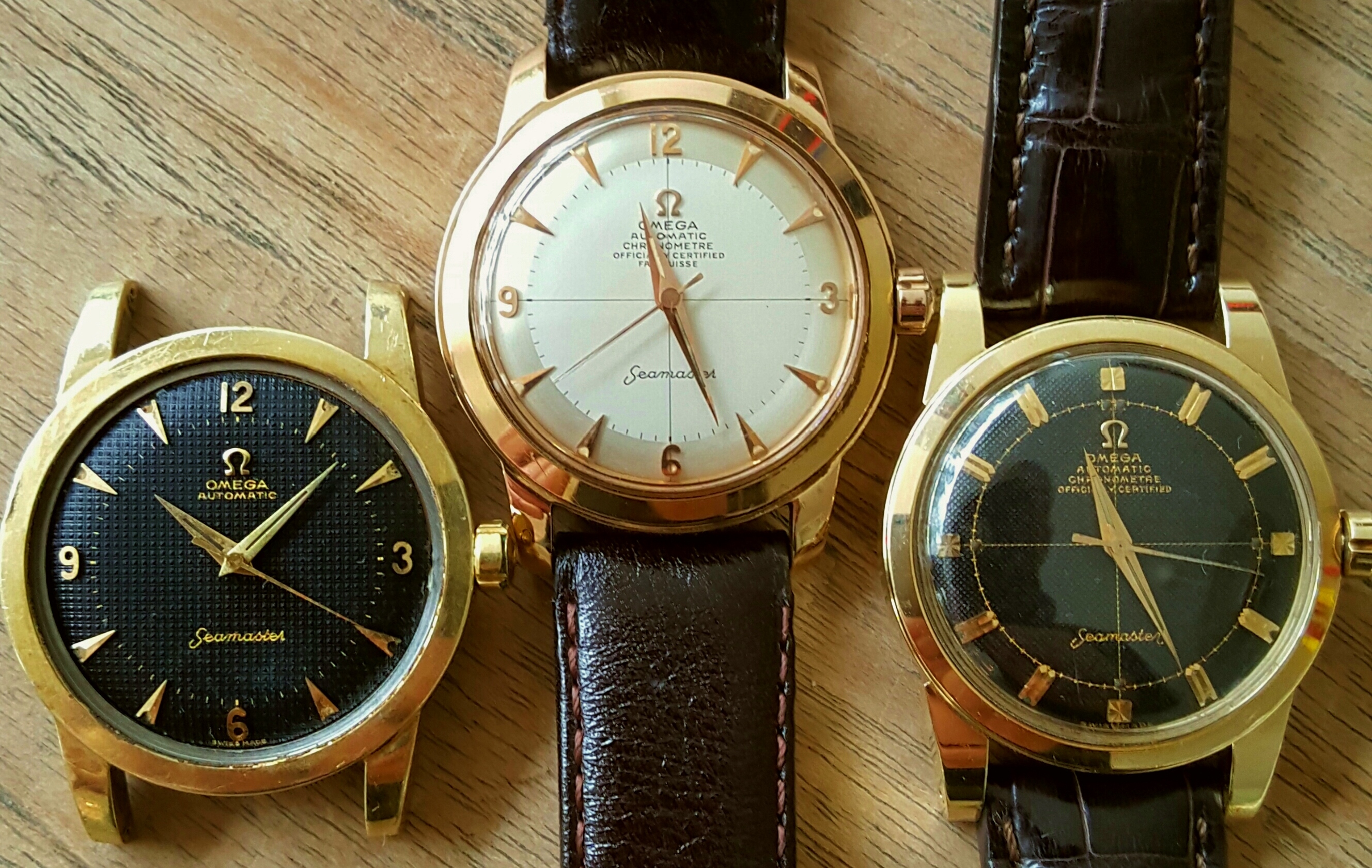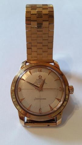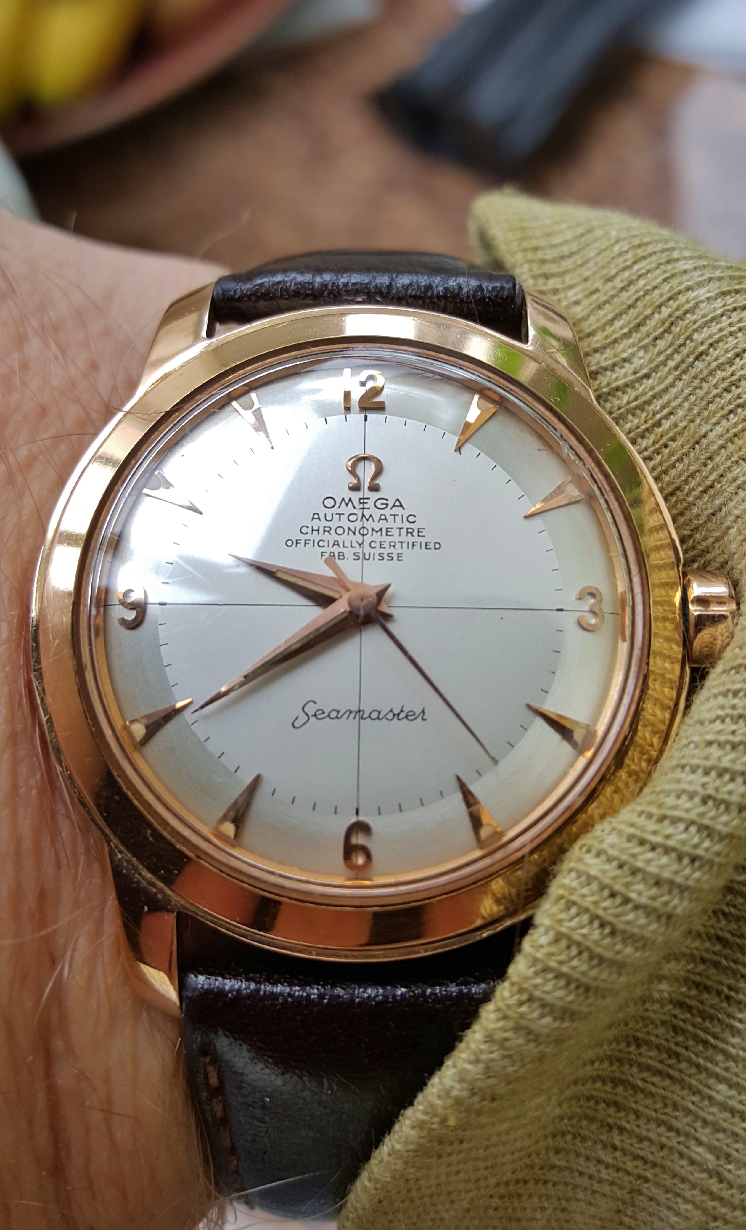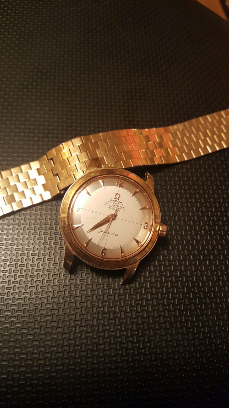 Here is my third and final arrival of the last couple of weeks, continuing the unintentional Seamaster theme this one is an 18 kt rose gold, French production Seamaster chronometre from the early 1950´s. I´m pretty certain it has a cal 352, but I haven´t been able to open the case up so can only really speculate until I visit my watchmaker next week. I bought it together with an 18kt rose gold bracelet which unfortunately is too small for my wrist and although in very nice shape will probably be going to the melting pot.