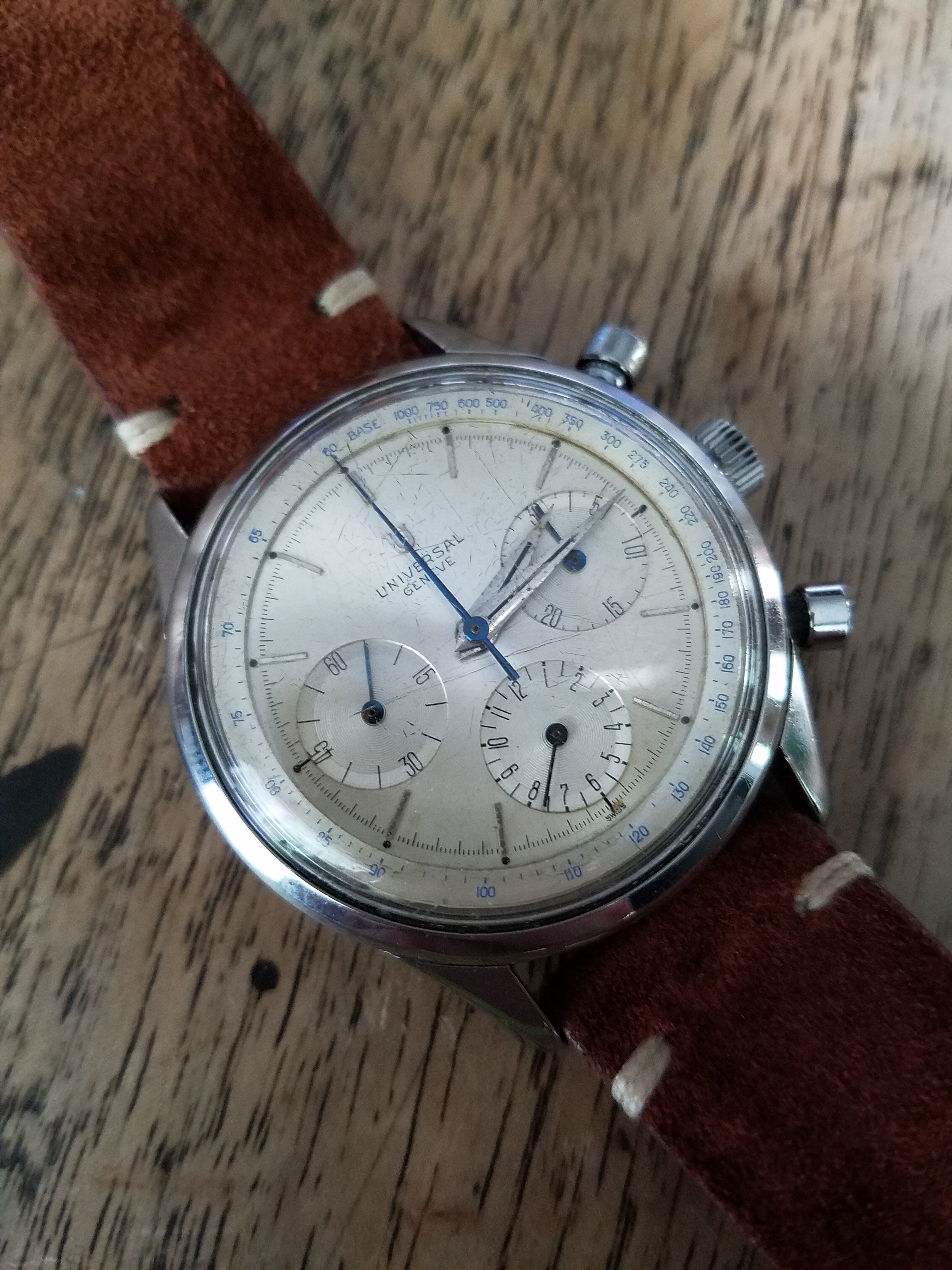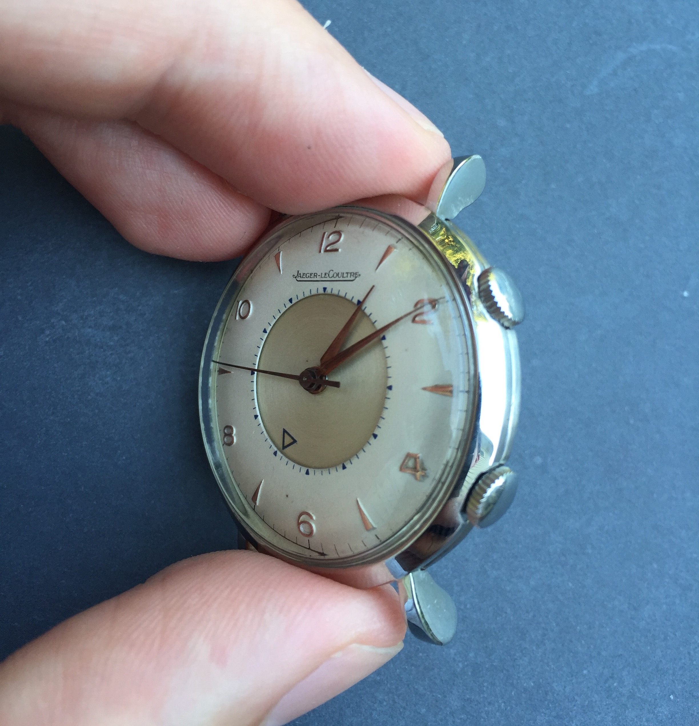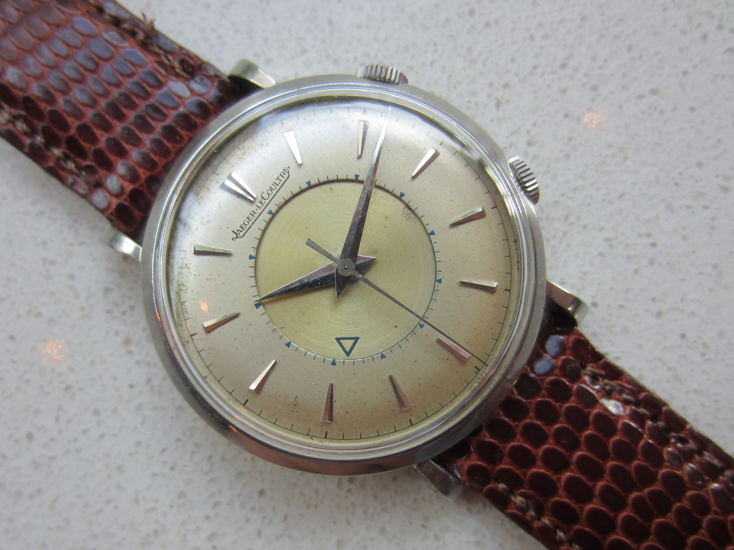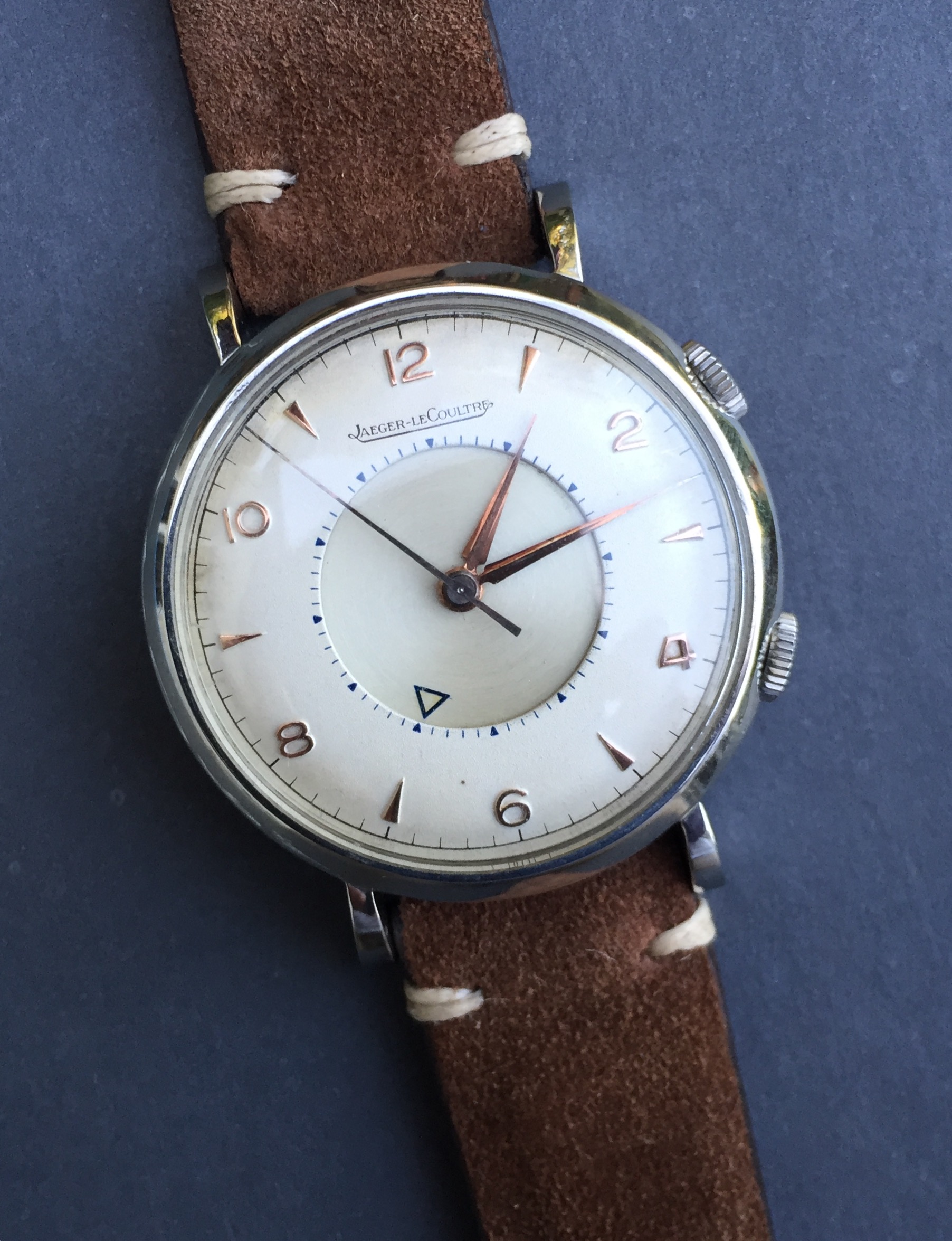 An older brother (1953) for my Memovox family! This one is a reference 3151 with a 489 cal. It's the stainless version of the Charlie Chaplin Memovox. Got some debris floating around the dial so it's off to the clinic but not before a brief family reunion.