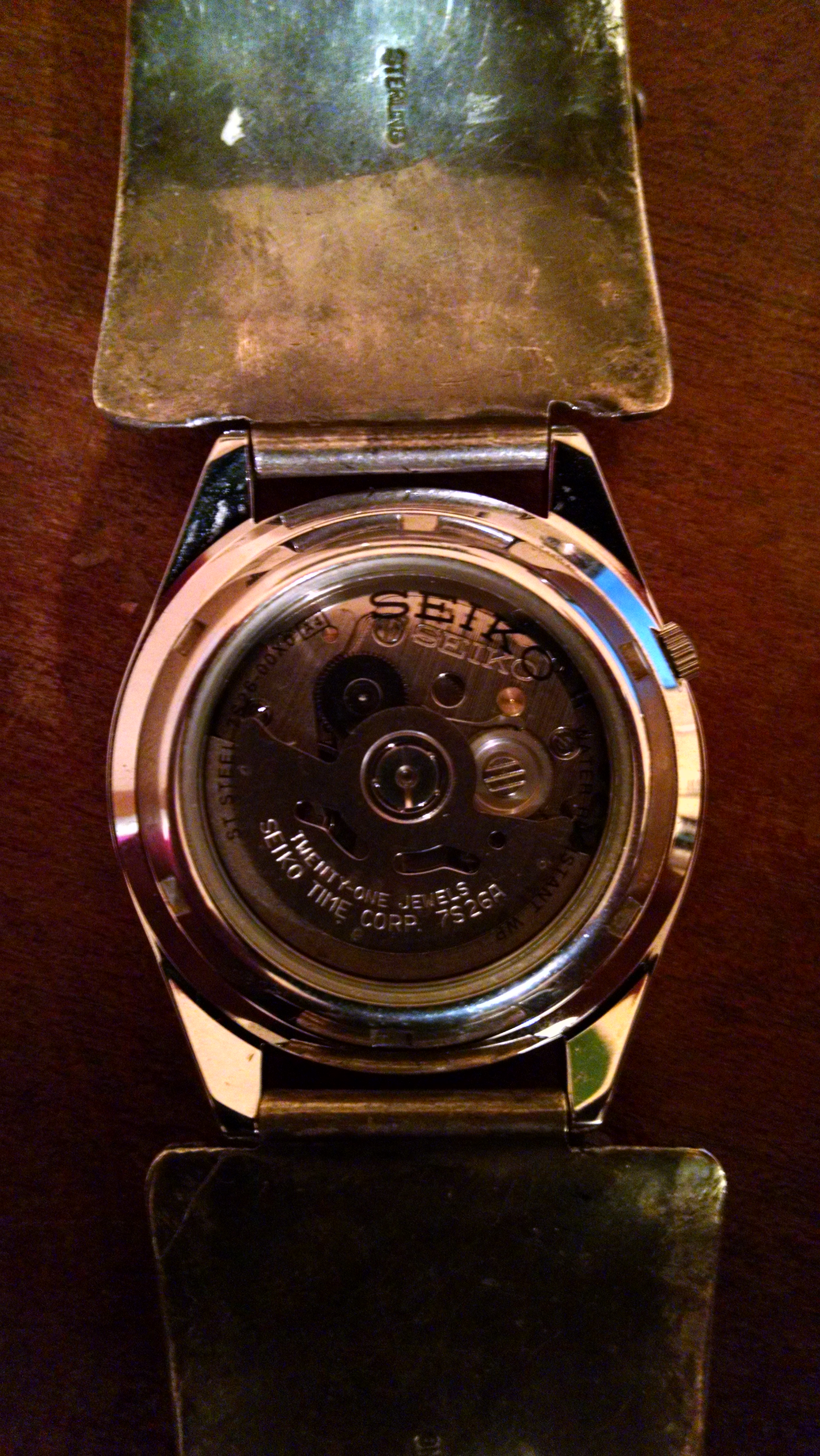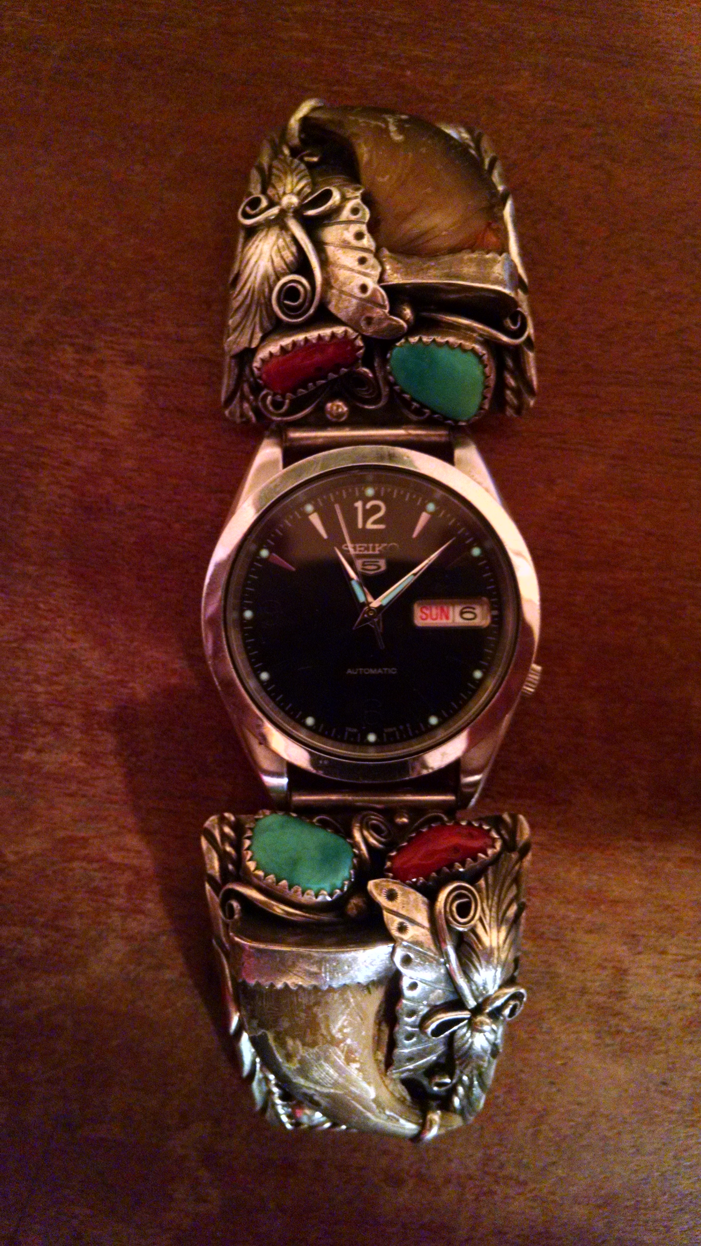 My new Seiko 5 that I bought to go on this old silver watch band I inherited.