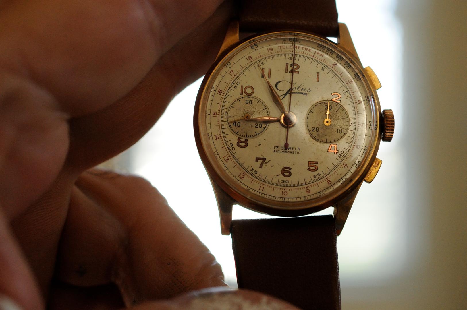 A Jolus branded Landeron 48 in a 37.5mm 18k case.