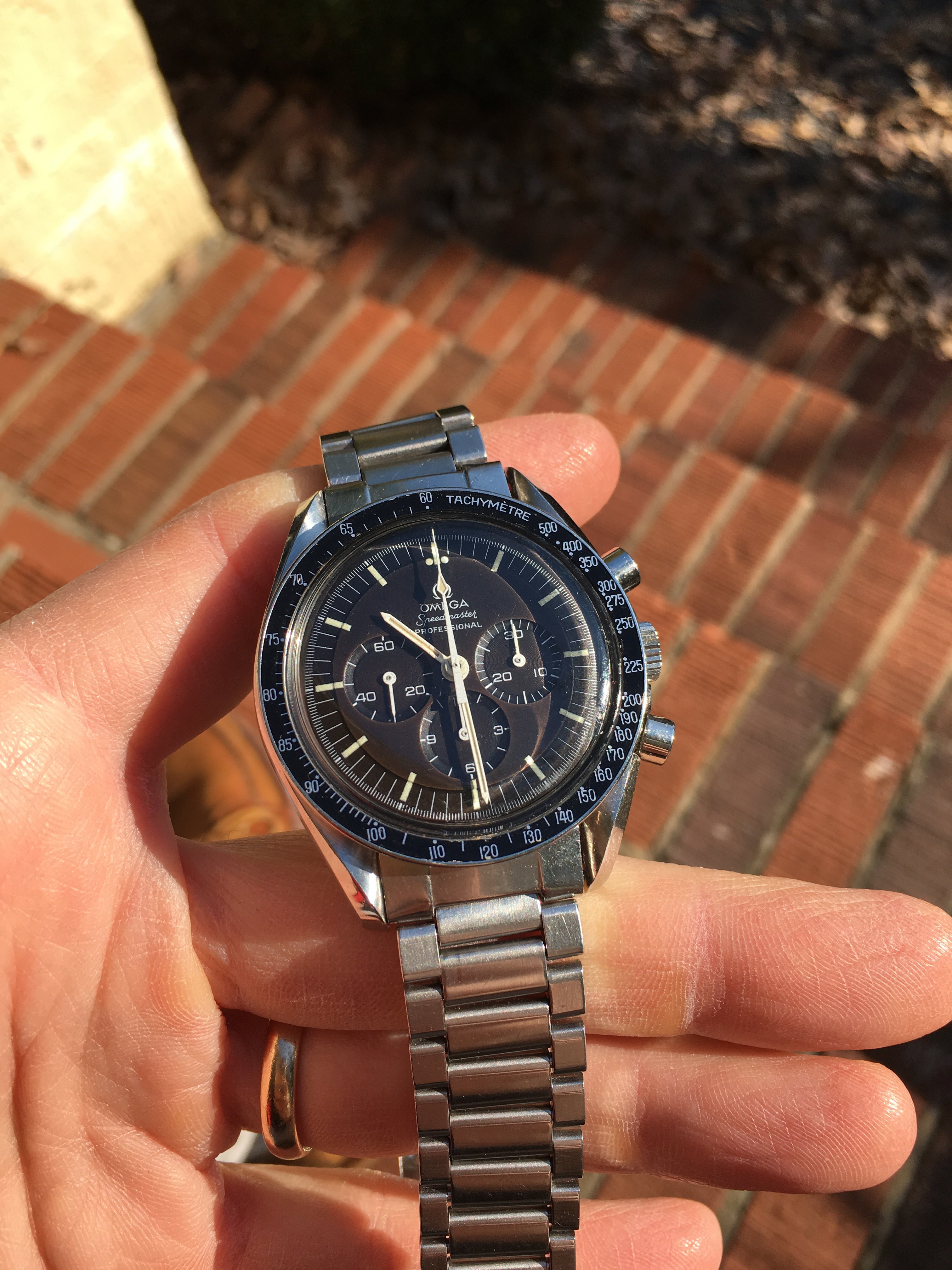 That is a nice looking Speedy. To hone my skills, I'm thinking a 145.012-70 ish? DON, short minute markers, flat tail chrono sweep, printed logo, step dial, and appears to be a 1039 w/ 516's?