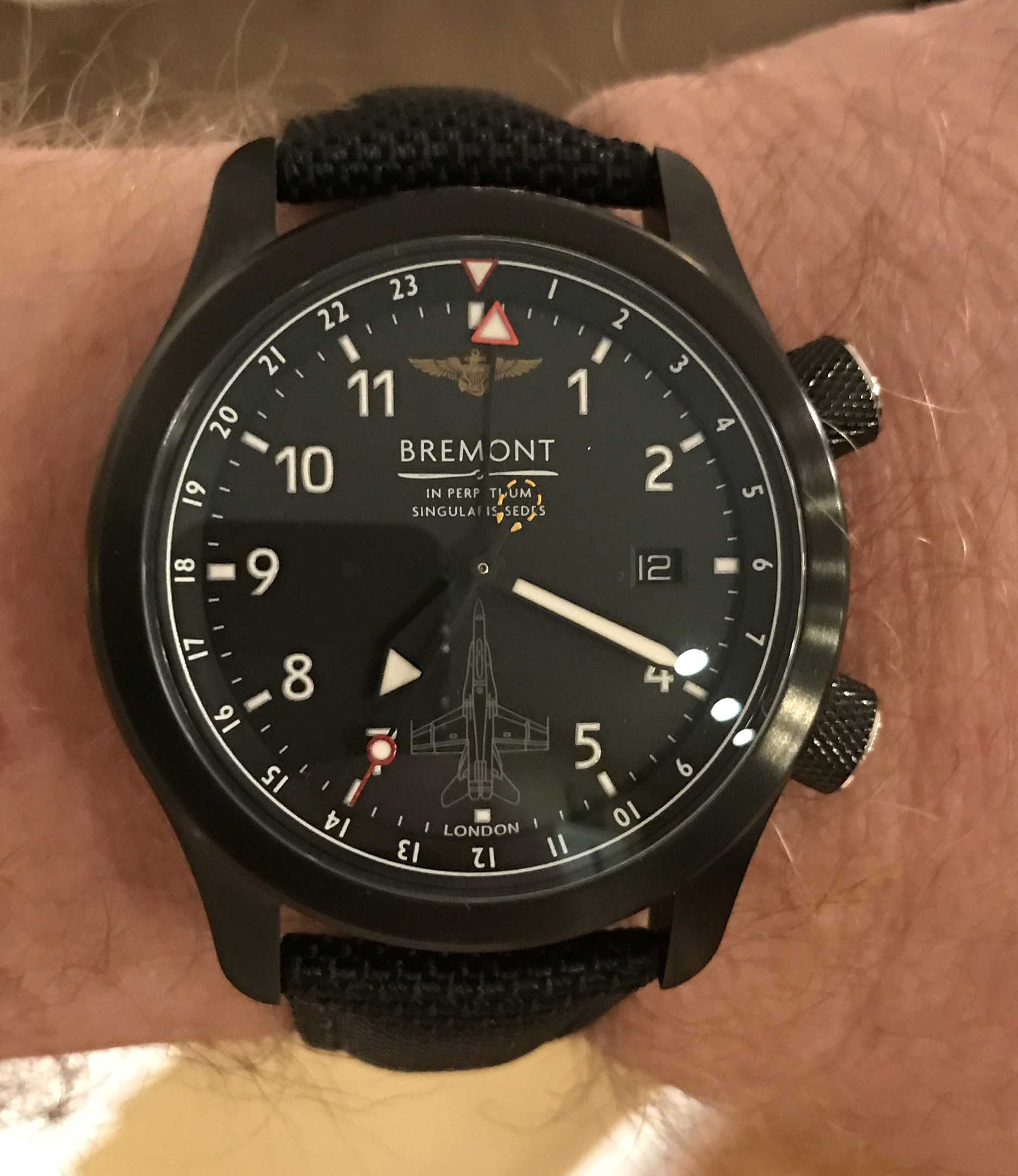 Posts 839 Likes 3,026 corn18 ·Jan 12, 2017 Bought this last September and it finally arrived. Bremont MB III F/A-18C. It's titanium and weighs very little. Kevlar strap is stiff as a board. Love it.