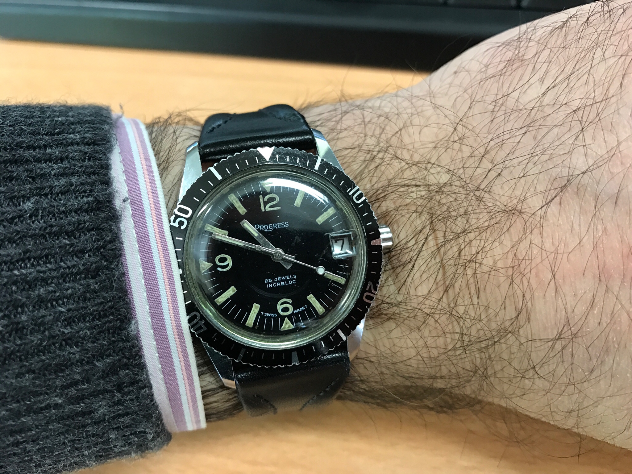 ...and to compete with the Tudor Sub above: a genuine Progress Sub [emoji28] Lollipop hand, small triangle economy version. Yes I know, but even in hard times, the addiction needs to be fed. And hey, I'm a sucker for cheap vintage divers. Here, I said it!