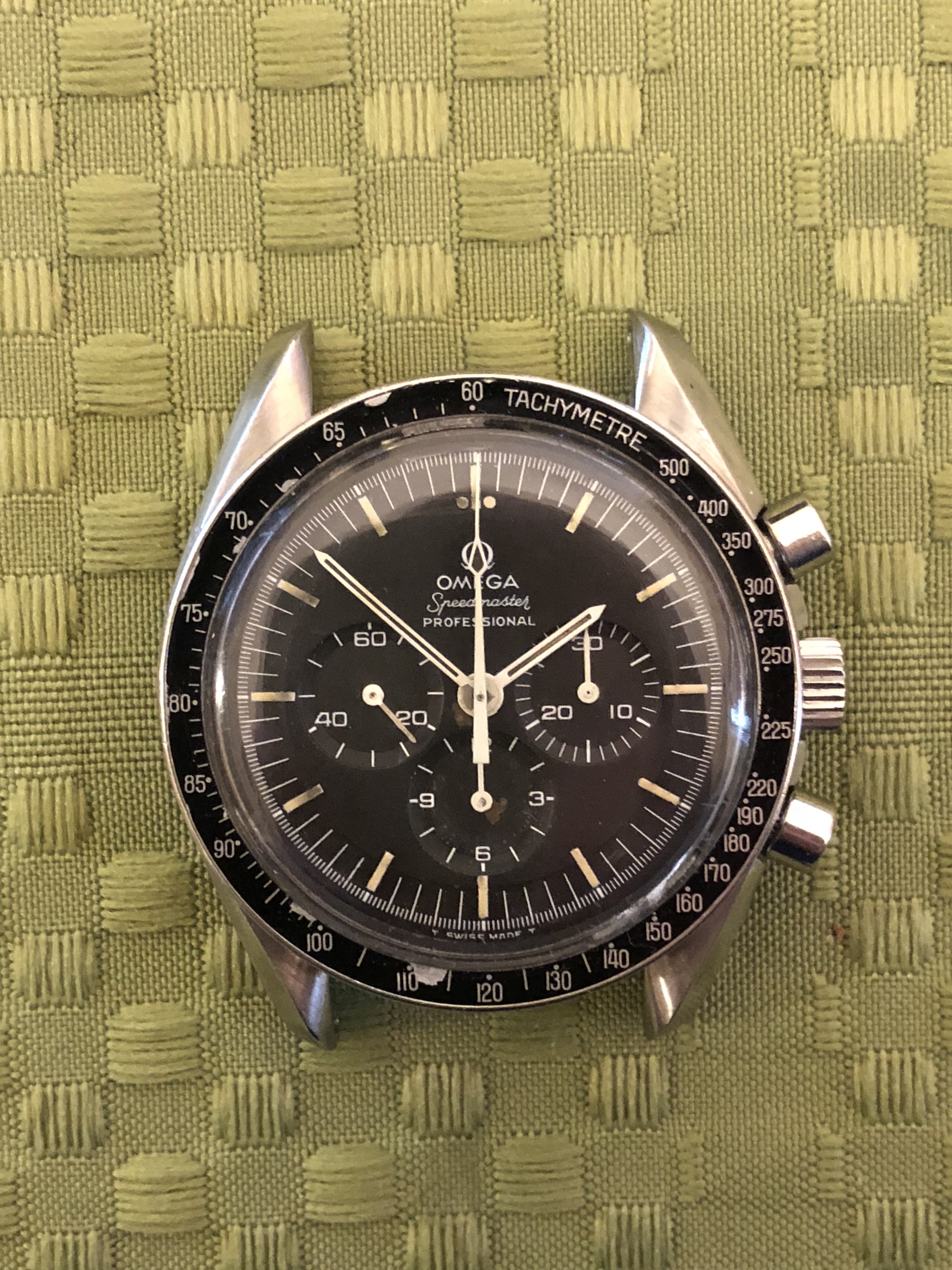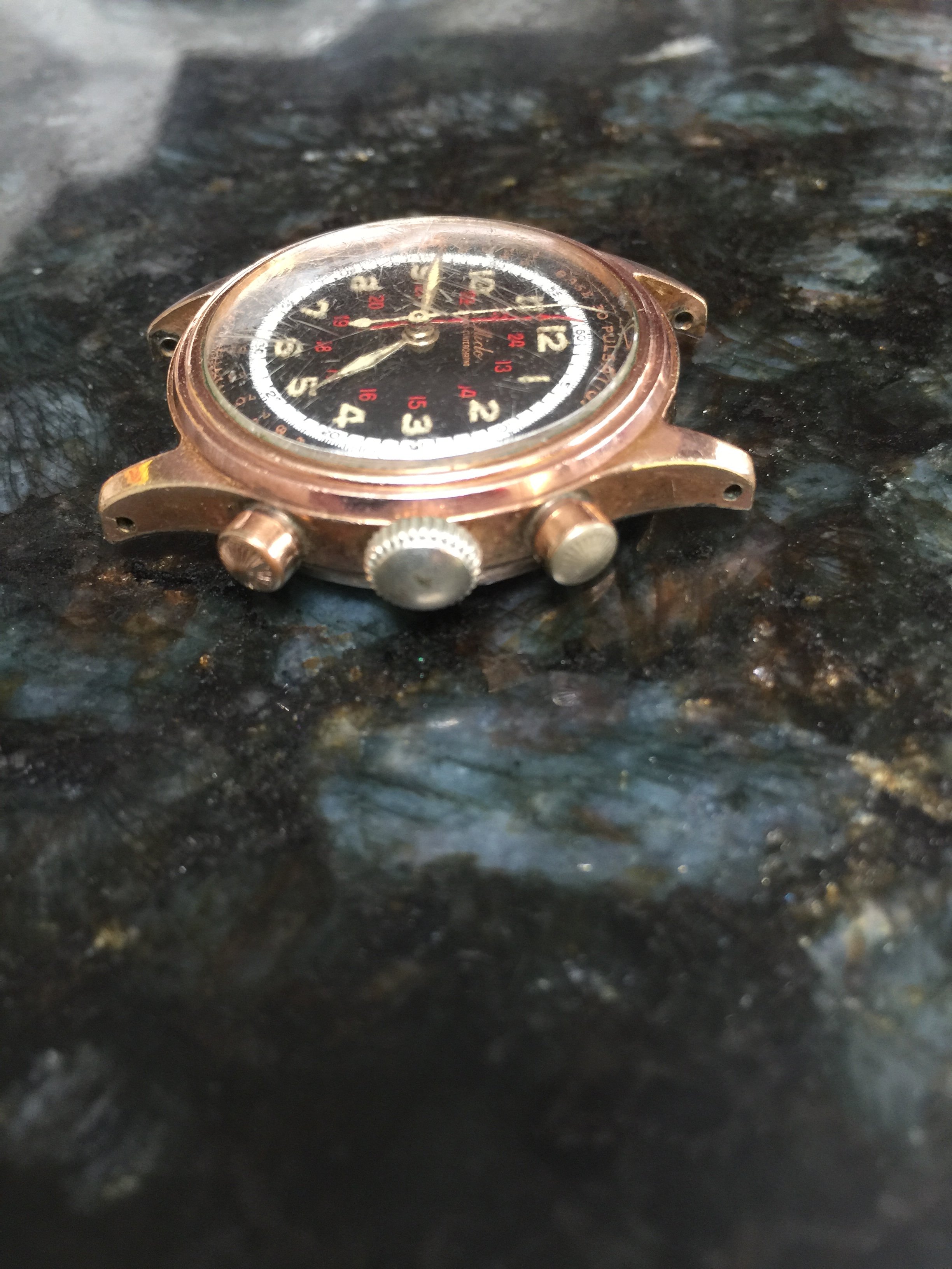 Failed foster watch. Dre sent this to me two months ago for TLC at my watchmaker before shipment to OZ. The arrival of several amazing grails at Casa Dre has added this one to my stable. Looking forward to its emergence from the shop. DOA, loose tip on lower pusher and in need of a new crystal but will clean up well. They are also sourcing a crown. I have an extra upper pusher but we decided it would look odd. So will hold for future reference. Dre has dibs.
