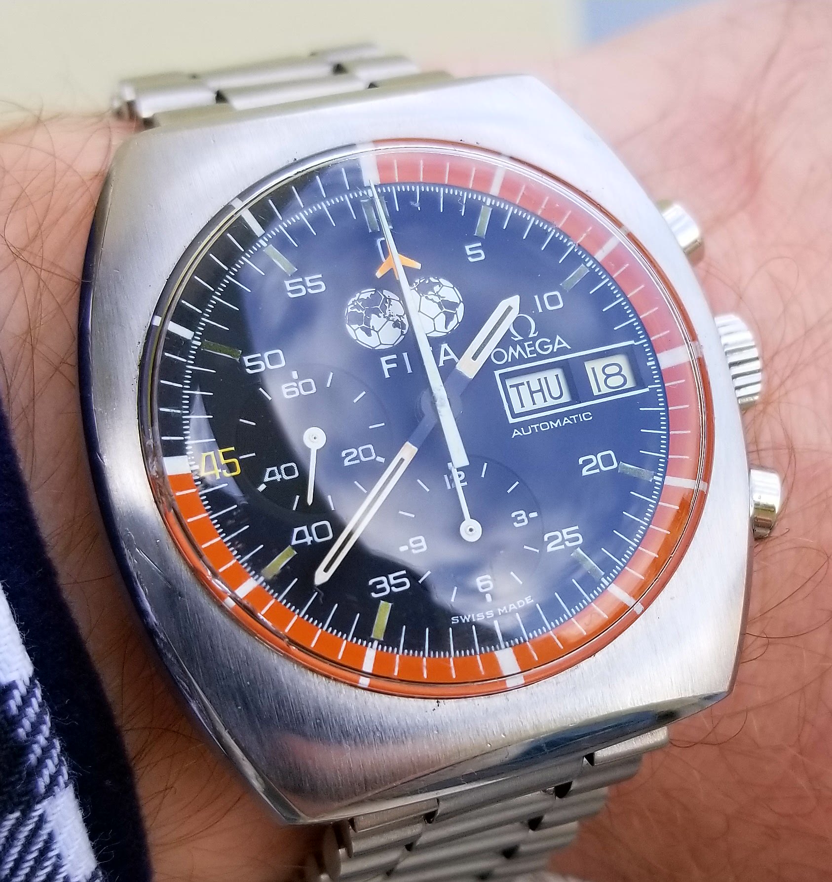 Just as I found it a few minutes ago. I picked it out of the bin, wound it and it started running, so I bought it. After spending all day Tuesday checking out over a dozen pawn shops and antique stores for Omegas or Longines and coming home empty handed, I run into the local thrift on the way to pick up my daughter and I find this very 70's C case Caravelle, by Bulova for $5.28 out the door. Cheap, but my first buy of 2018. It won't scratch the itch for long, but if it keeps time, it will be a good manual laborer work watch. I have never thought I cared for this shaped case, but now I will get to wear an inexpensive one and find out on the cheap. Good luck pickin' out there.
