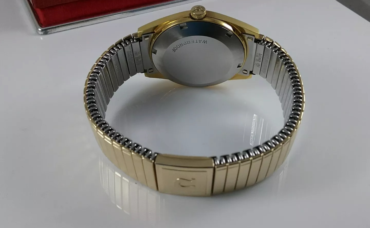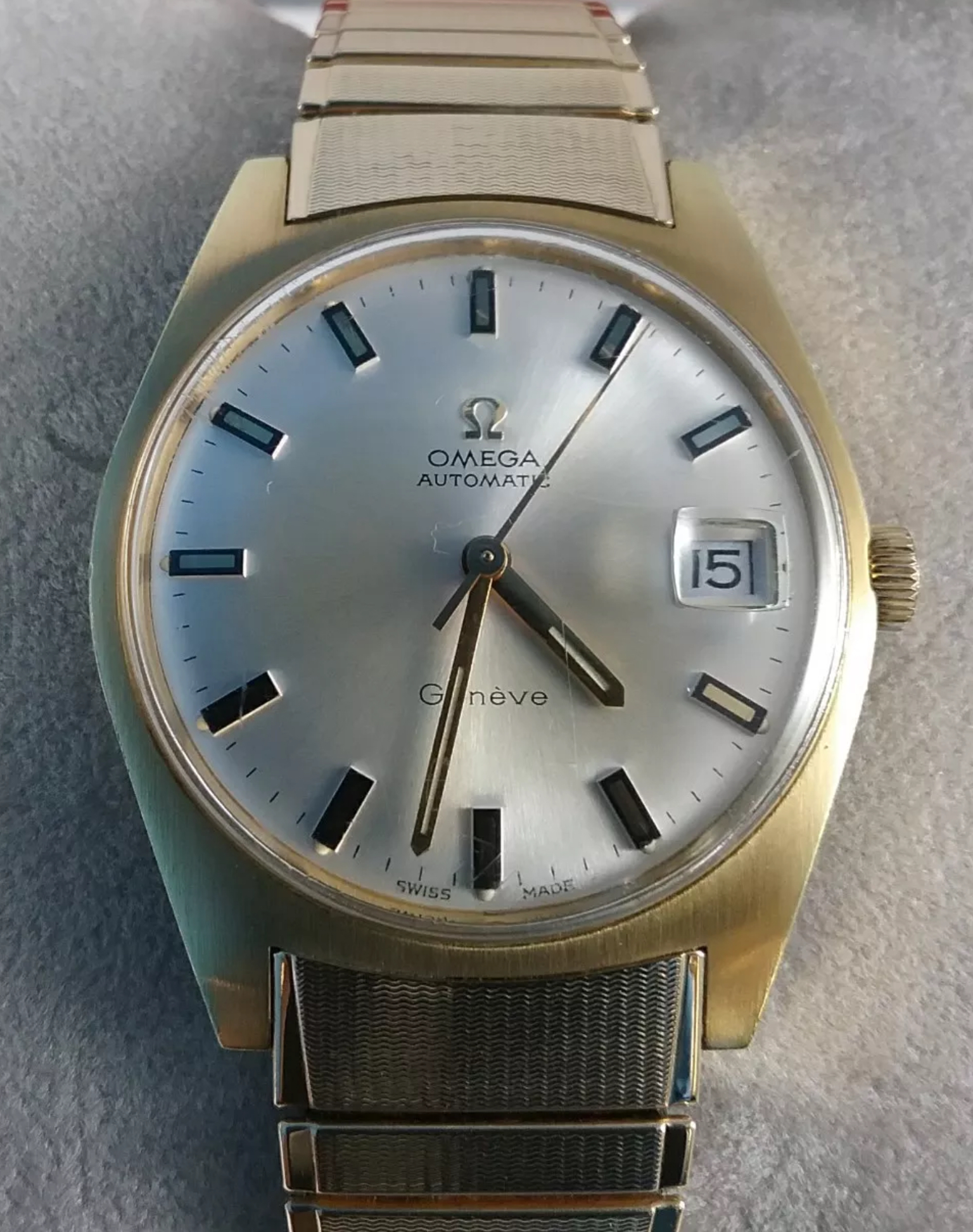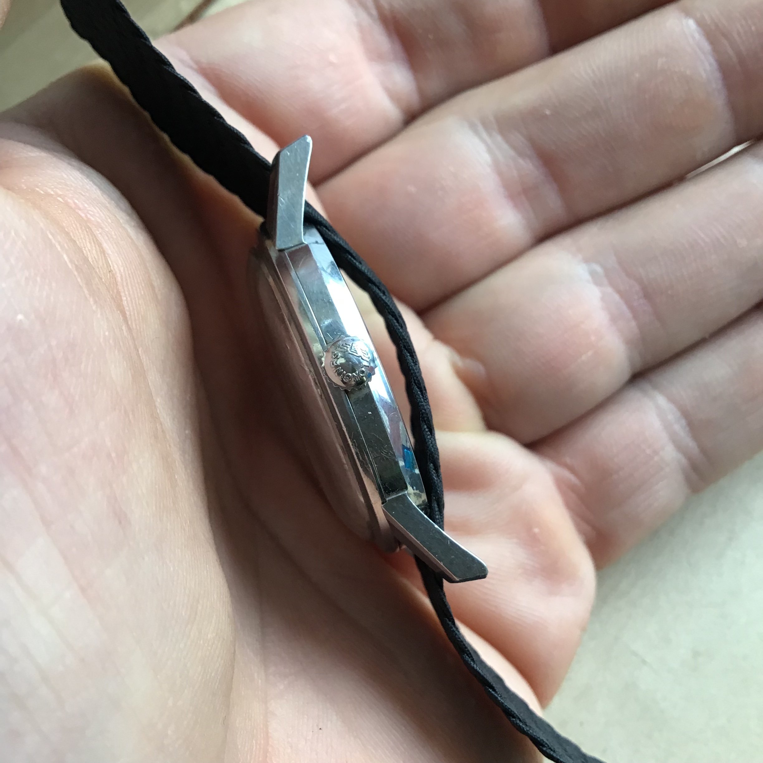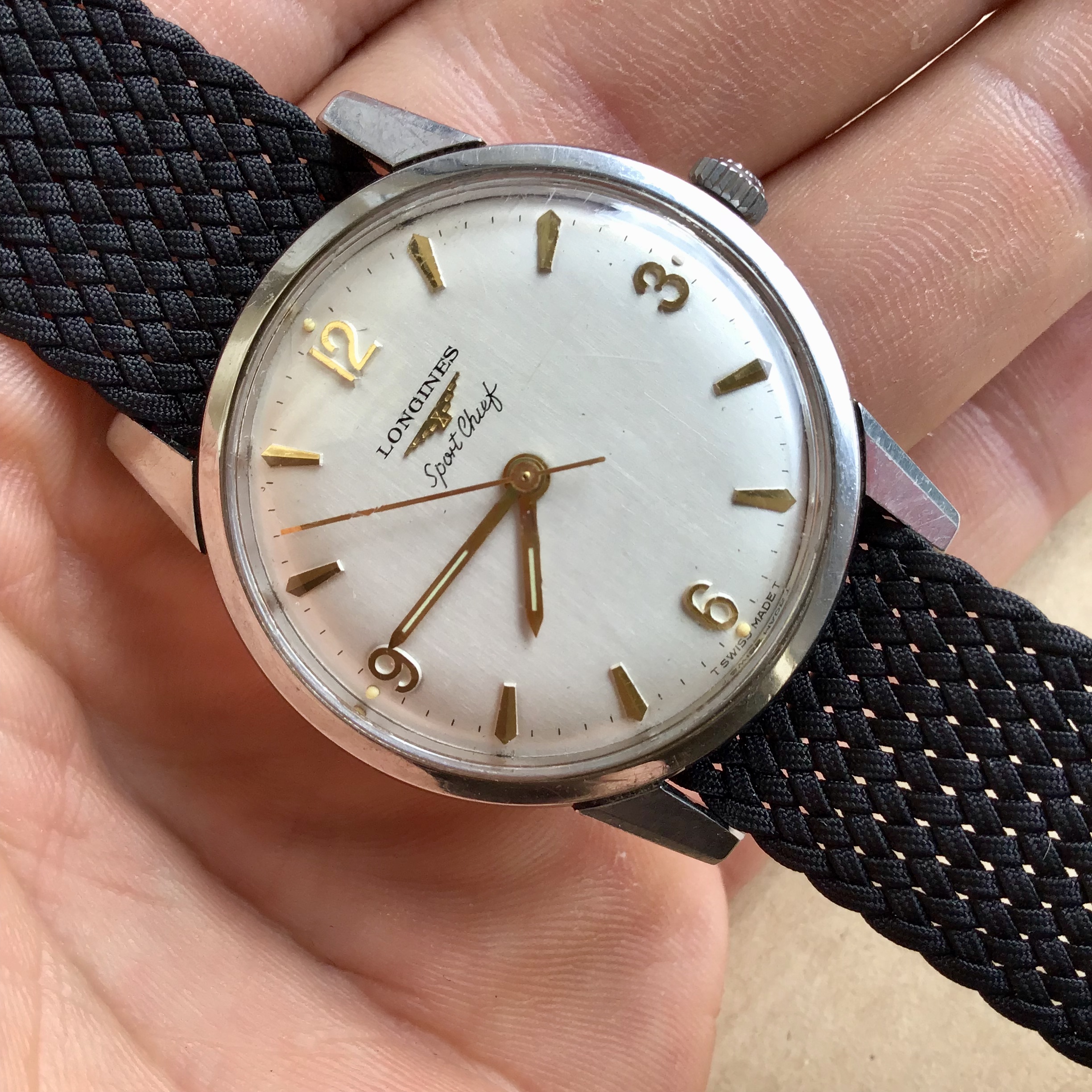 This seems a little chunk for a 35mm watch, heavy for its dimensions. Gives an impression of quality though it's been heavily used over the years. The dial is quite nice, a little creamier looking than the light on my firearms work bench shows. Markers and applied logo are in a pleasing rose gold and the aged lume plots give a pleasing effect. The stainless steel case shows the wear of years of use.