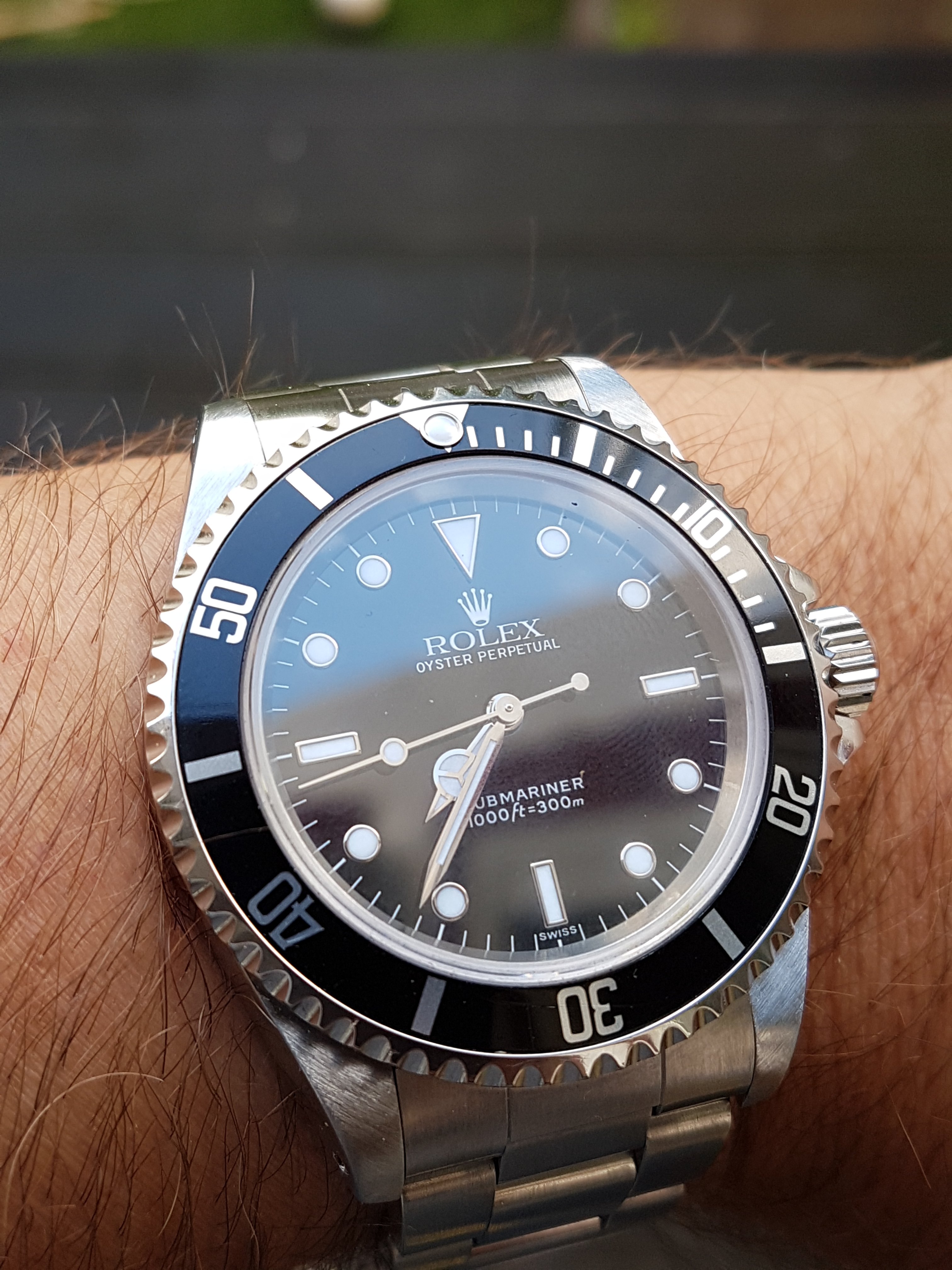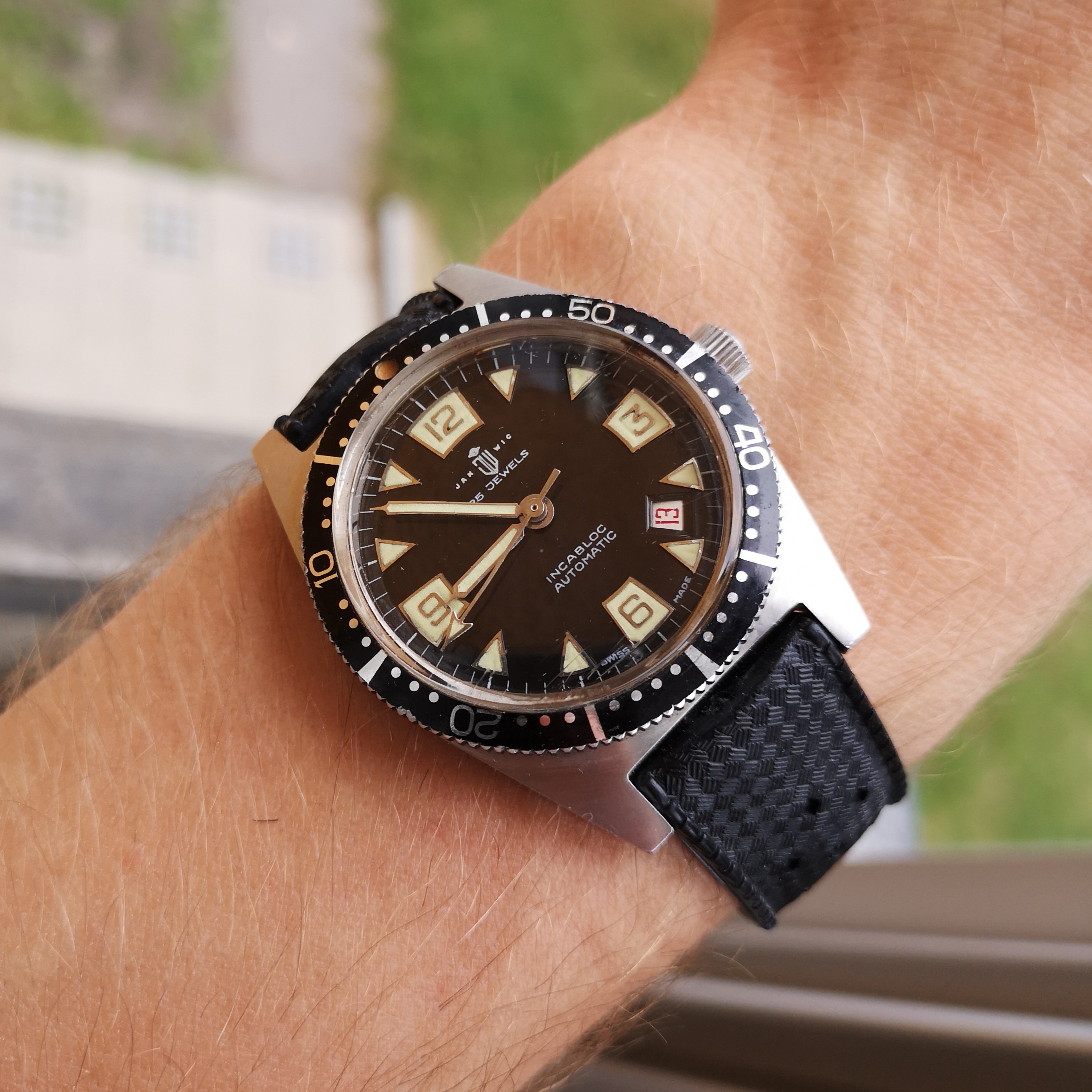 38mm SS Skindiver with glossy black dial and cool indices (White spot on crystal). Note the fresh Rubber strap... 馃榿