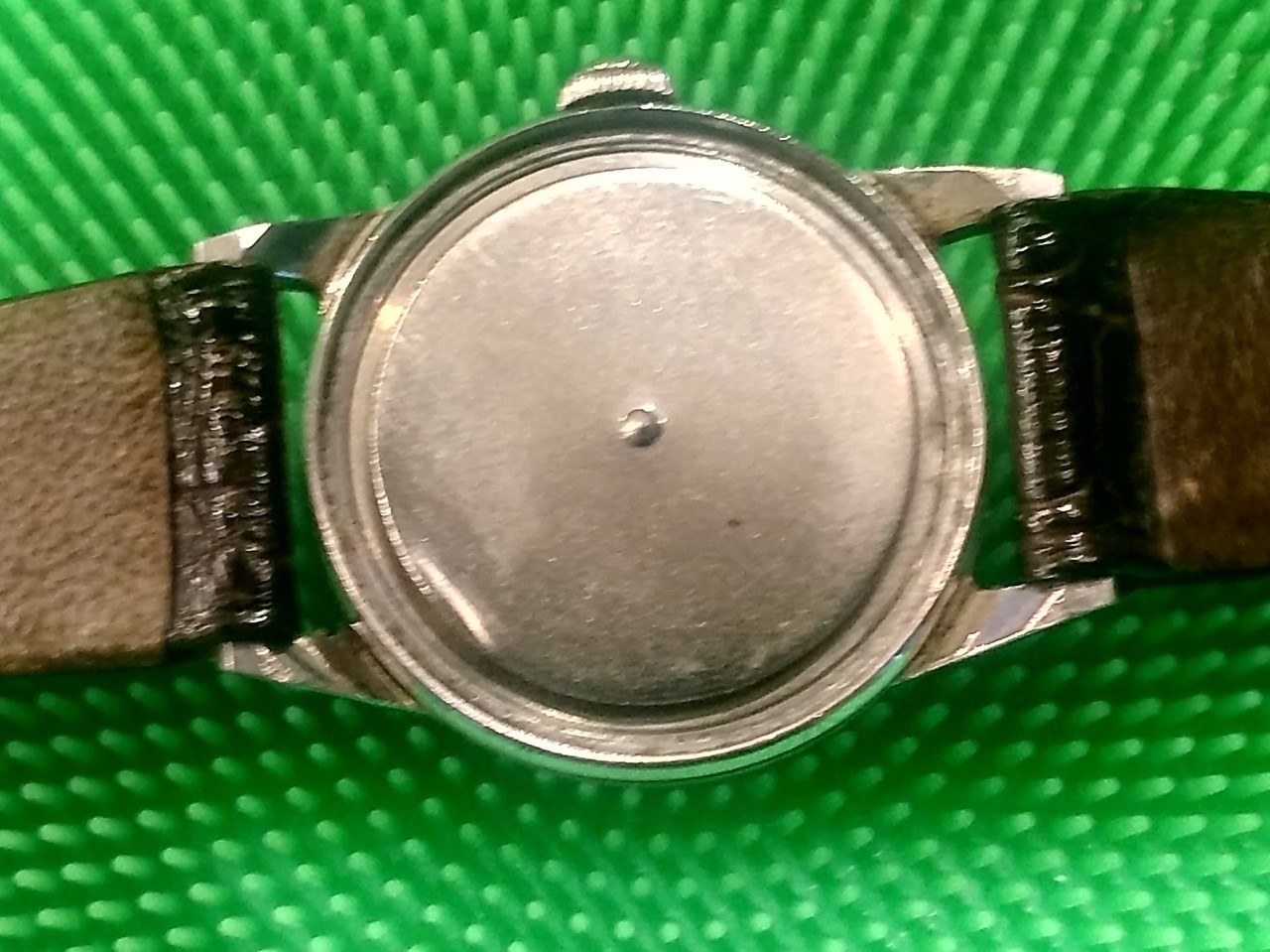 The watch turned out not to be a Rolex but, rather, a handsome Movado powered by what I believe to be the company's 470 movement. The case is a stainless Borgel and has a screw-in case back. My watchmaker opened the case, got the watch running, and gently cleaned the dial of deteriorated lume from the hands....gratis. Thanks Mac!