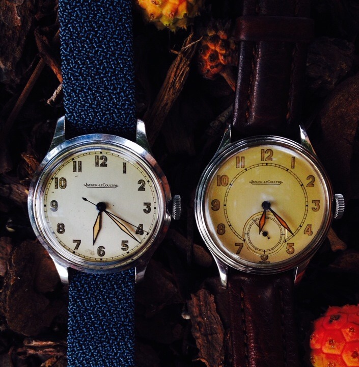 A 1940's Jaeger LeCoultre, caliber P469 sub seconds, stainless steel case. Also shown with slightly older brother number two, a caliber P468 center seconds, with chromed case. Brother number three, a LeCoultre caliber 12a (the US market version of the JLC cal. 476, JLC's very first automatic) is at the spa, having his bumper waxed.馃槑