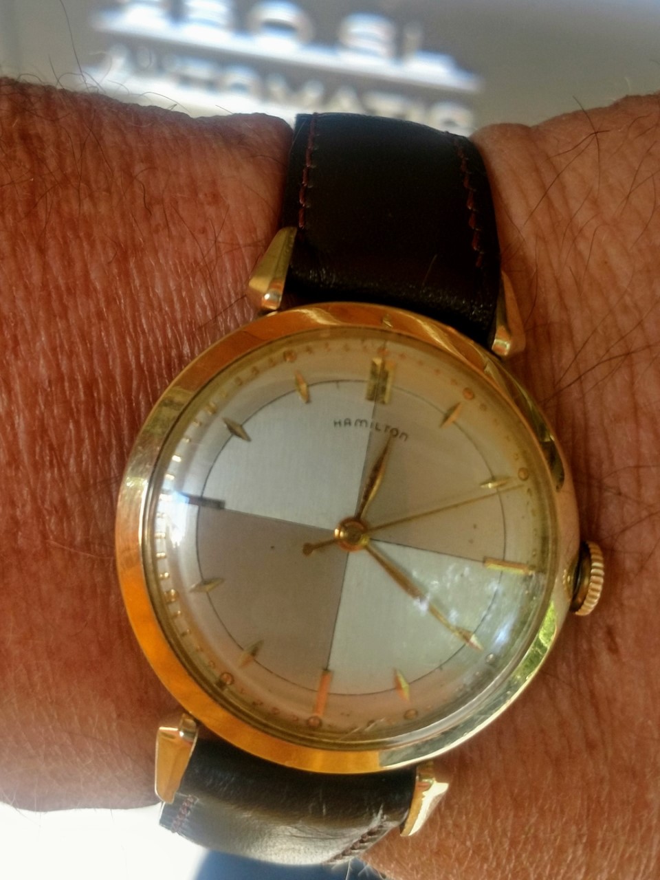 Given the above example of the "Safe Driver" presentation "Rodney" -- which appears to have the same lugs/case, hands and crown as your Hamilton -- perhaps your watch is a "Masterpiece" corporate gift/presentation watch. Is there any inscription on the case back of your watch?