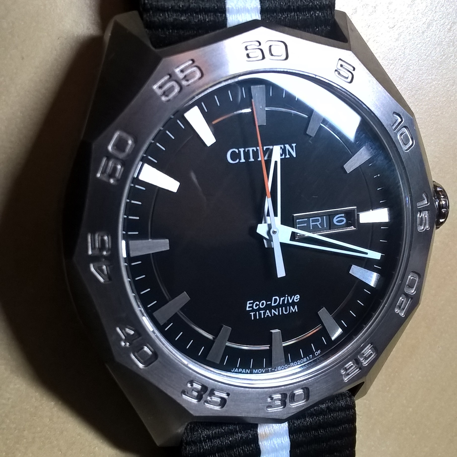 ·Arrived yesterday, Citizen Eco Drive Super Titanium AW0030-03E, the strap, whilst a great match for the watch (stitching matches the orange second hand) is just too big and chunky for my liking (feels like it weighs more than the watch) so put on a NATO which I think is a nice match.