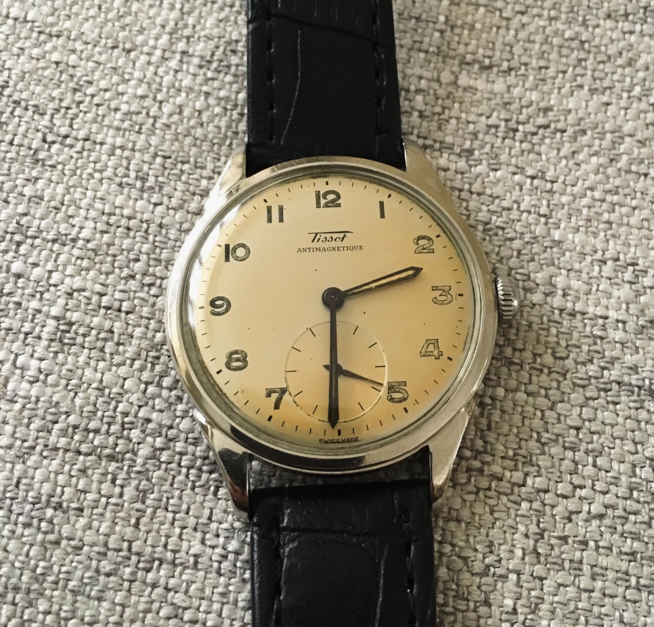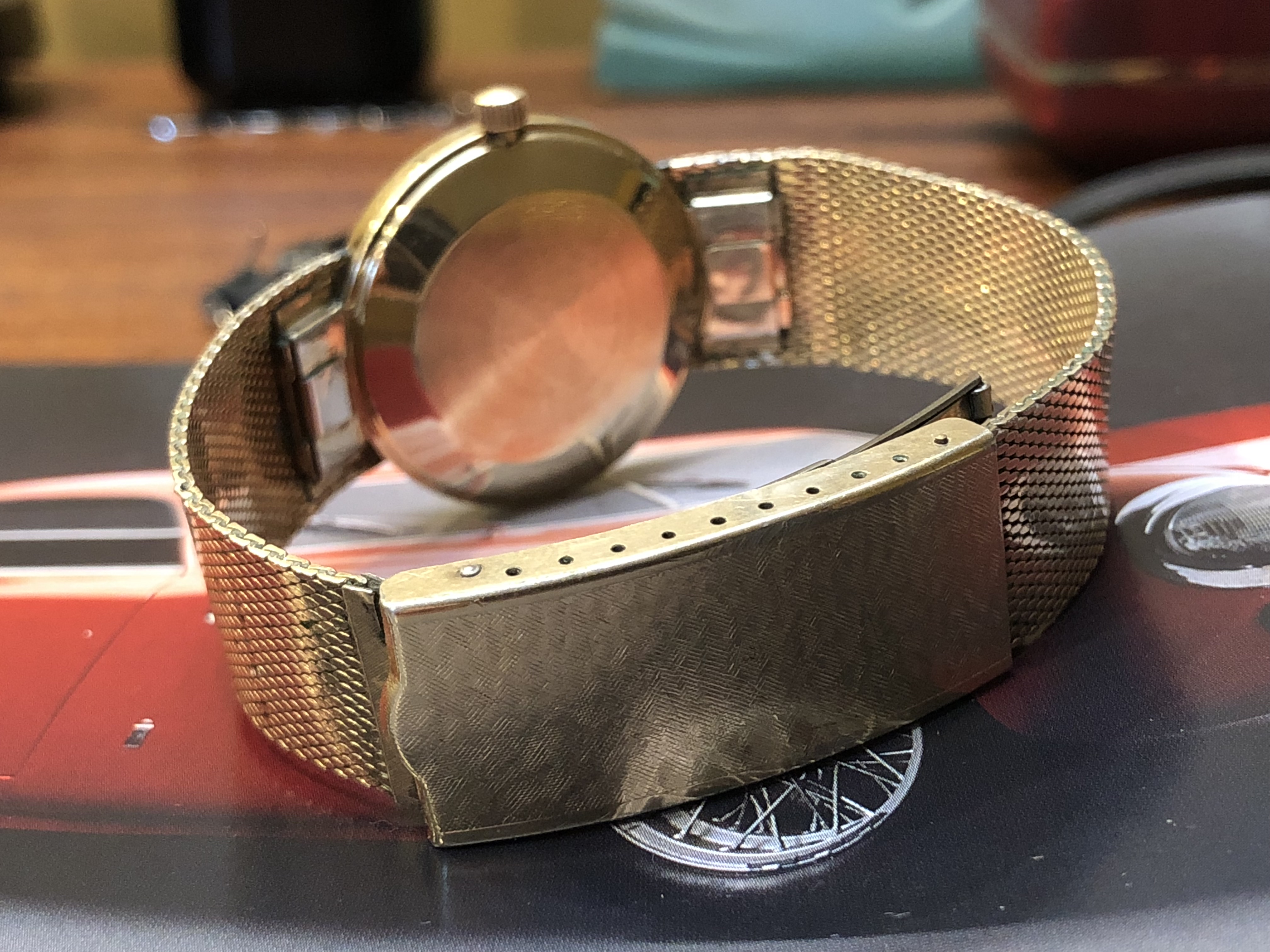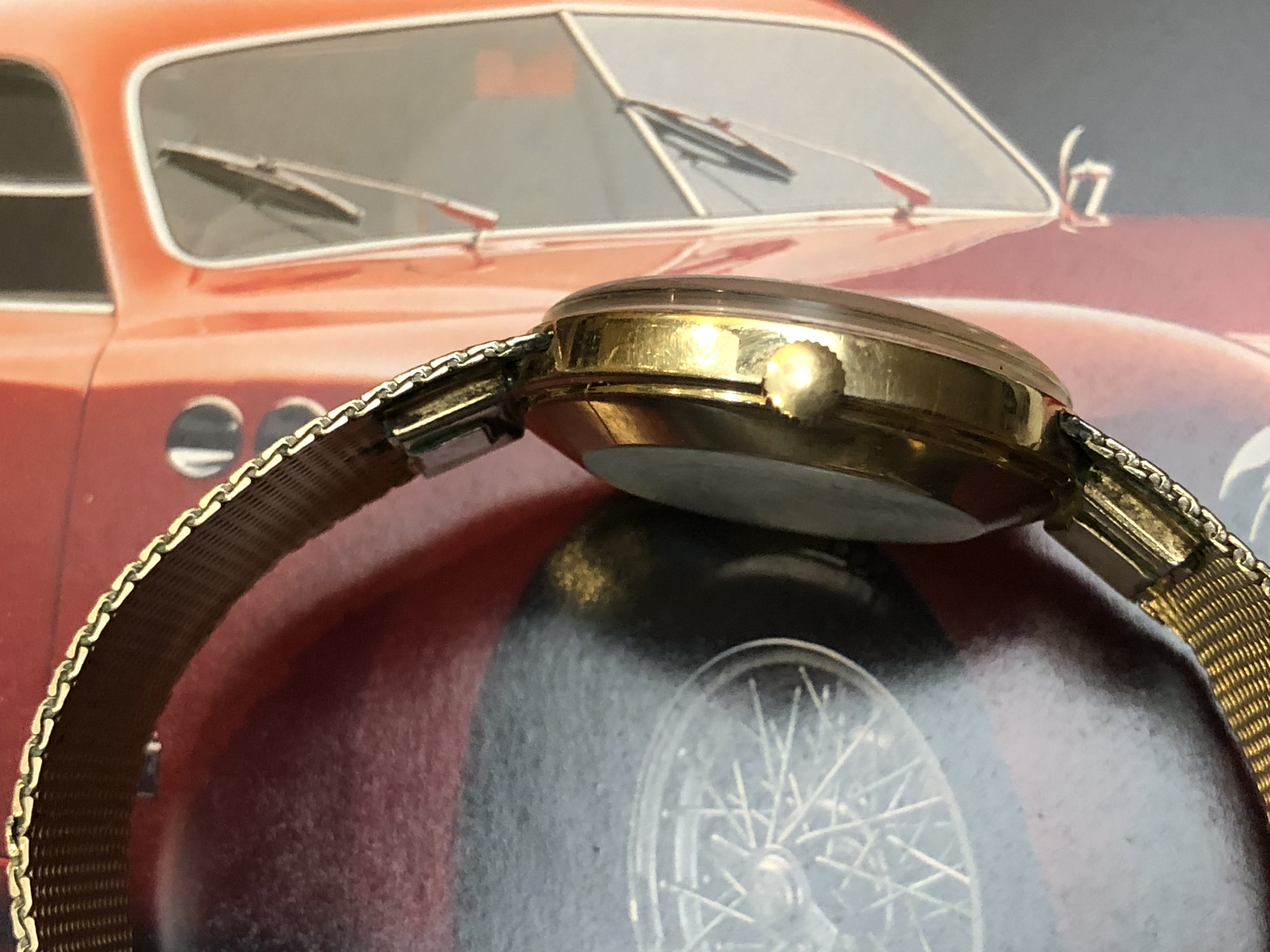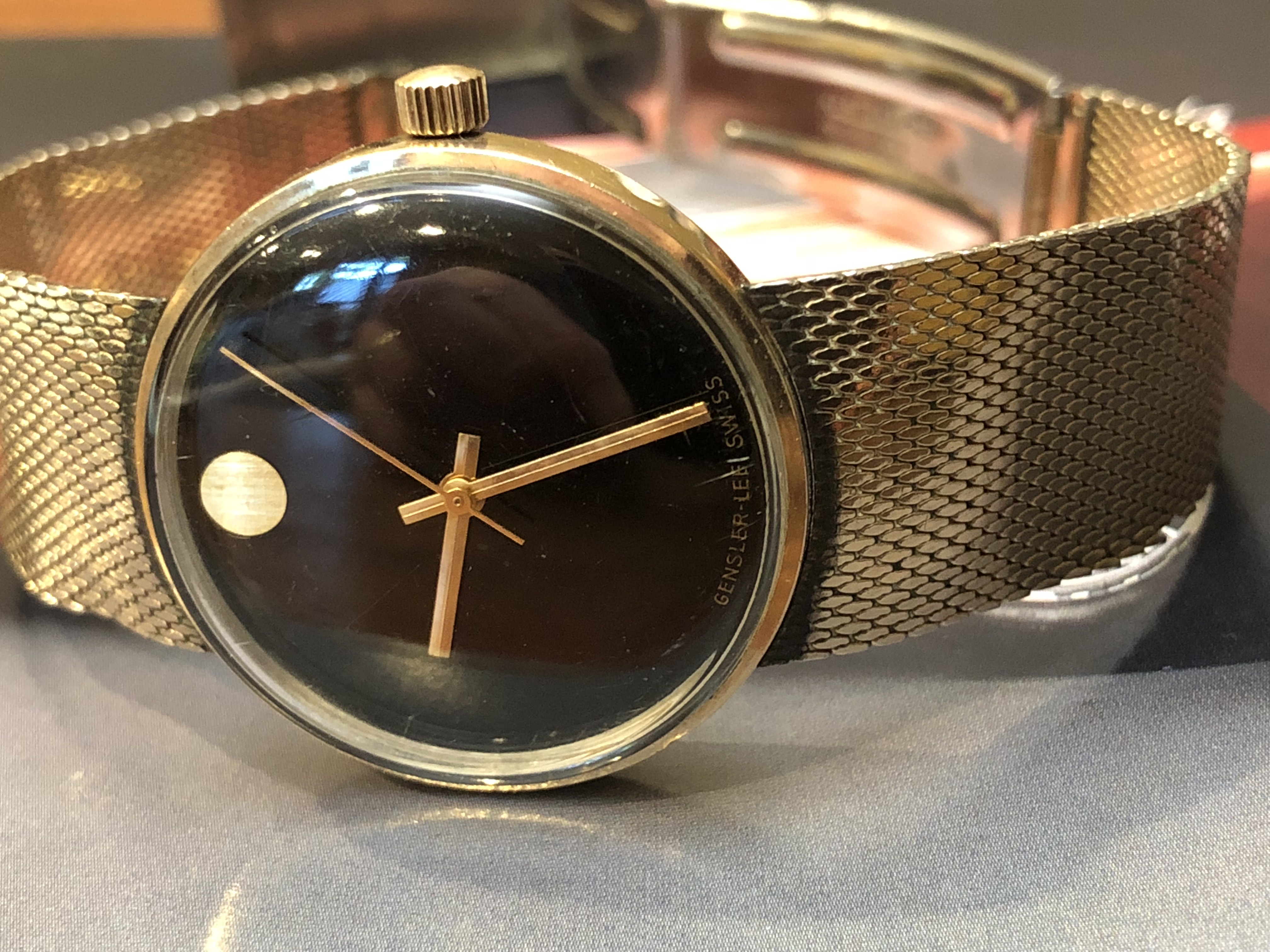 At first glance the watch appears to be a Movado "Museum Watch". However, the watch is branded, "Gensler-Lee", which turns out to be a higher-end jewelry store chain located primarily in California. The case design, and it being 10 karat gold filled, led me to believe the watch was circa late 1950s to mid-1960s. The auction listing did not include any photos of the case interior or movement, nor did any of the photos or auction text indicate who might have manufactured the watch, although the dial indicated that the watch was Swiss made. An internet search of the Movado "Museum Watch" piqued my curiosity, and convinced me that the watch was not a Movado.