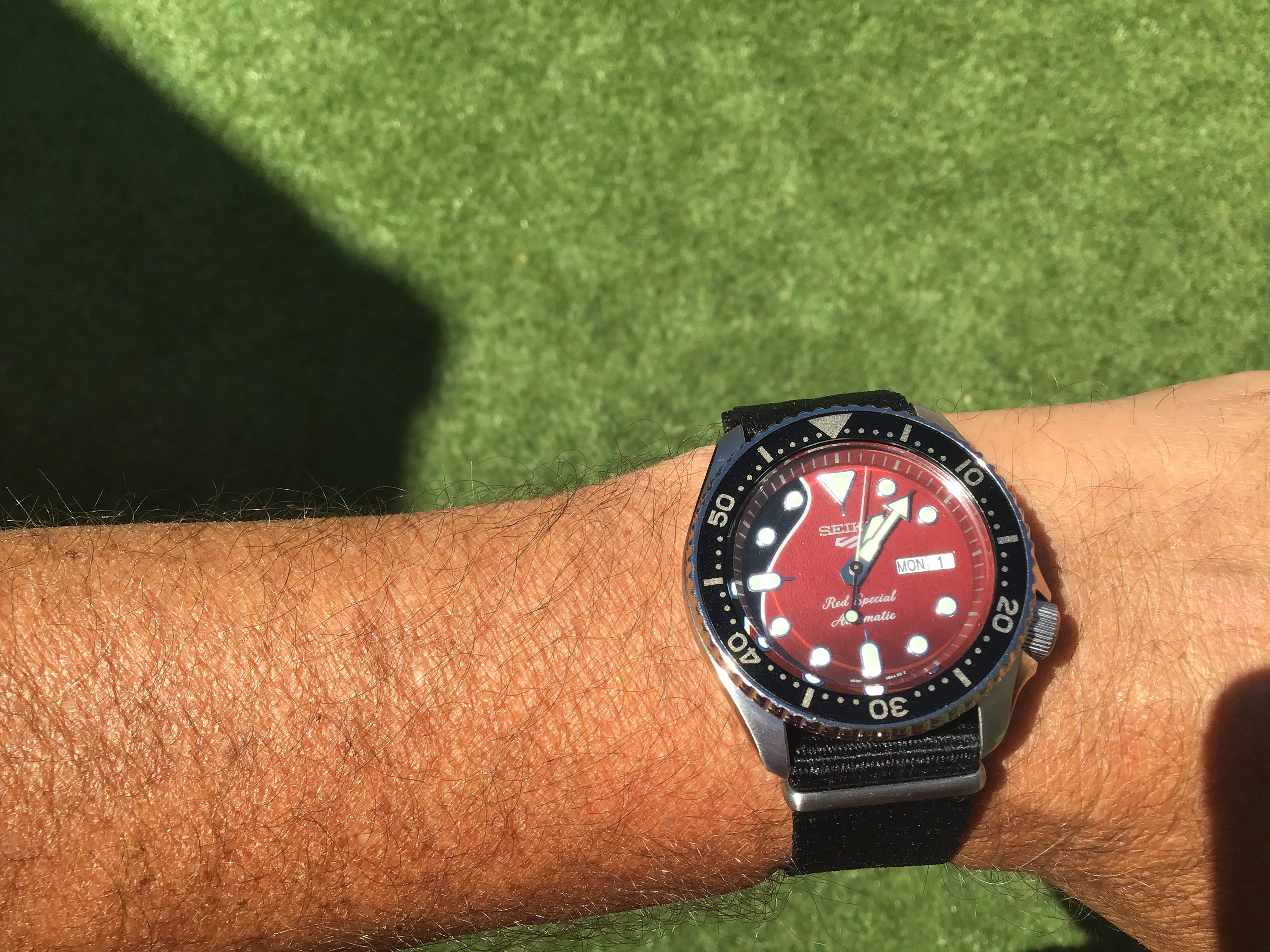 The dials angled, internal minute track is also red and “Red Special” has been added in script on the dial. A Hardlex crystal covers the front, surrounded by a unidirectional bezel with a detailed 60-minute scale. The case is water-resistant to 100 metres.