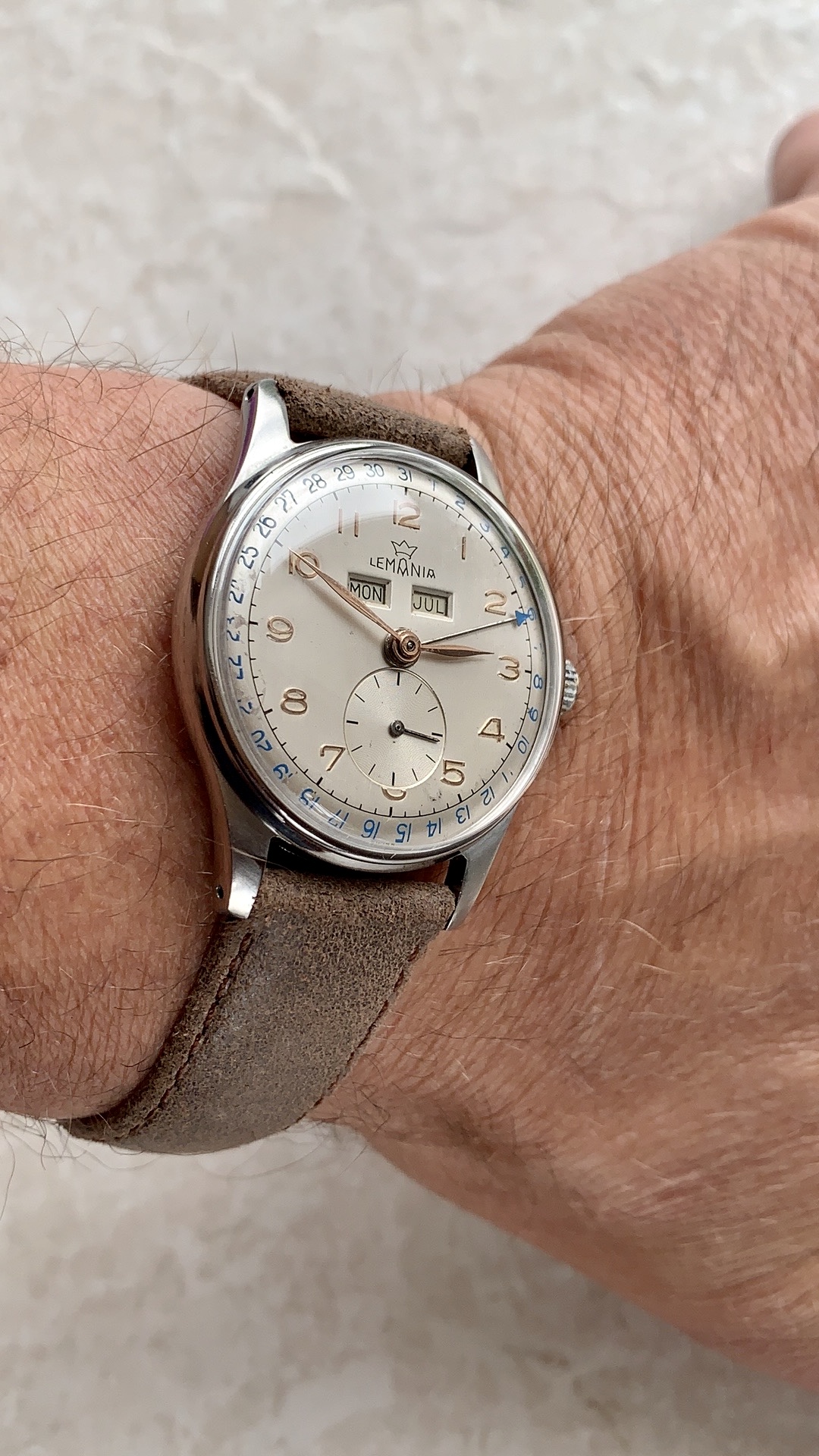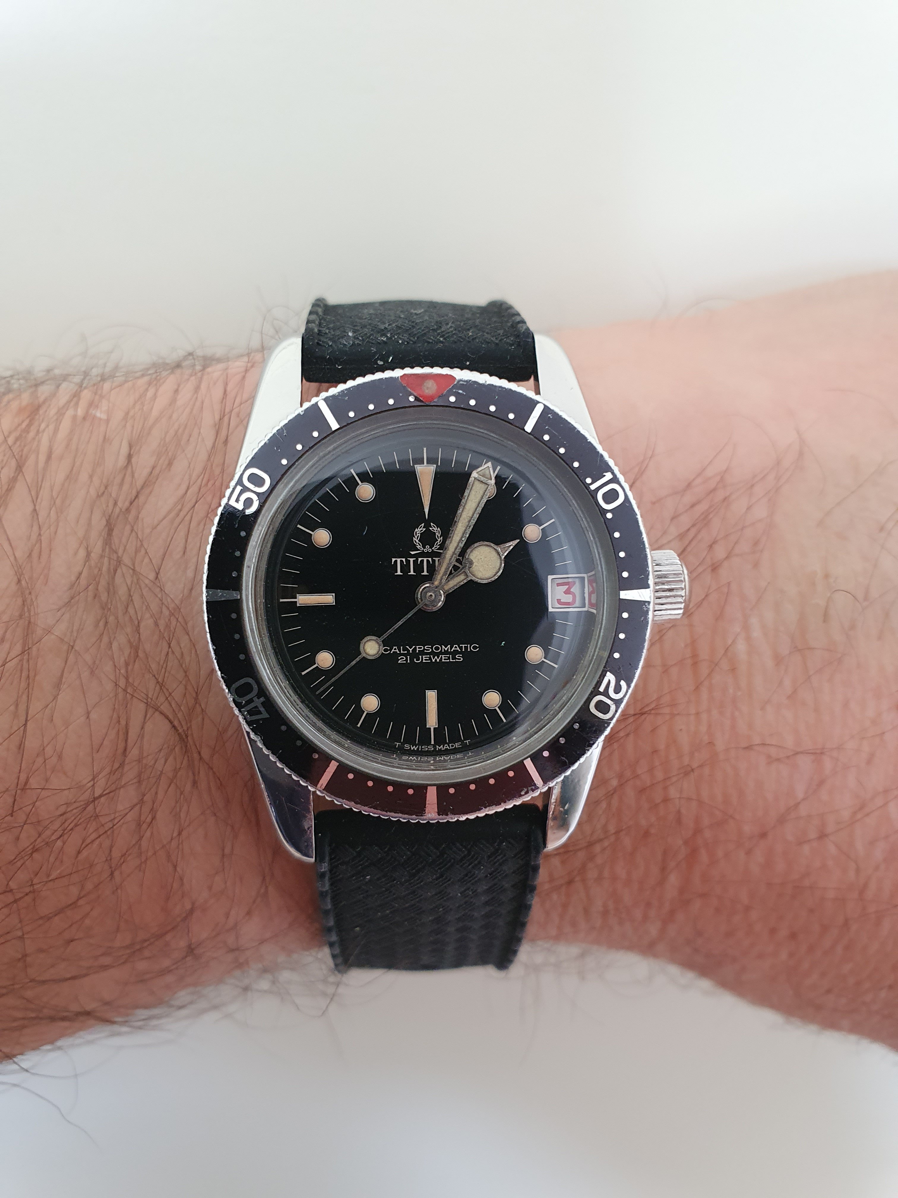 Thanks, got me worried there for a minute 😲. Yes on the Titus Calypsomatics the date alternates between red and blue, nice little feature 👍. The 32mm sits well on a small-medium wrist.
