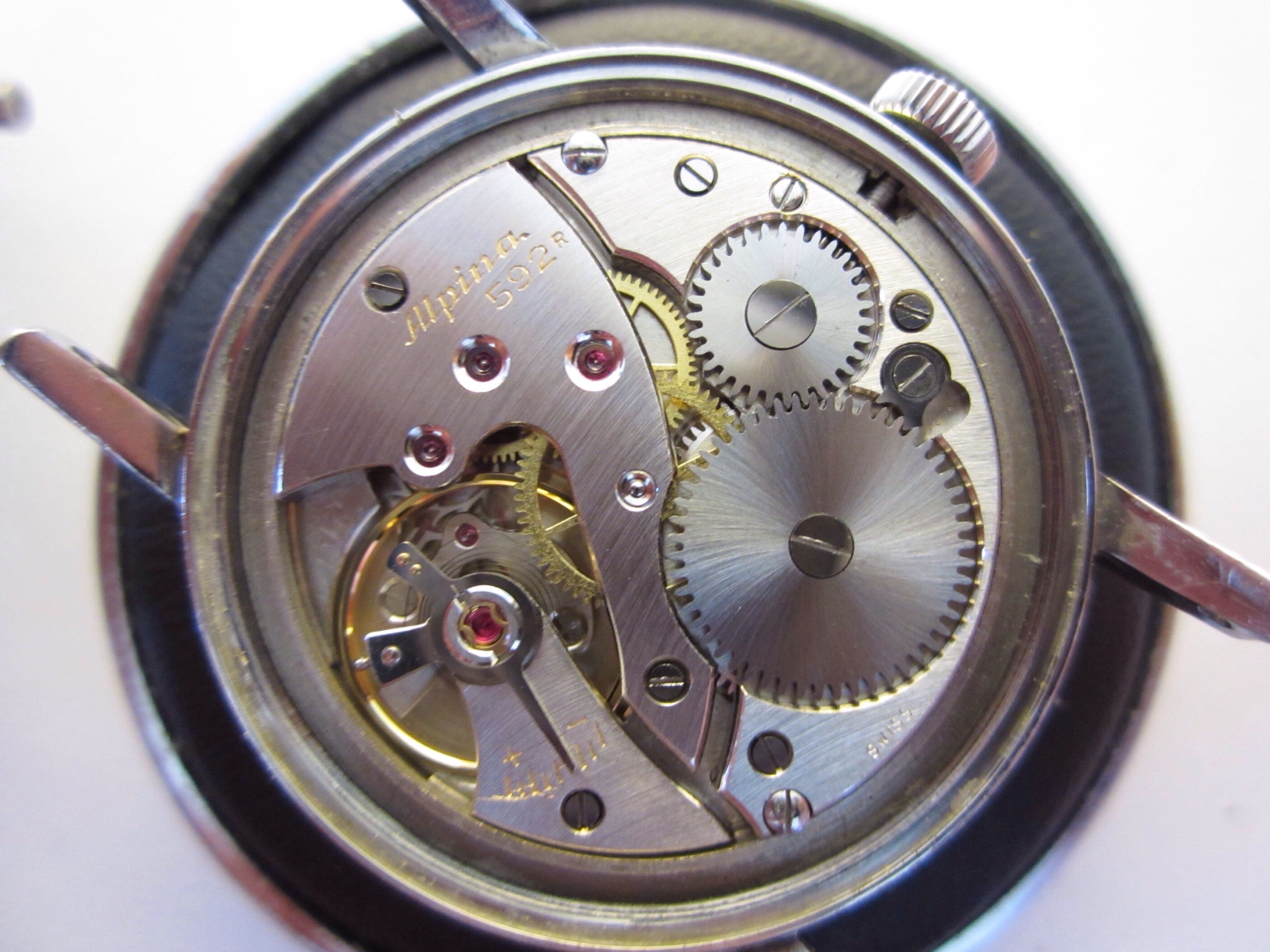 Posted in the WRUW section as well. Alpina cal 592. Picked up at less then we pay for a full case of beer. Movement is prestine (but dry) partly due to the use of a designated dust cover, and dial has aged very gently for a +/- 60 year old watch.