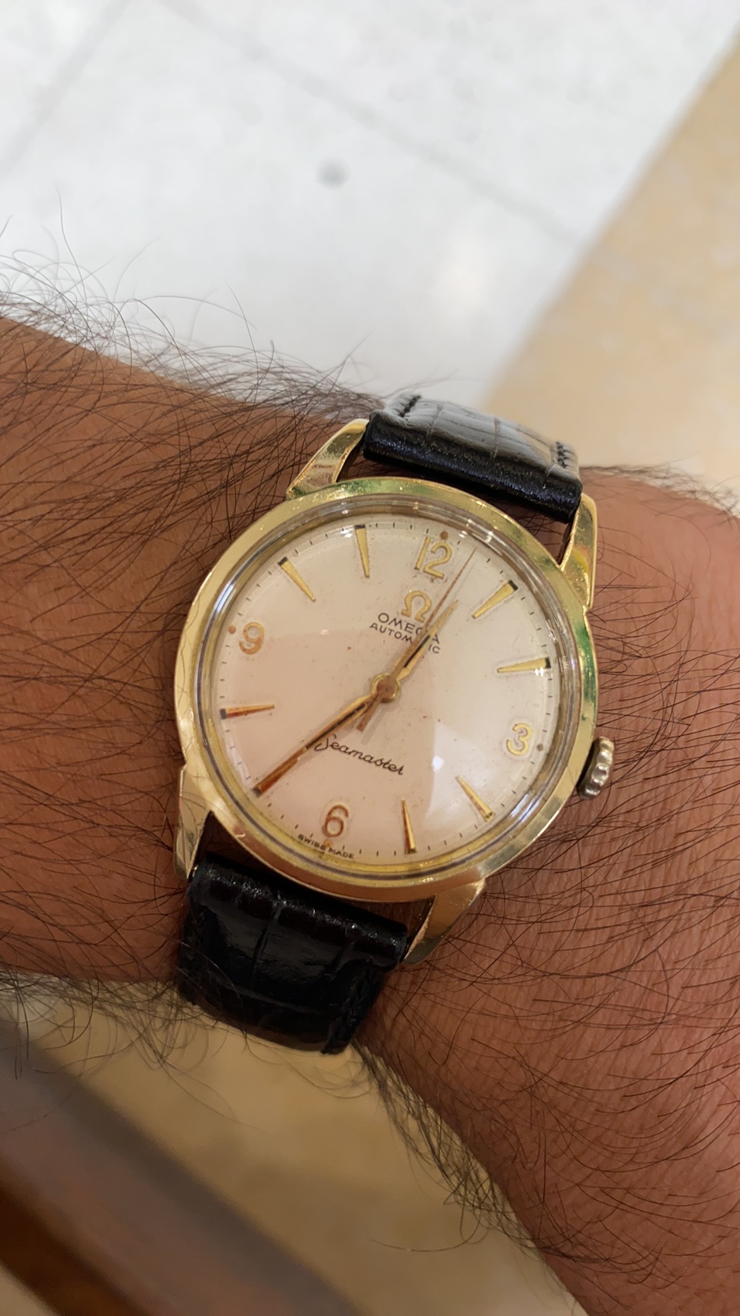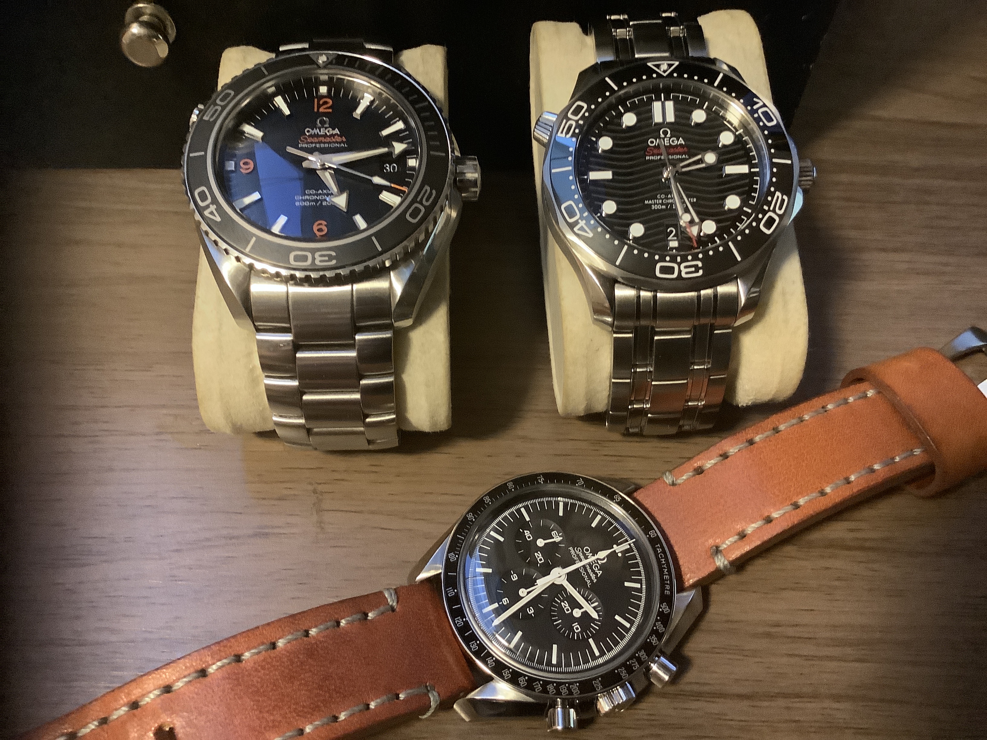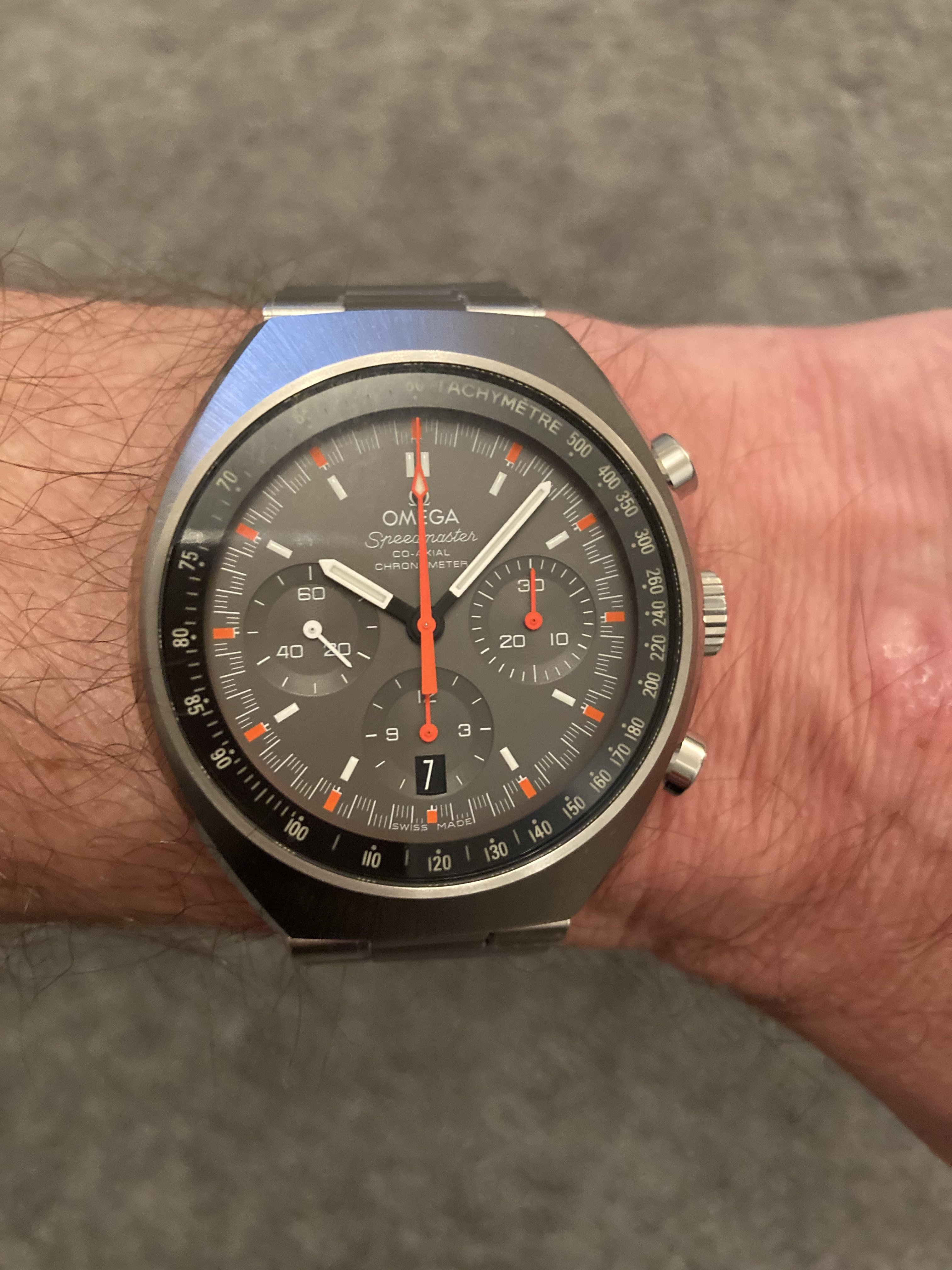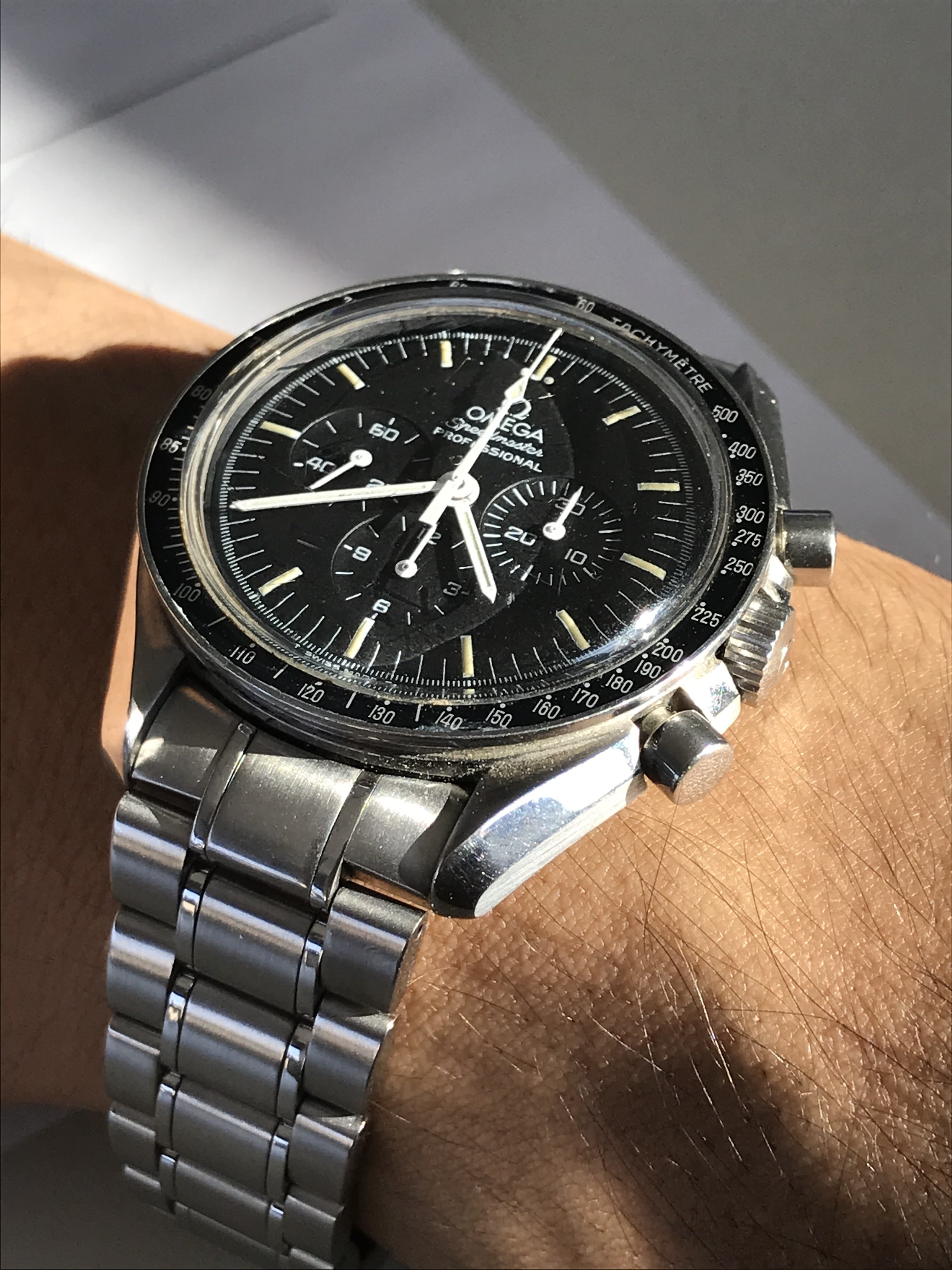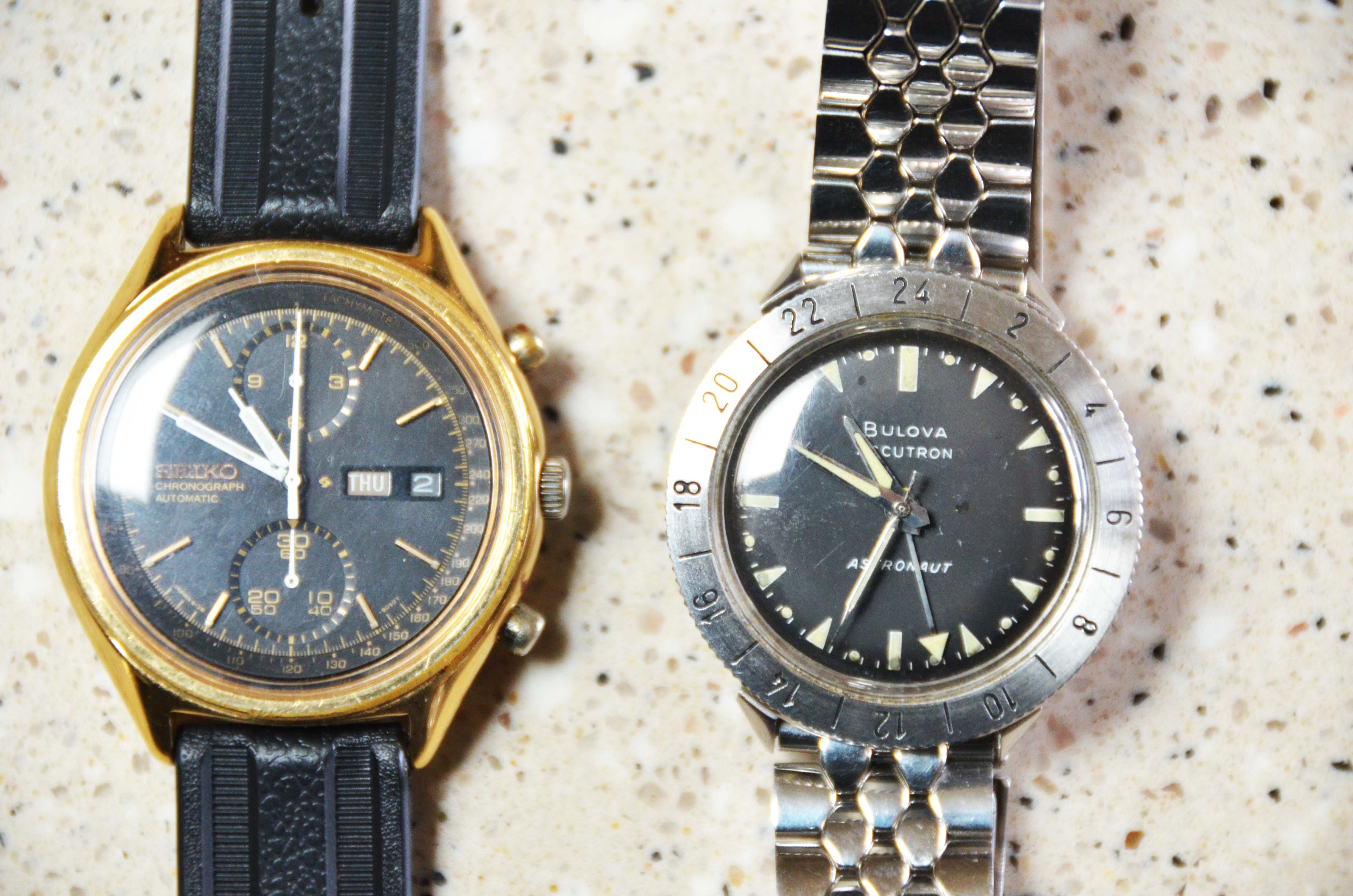 Picked these two up at a local auction. Unfortunately the Seiko has been severely and not at all sensitively polished and the tiretread strap is not genuine, but it's running and the chrono runs and resets correctly. The Accutron is unpolished and unaltered, still with its original coffin link bracelet in good condition and humming beautifully. The pair cost me $AUD1250 ($US925) which probably means I got the Seiko for nothing anyway.