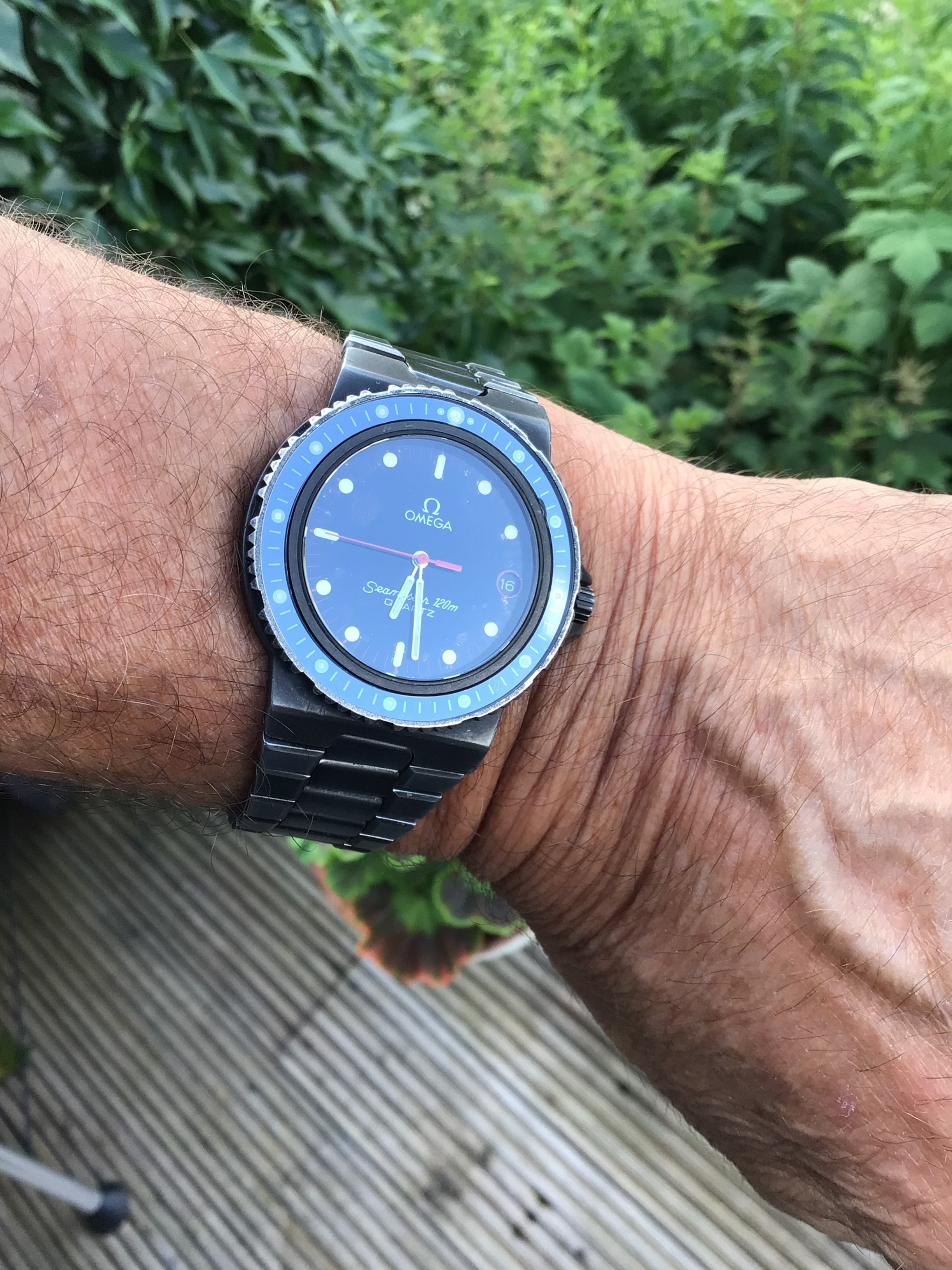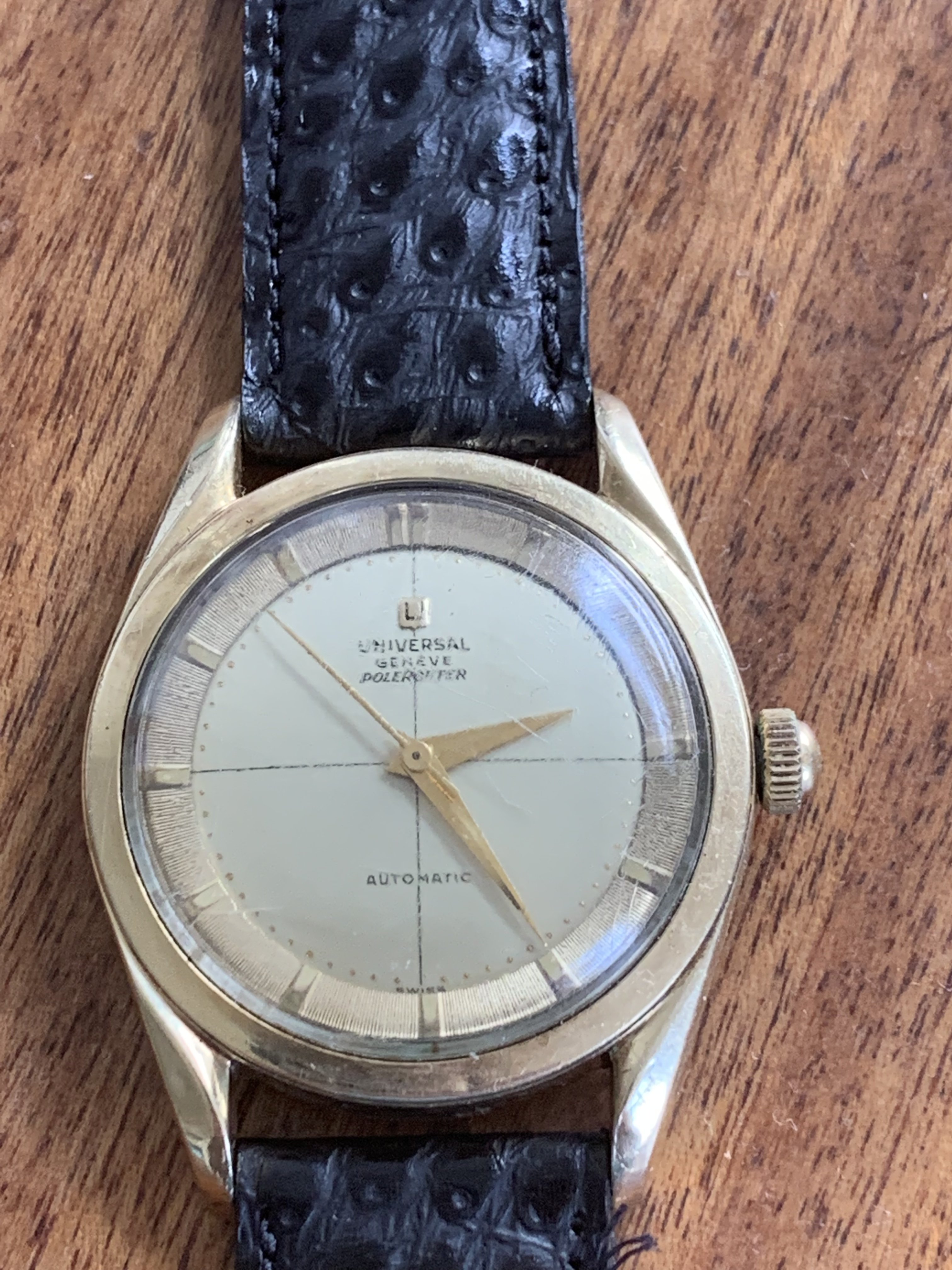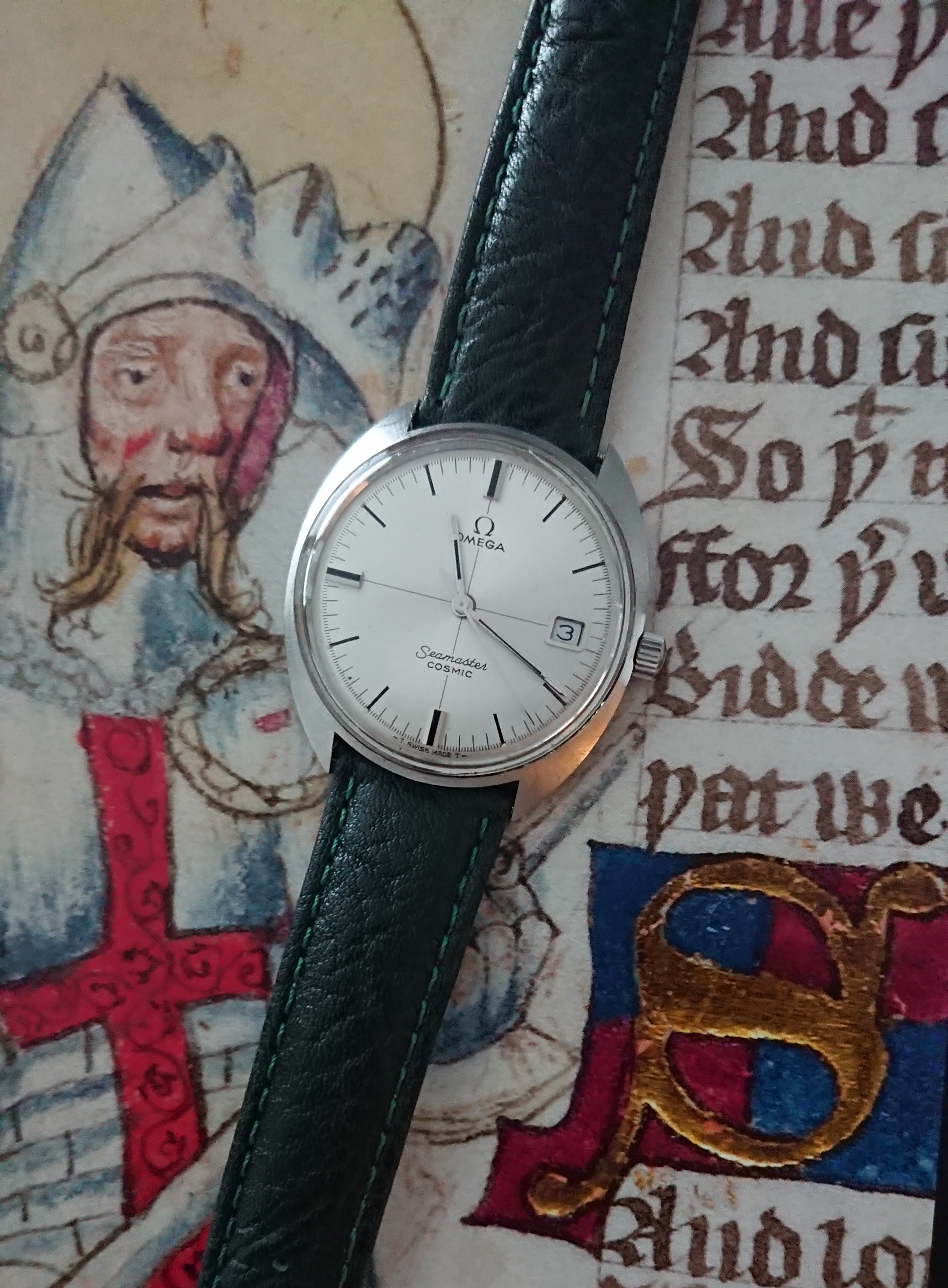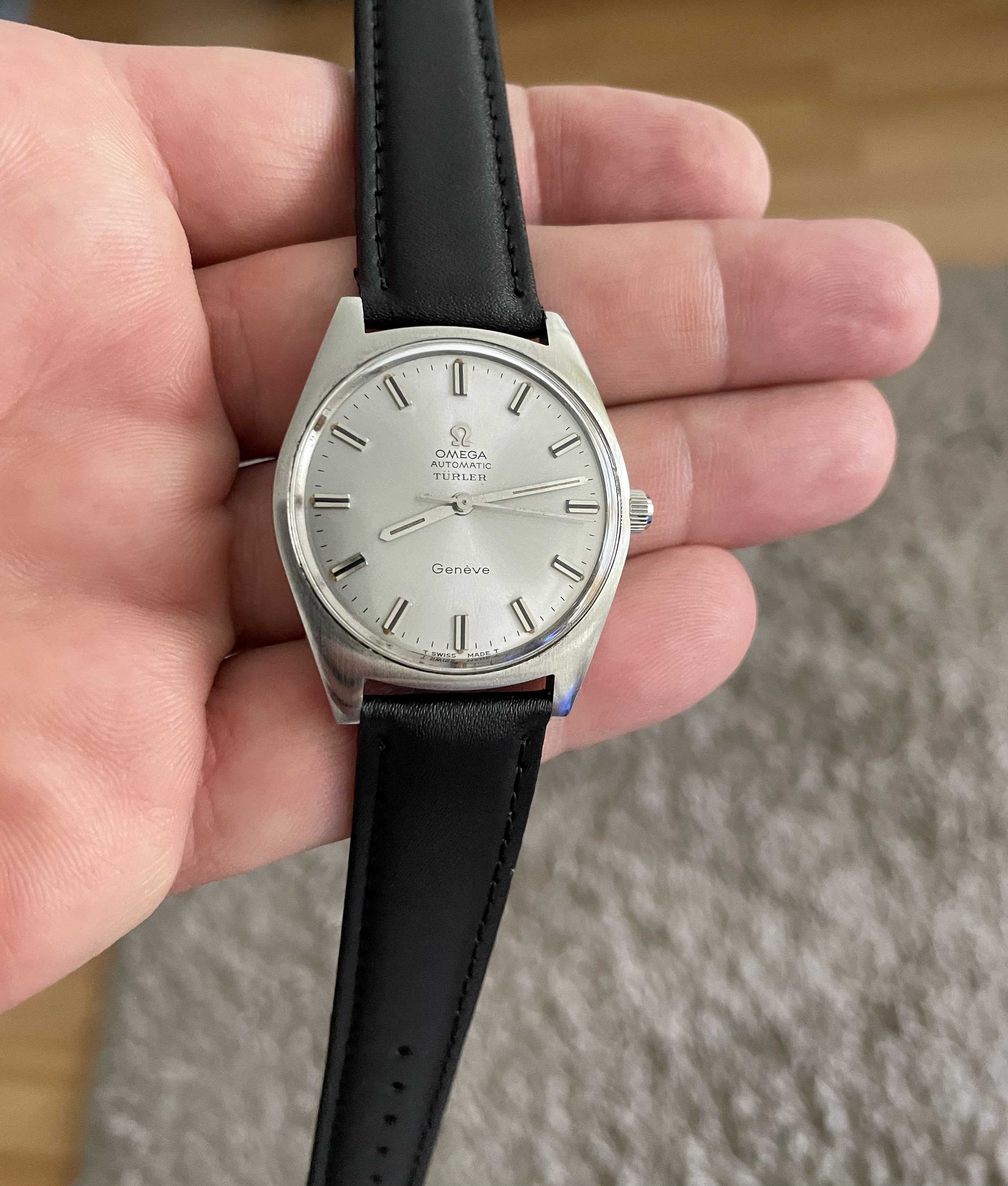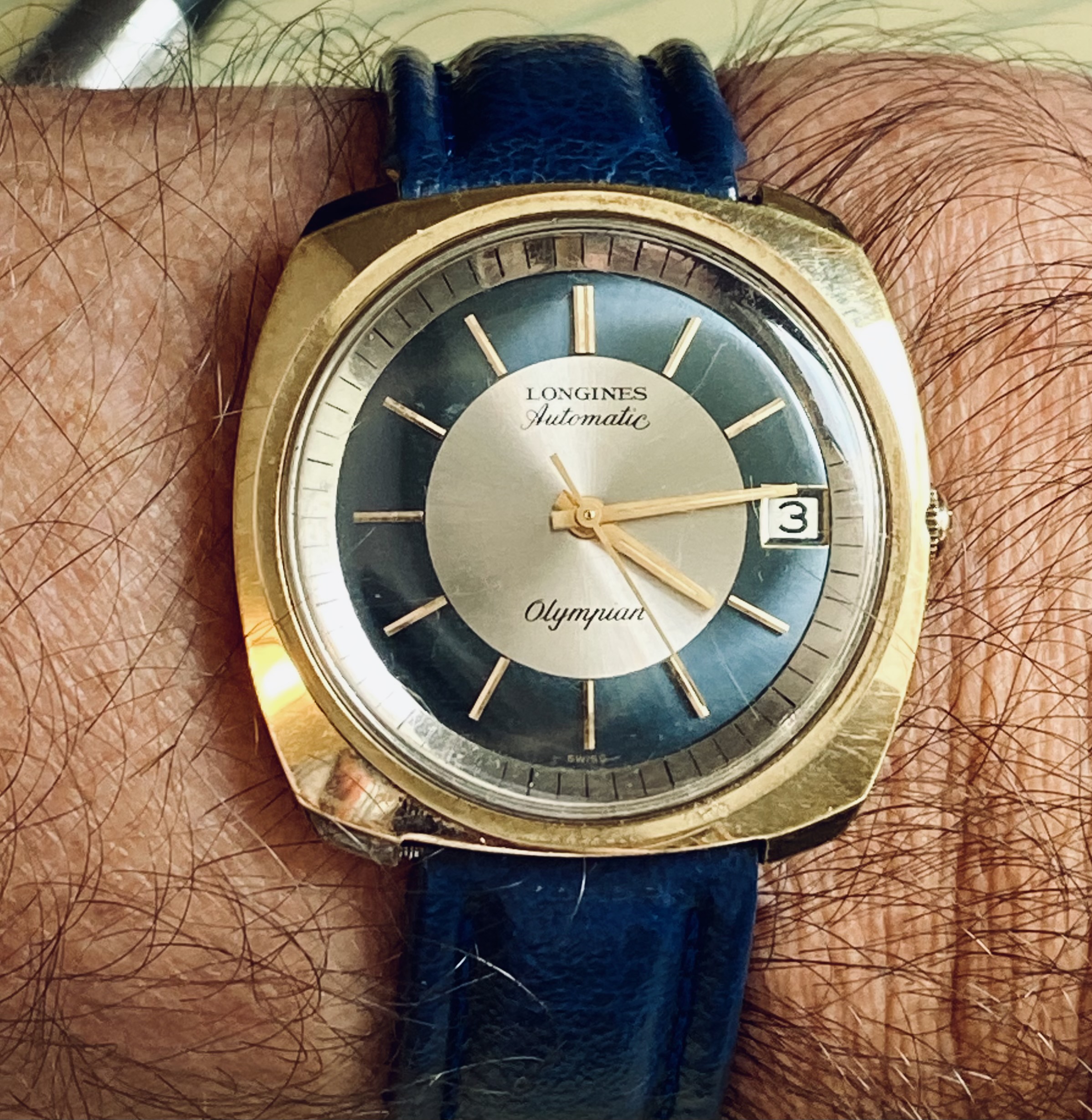 An early 70s Longines Olympian fresh off the mail truck. It needs a little work, but I'm digging it. It runs great, and came on the original (sort of charmingly flimsy, with half the gold plating flaked off) signed bracelet, which I enjoyed for a bit, but it's nice to have a strap that brings out the blue of the dial.