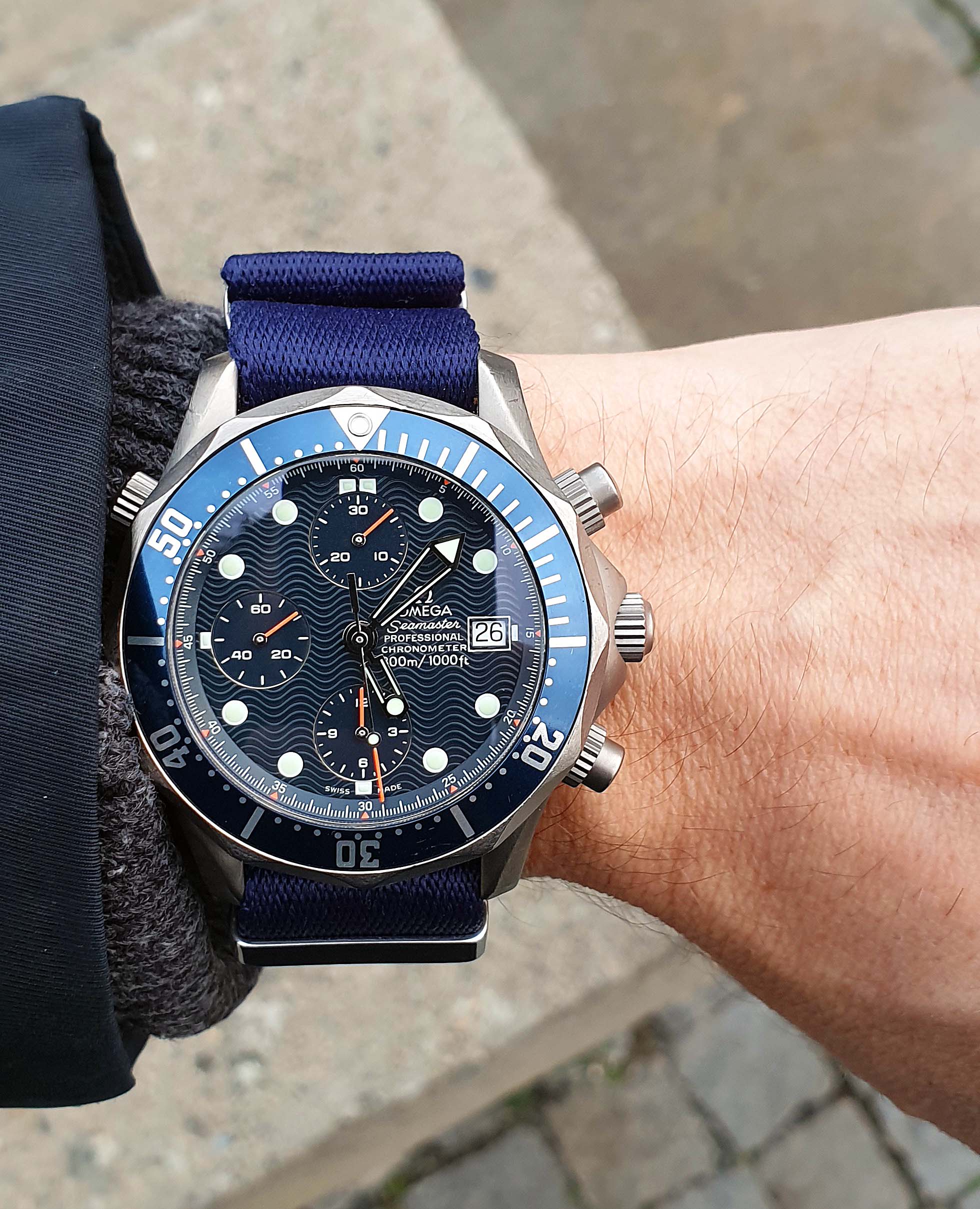 The modern Seamasters never spoke to me, as I am more of a chronometer guy. But when I saw this 2298.80, I had to give it a try, picked it up today and I have to say, it had me at hallo. I instantly regretted not having any appreciation for the wave dial before and in combination with a Titanium case and a chronograph, I suddenly start to understand the late Chuck Maddox.