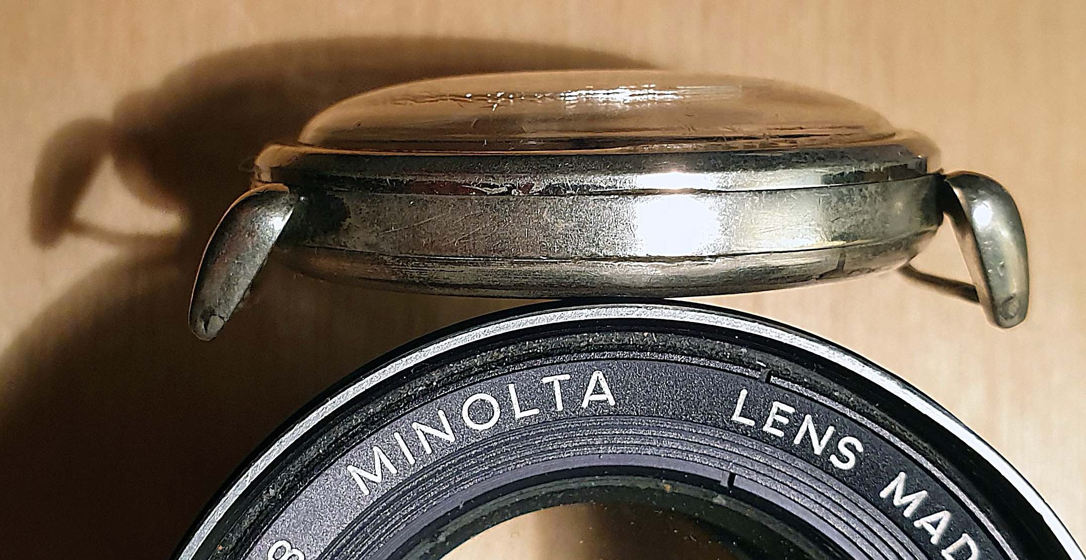 It is a CYMA / Tavannes higher grade movement with 38mm diameter, setting via crown. I am pretty sure that the case and back are solid silver with 43mm diameter. Lugs seem to be original and not added / soldered on later, width is 20-21mm. There are those ||//\\ marks on the case, but no hallmarks / branding that I found o far. The dial (gilt?) is in good (very good, except for the little, hardly visible chip in the middle of the subdial) condition and has turned into a very nice, deep and uneven brown. The main hands seem to be made of silver as well and are heavily oxidized.