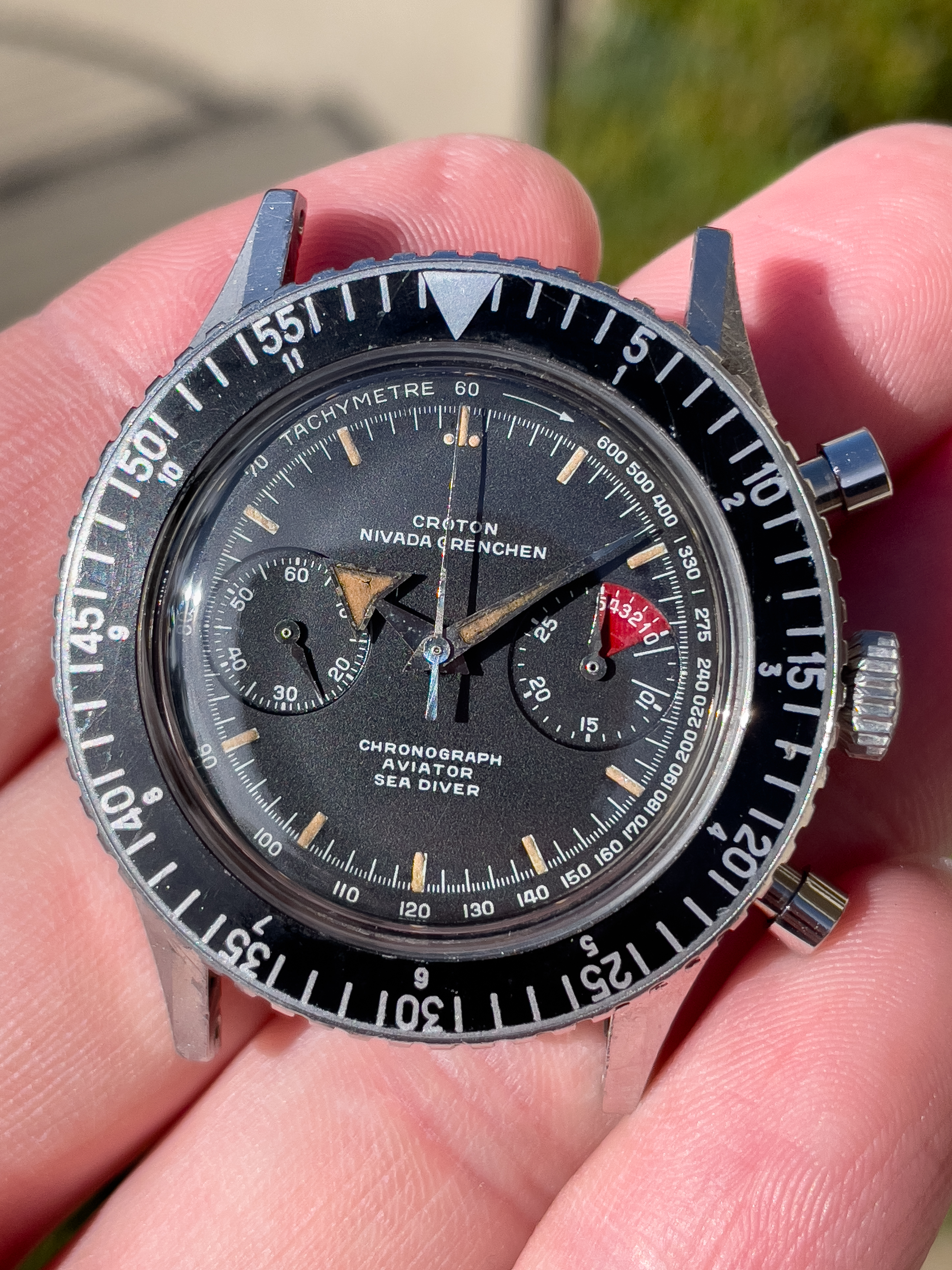 Just arrived today, a gorgeous Titus Calypsomatic 7986 with a stunning dial, beautifully faded bezel, original big crown, and lovely caseback. A fun little detail is the date rotates between red for even numbers and a navy blue for odd. The scratch between 4 & 5 is on the crystal and not the dial.