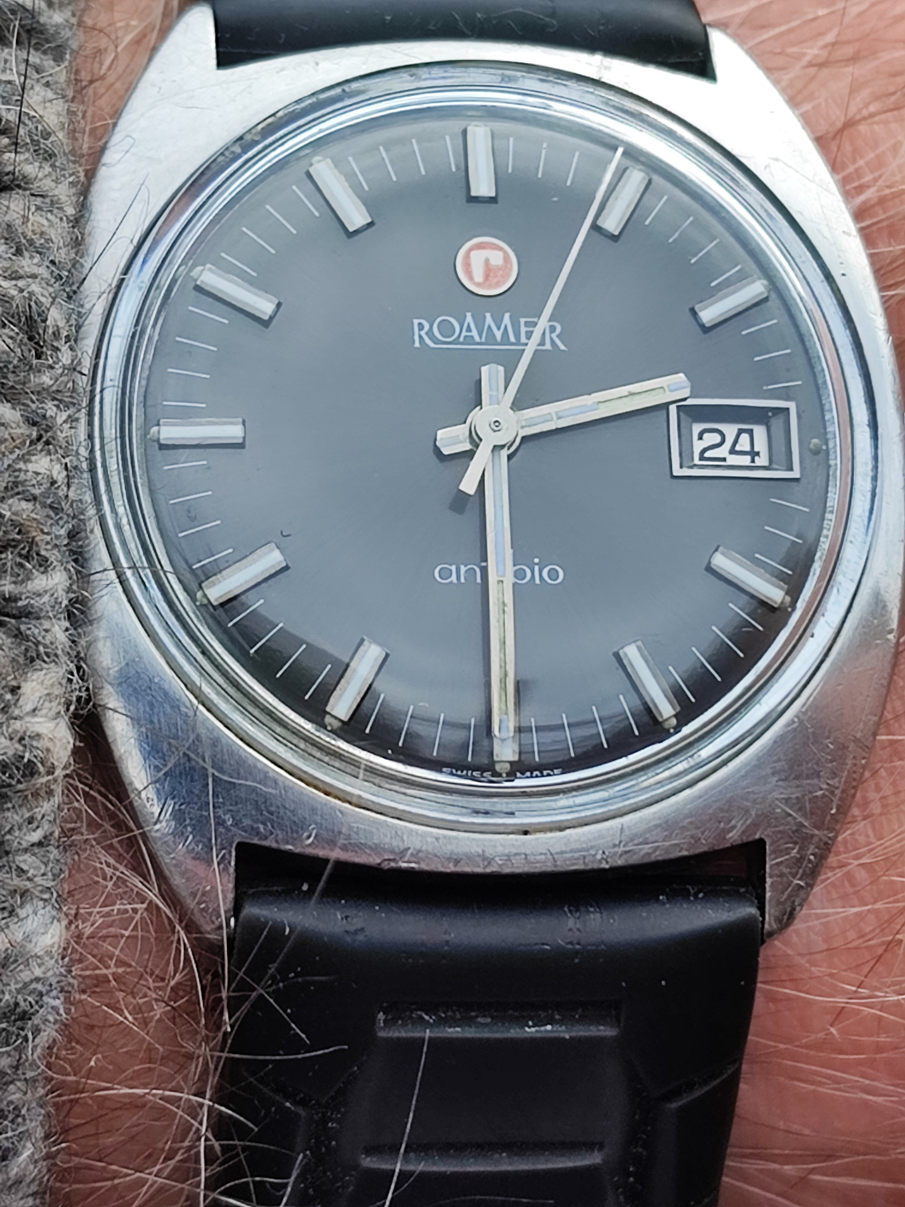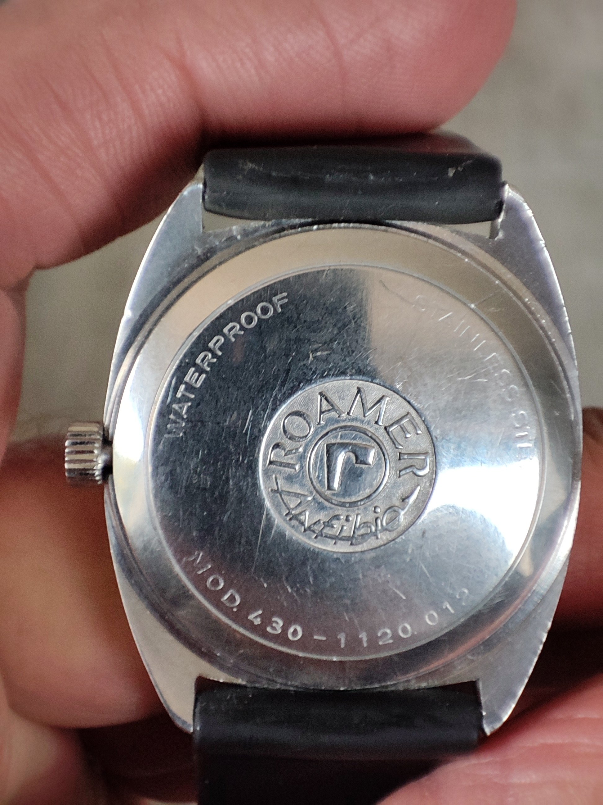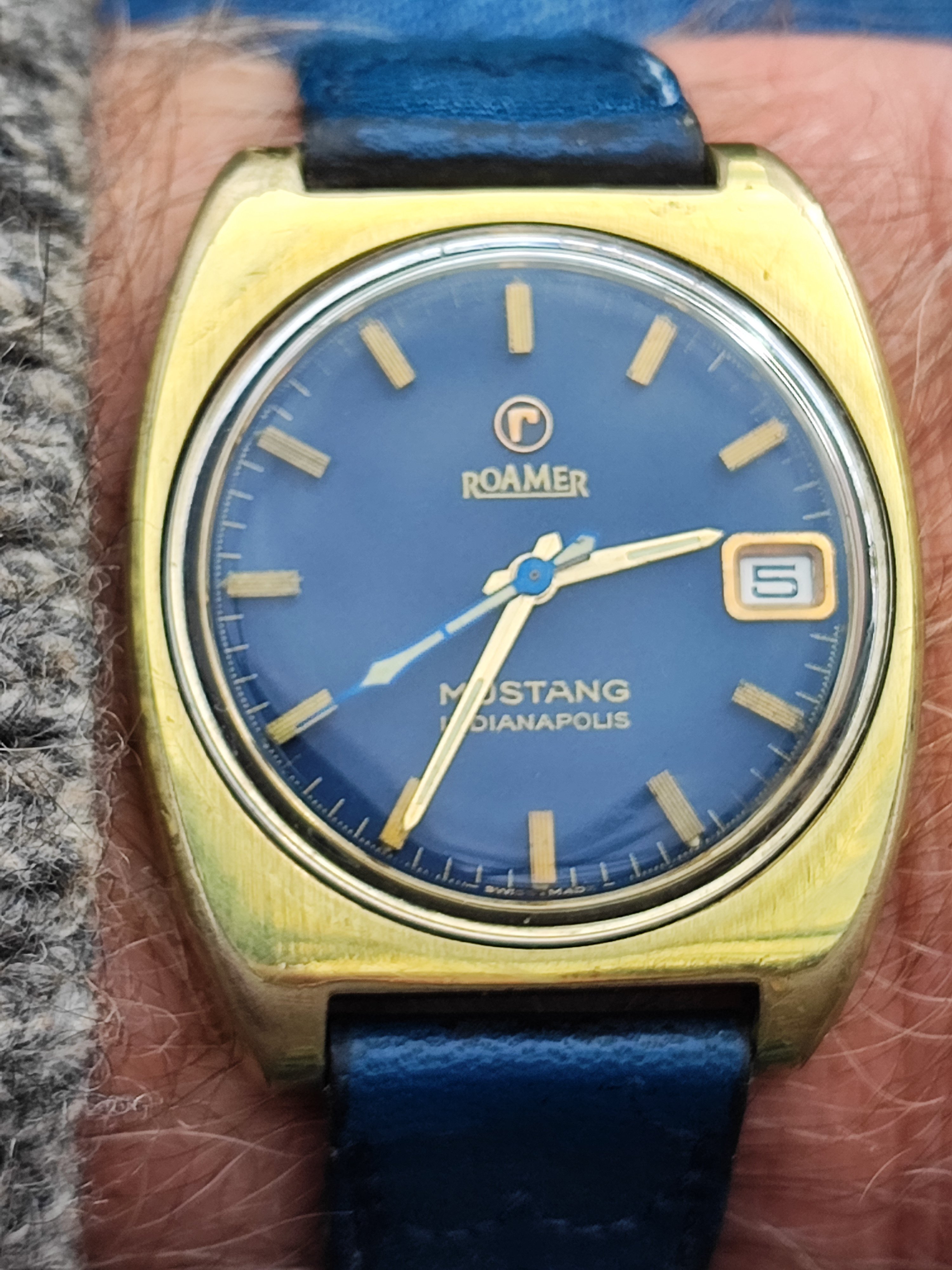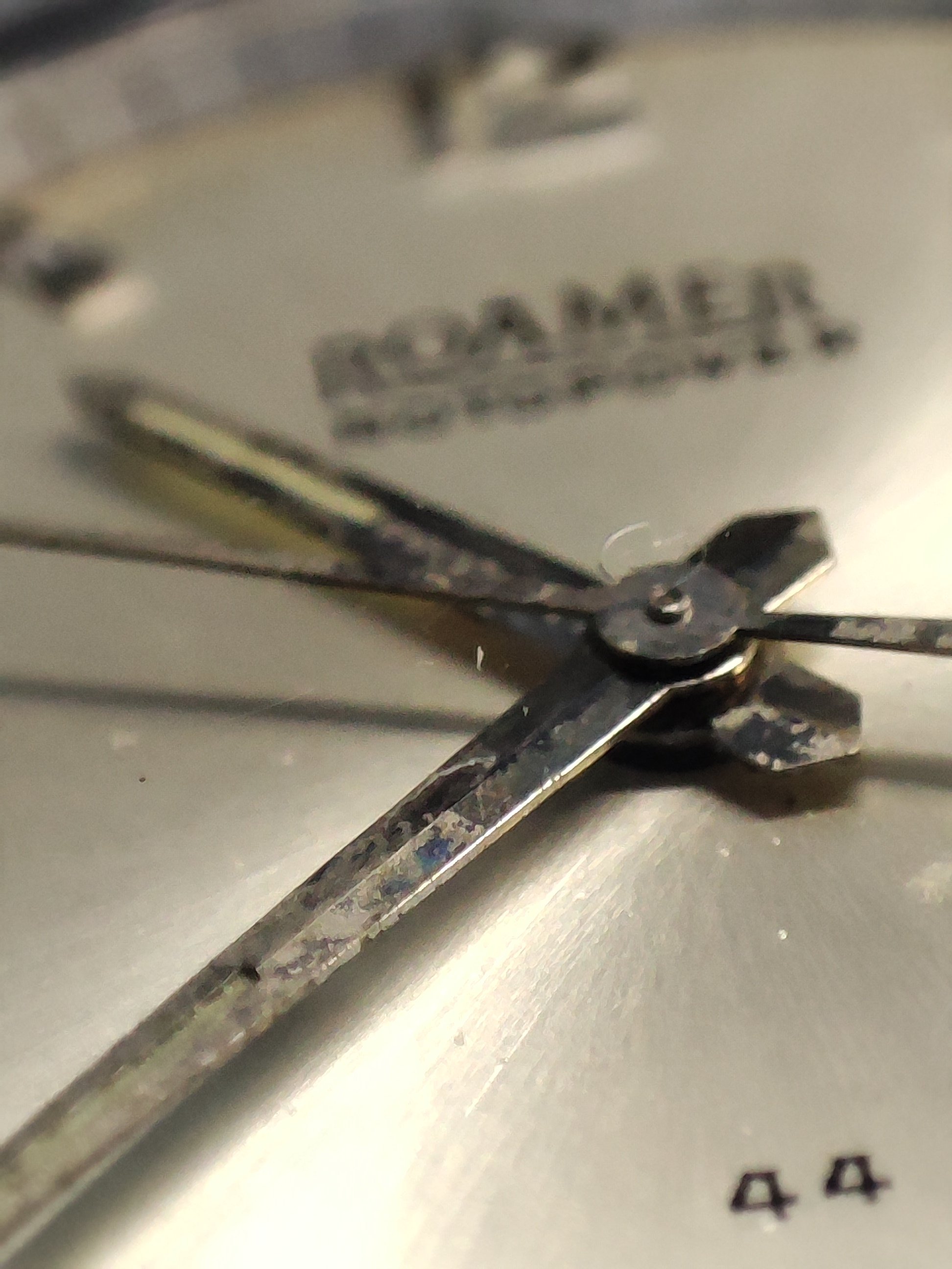 Roamer Mustang Indianapolis watches of this reference don't have luminous hands at all so they have been changed out, definitely the hour and minute hands are Roamer but that critical to the process of photographic developing second hand I am not so sure but it is a big luminous hand as befits it usage.