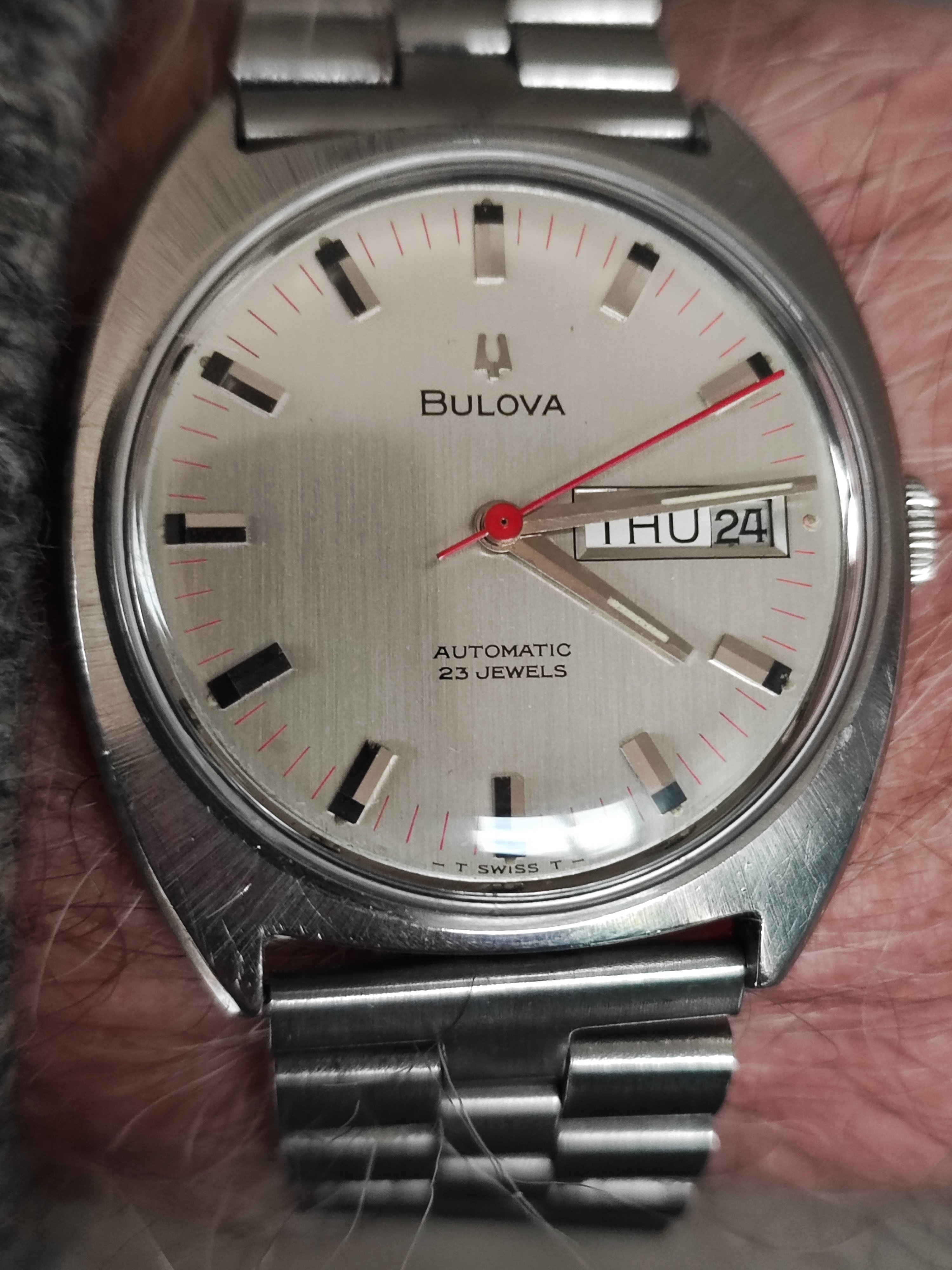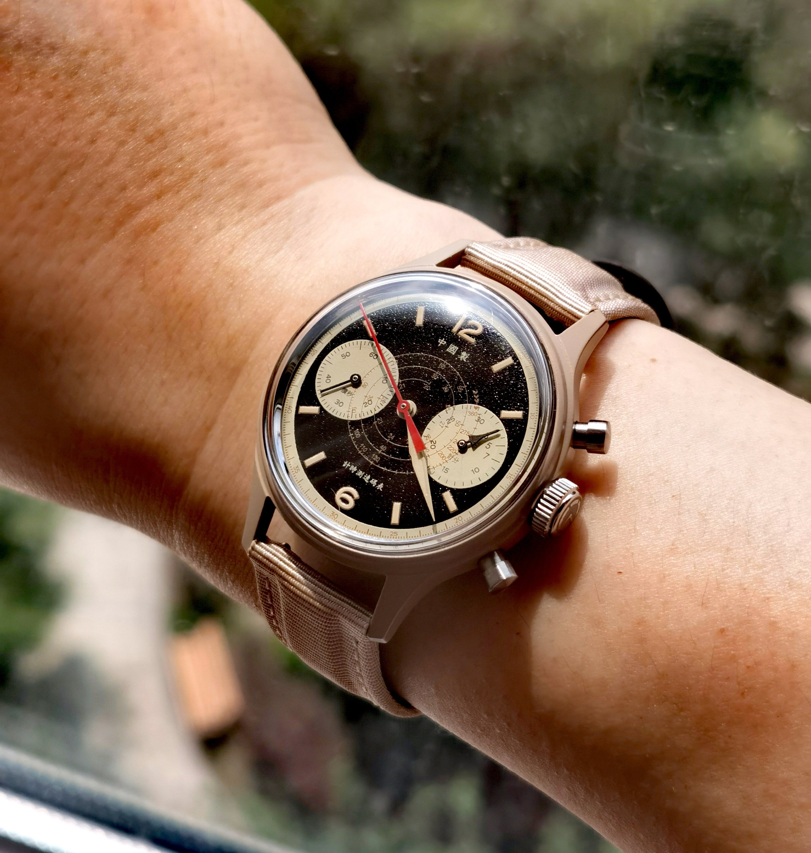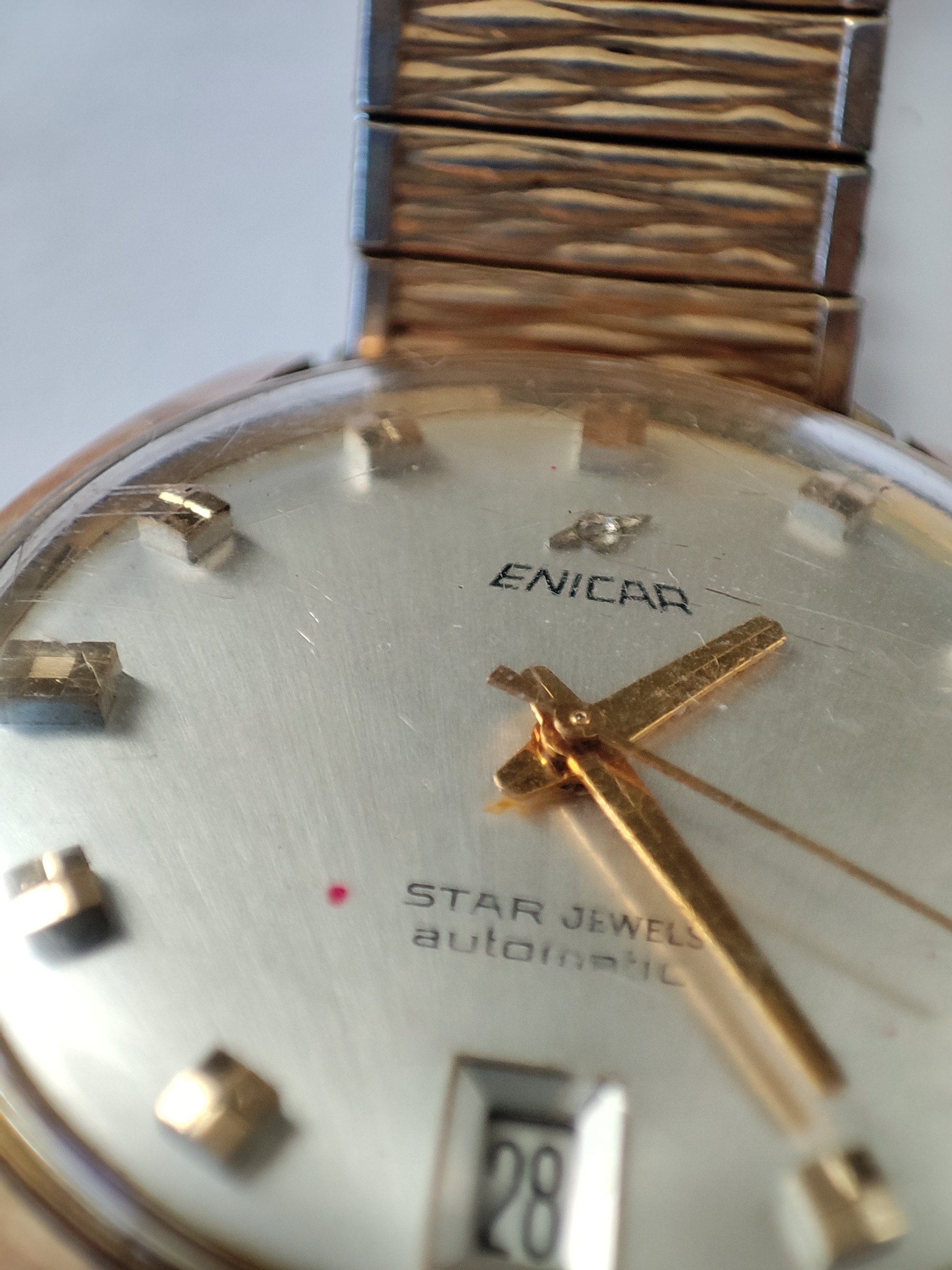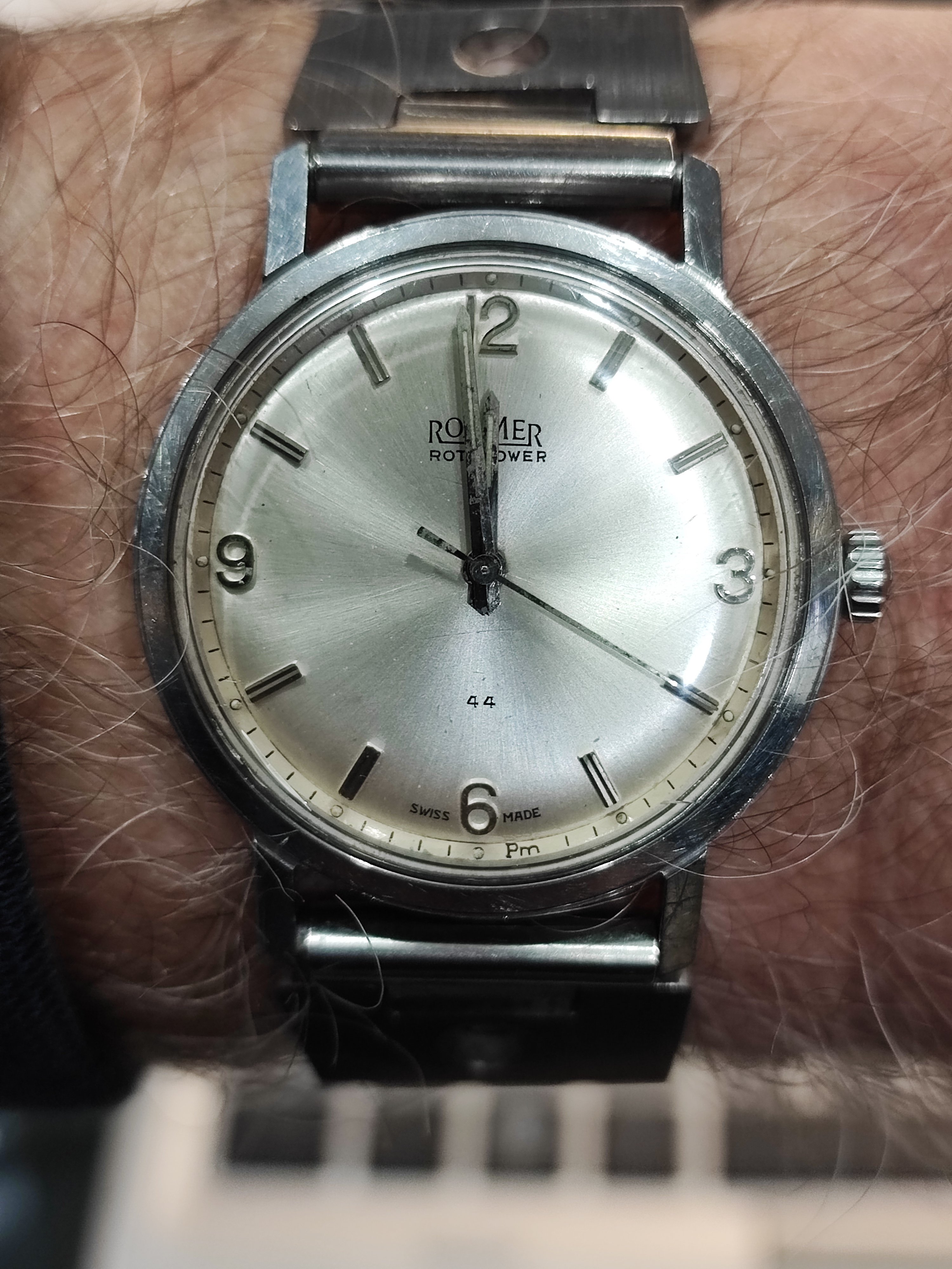 Roamer Mustang Indianapolis watches of this reference don't have luminous hands at all so they have been changed out, definitely the hour and minute hands are Roamer but that critical to the process of photographic developing second hand I am not so sure but it is a big luminous hand as befits it usage.